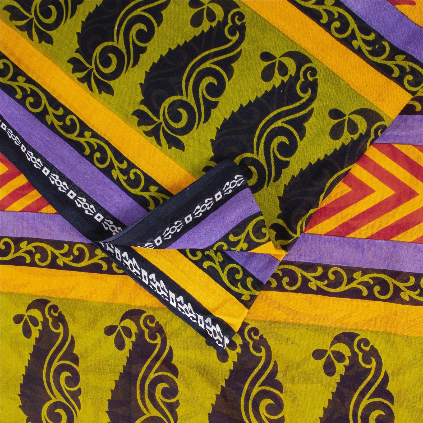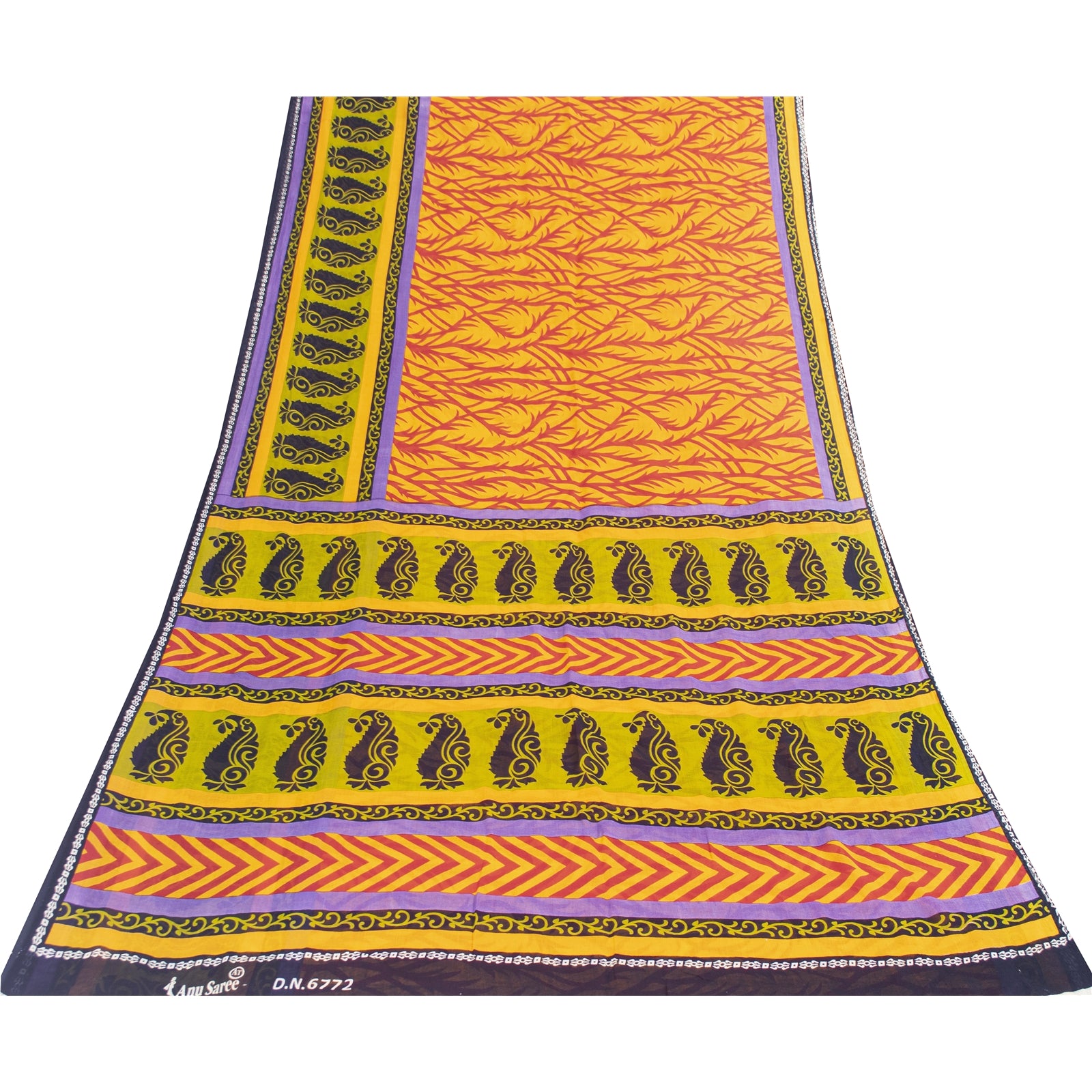 Sanskriti Vintage Sarees Indian Yellow Pure Cotton Print Sari 5+yd Craft Fabric