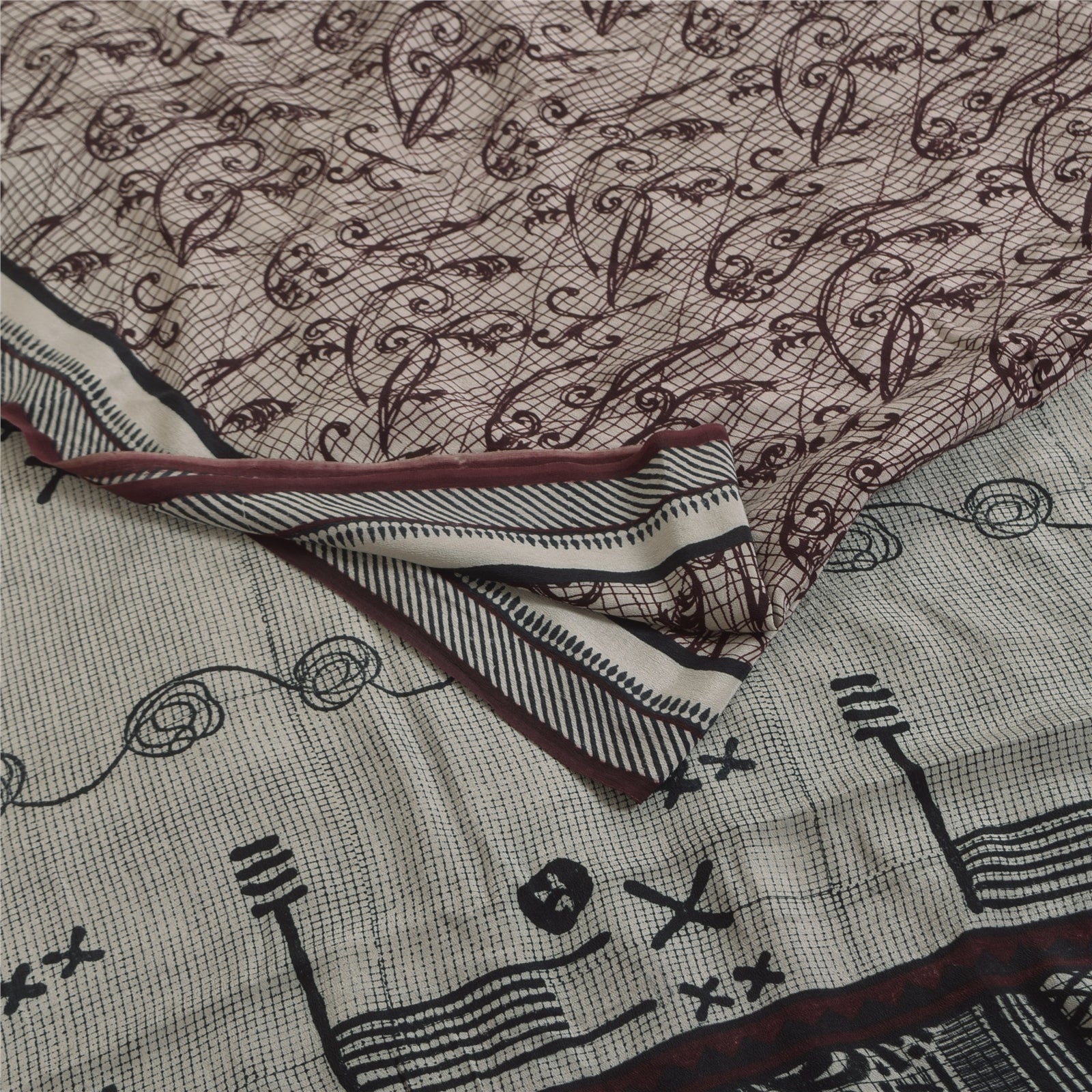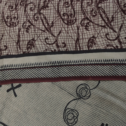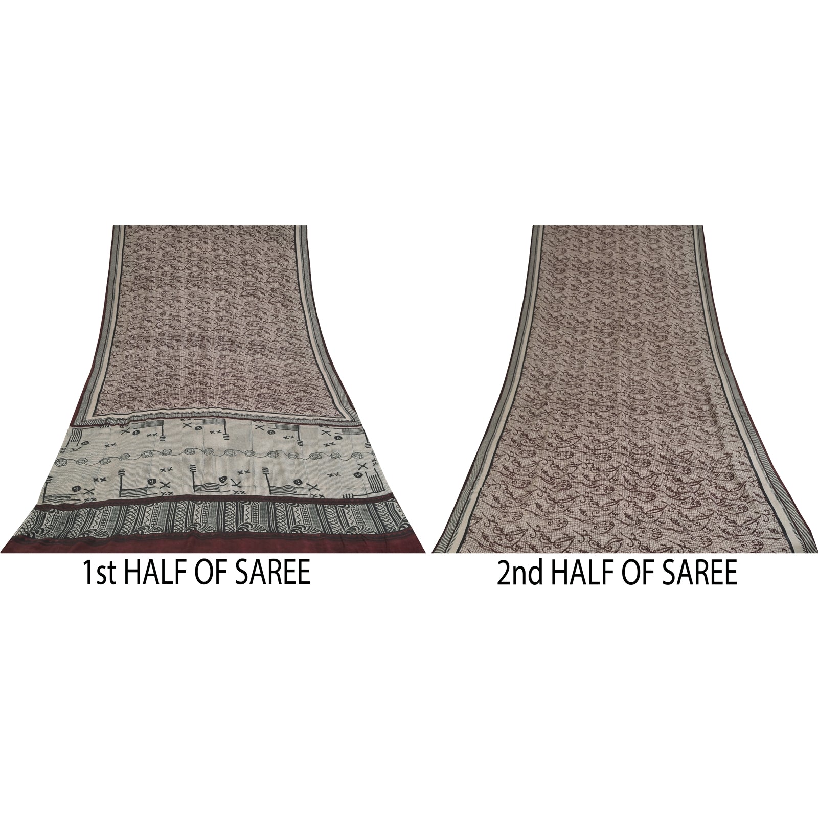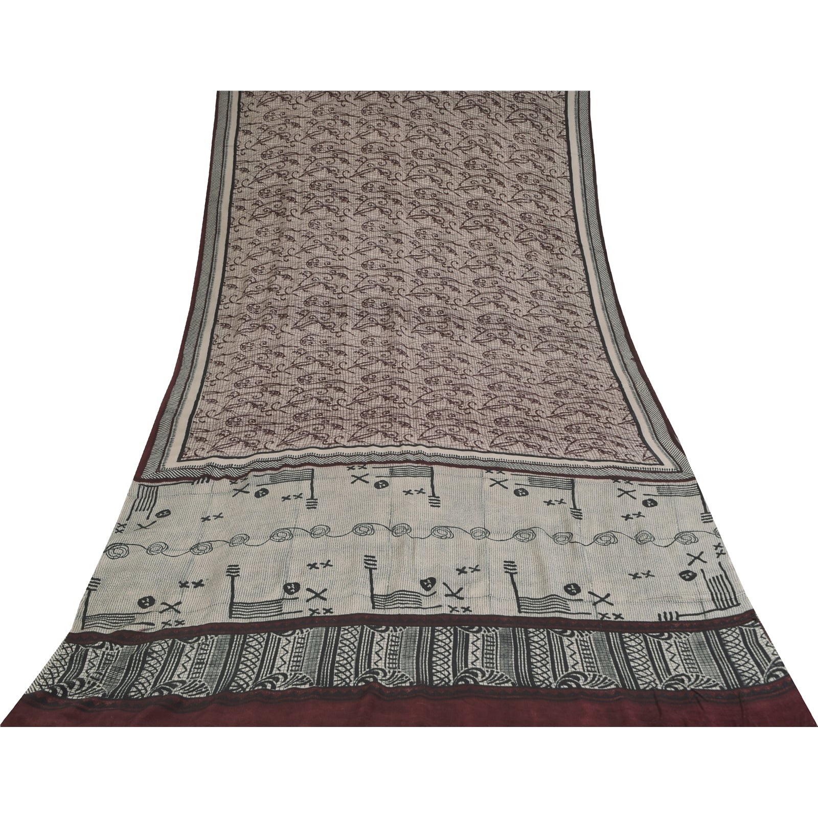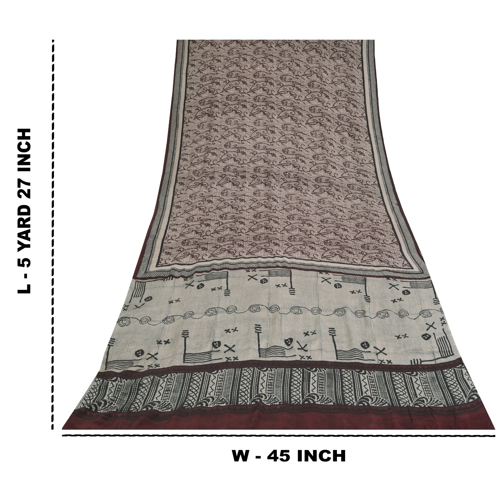 Sanskriti Vintage Sarees Ivory & Brown Pure Crepe Printed Sari 5+yd Craft Fabric