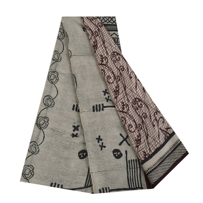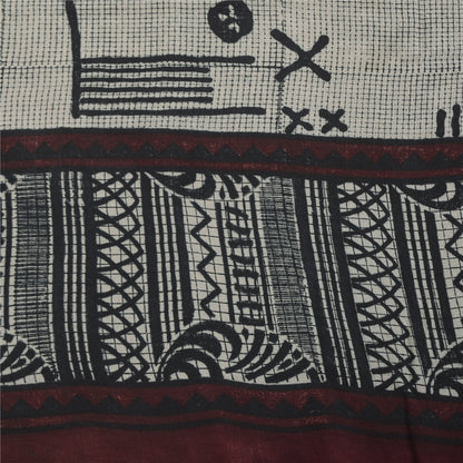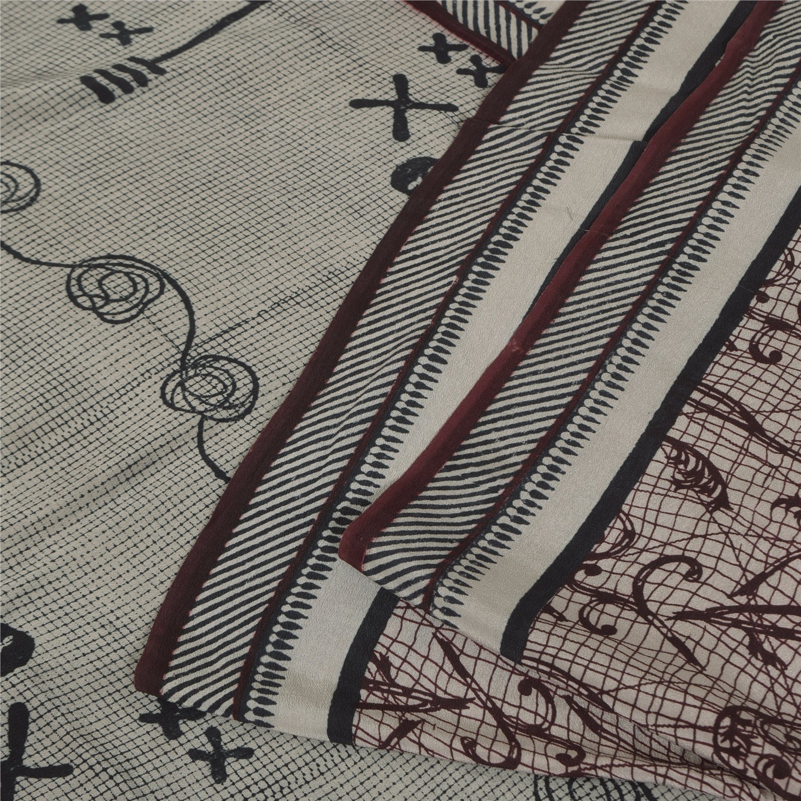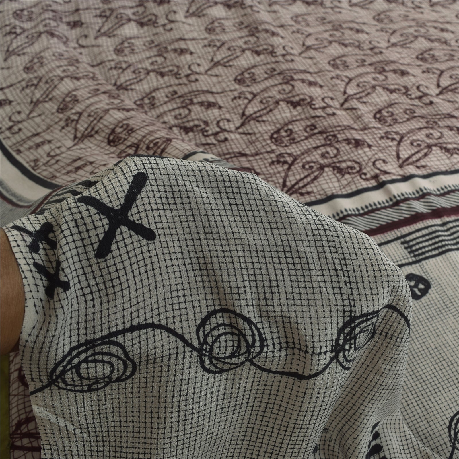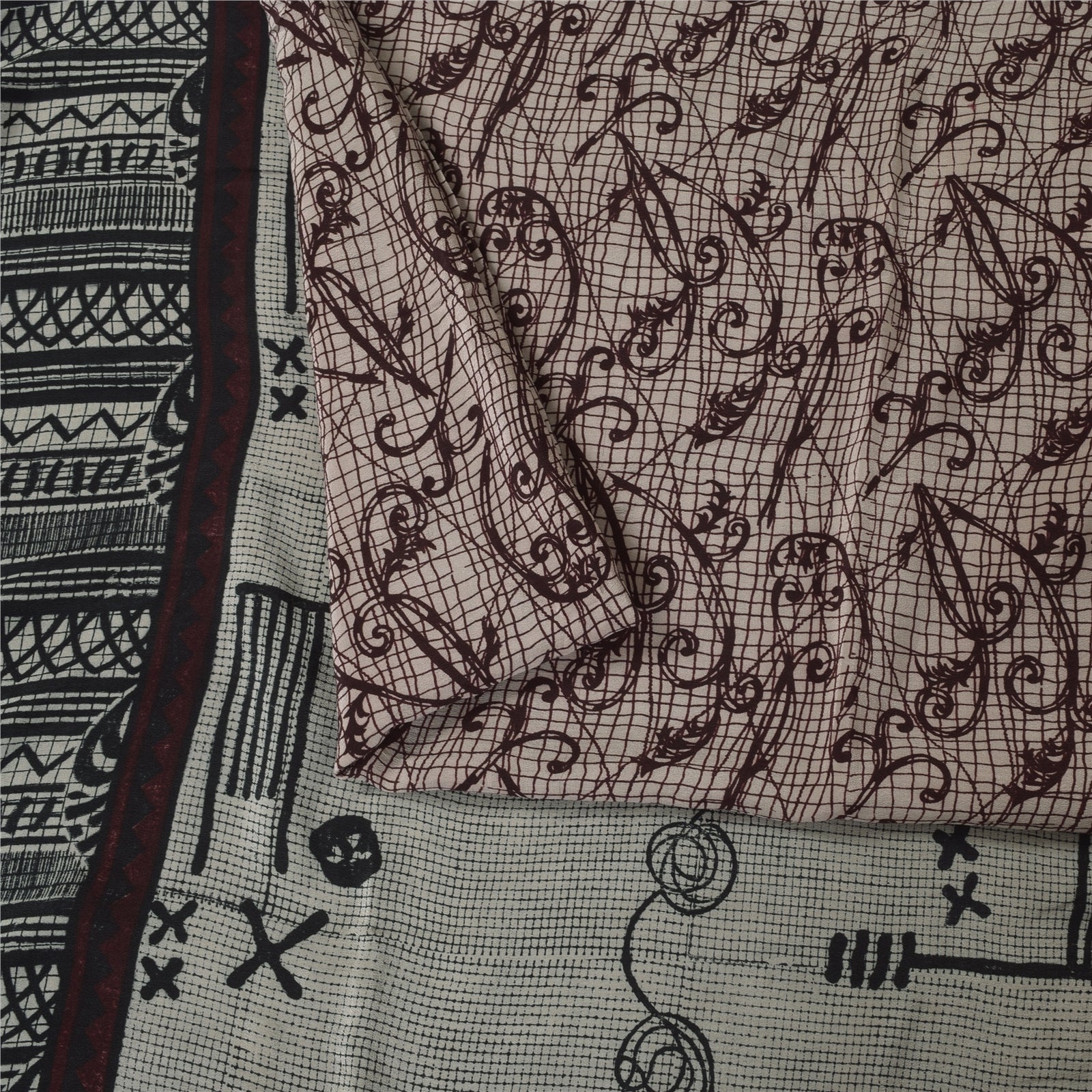 Sanskriti Vintage Sarees Ivory & Brown Pure Crepe Printed Sari 5+yd Craft Fabric