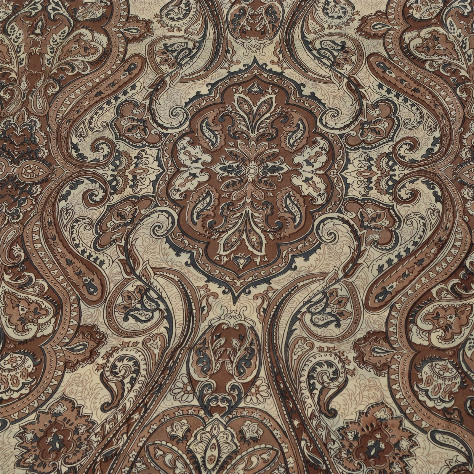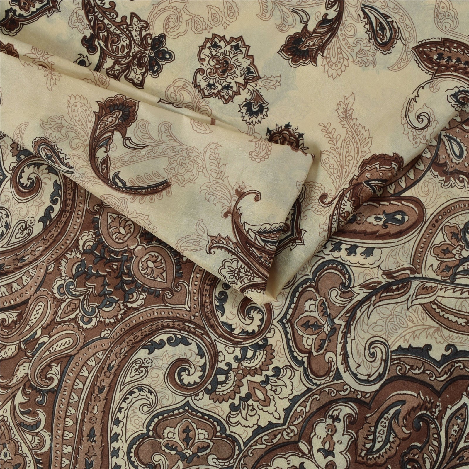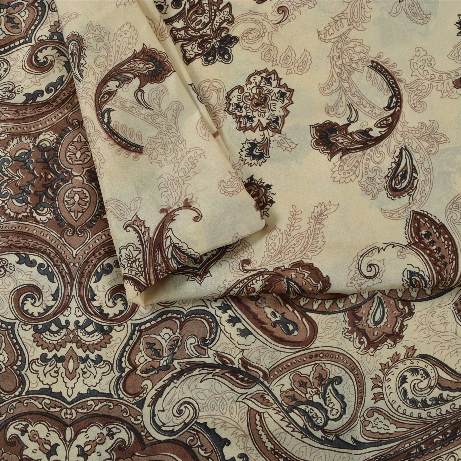 Sanskriti Vintage Sarees Ivory & Brown Pure Silk Printed Sari 5+yd Craft Fabric