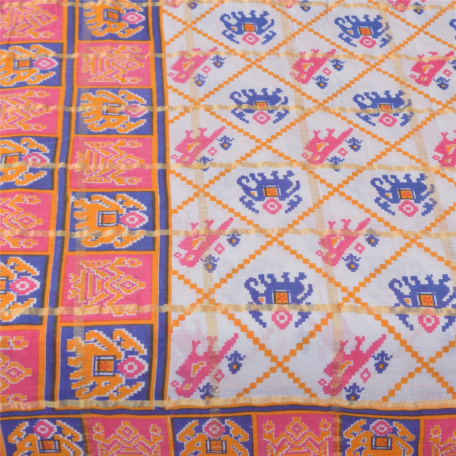 Sanskriti Vintage Sarees Ivory Pure Cotton Patan Patola Printed Sari 5+yd Sustainable Fabric
