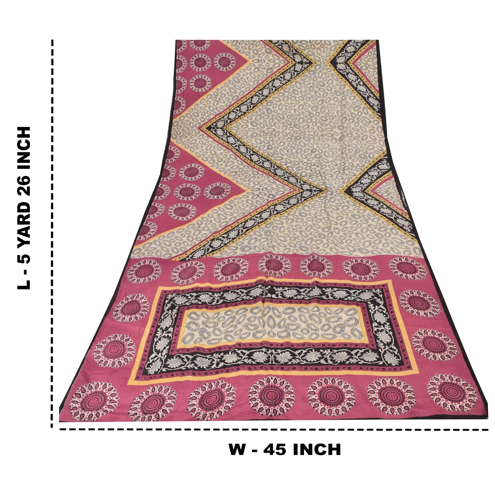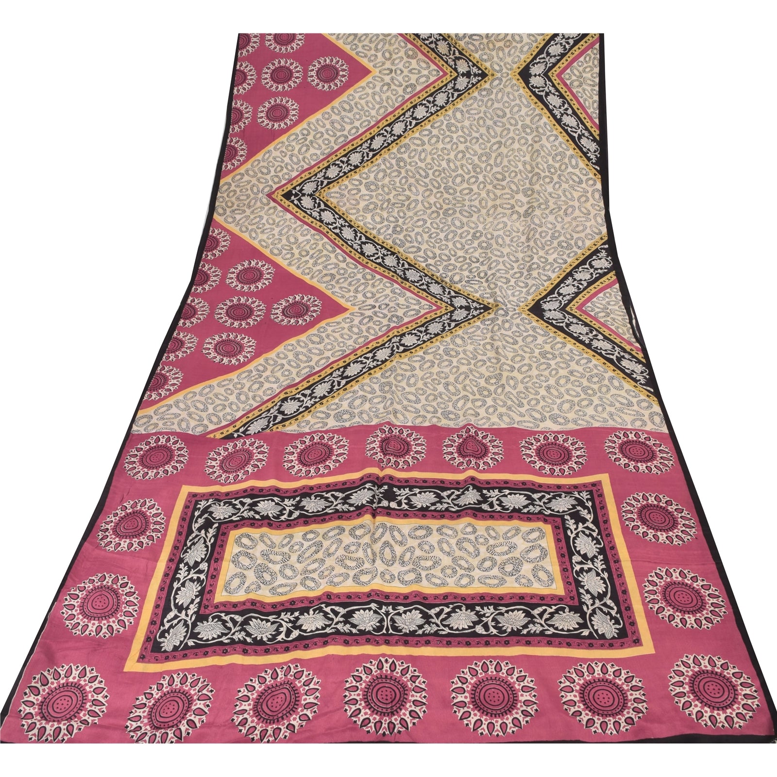 Sanskriti Vintage Sarees Ivory Pure Crepe Silk Printed Sari 5+yd Craft Fabric