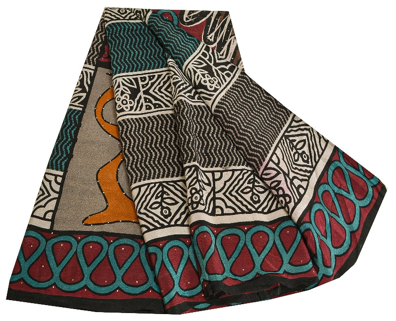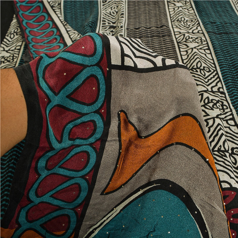 Sanskriti Vintage Sarees Multi Pure Crepe Silk Mukesh Work Printed Sari Sustainable Fabric