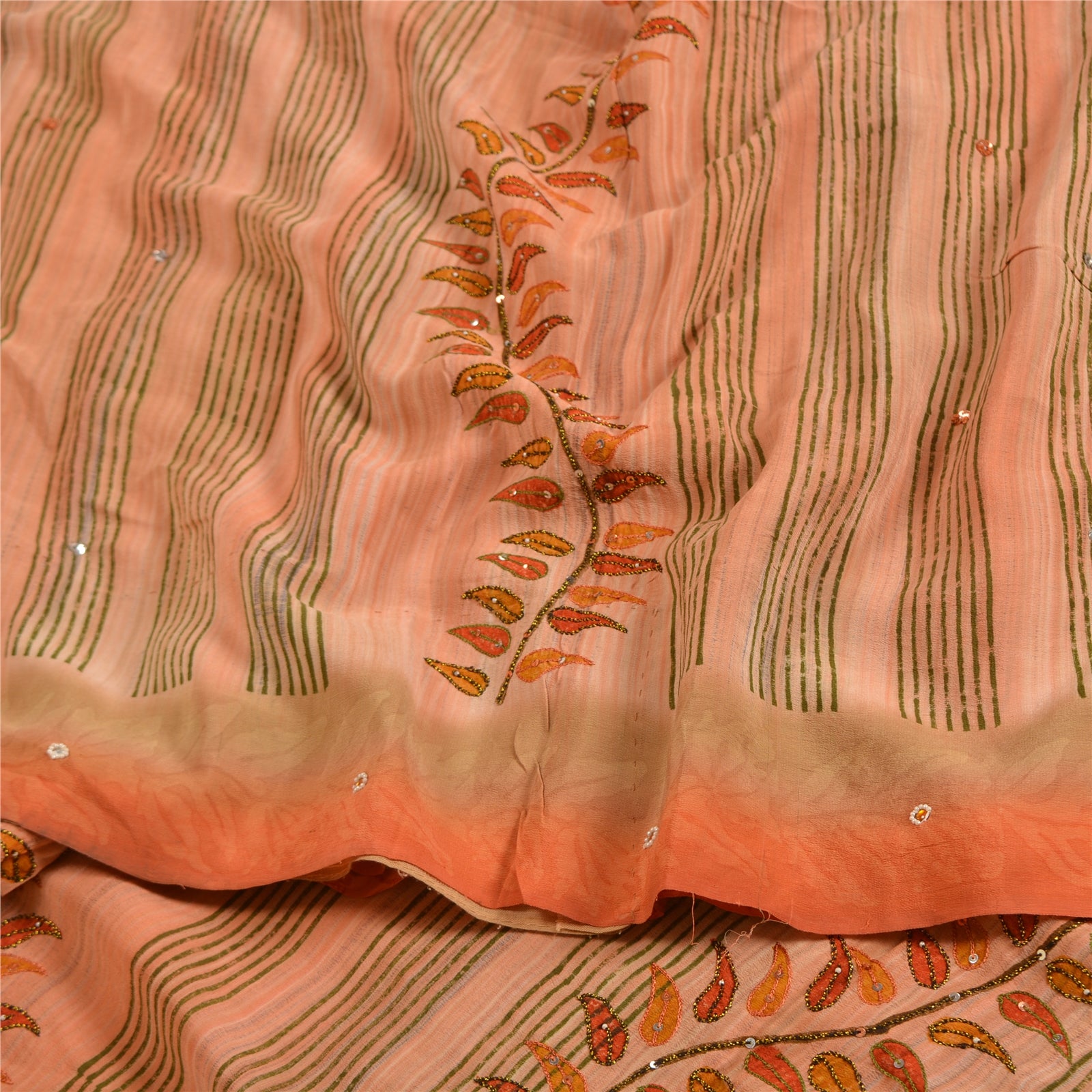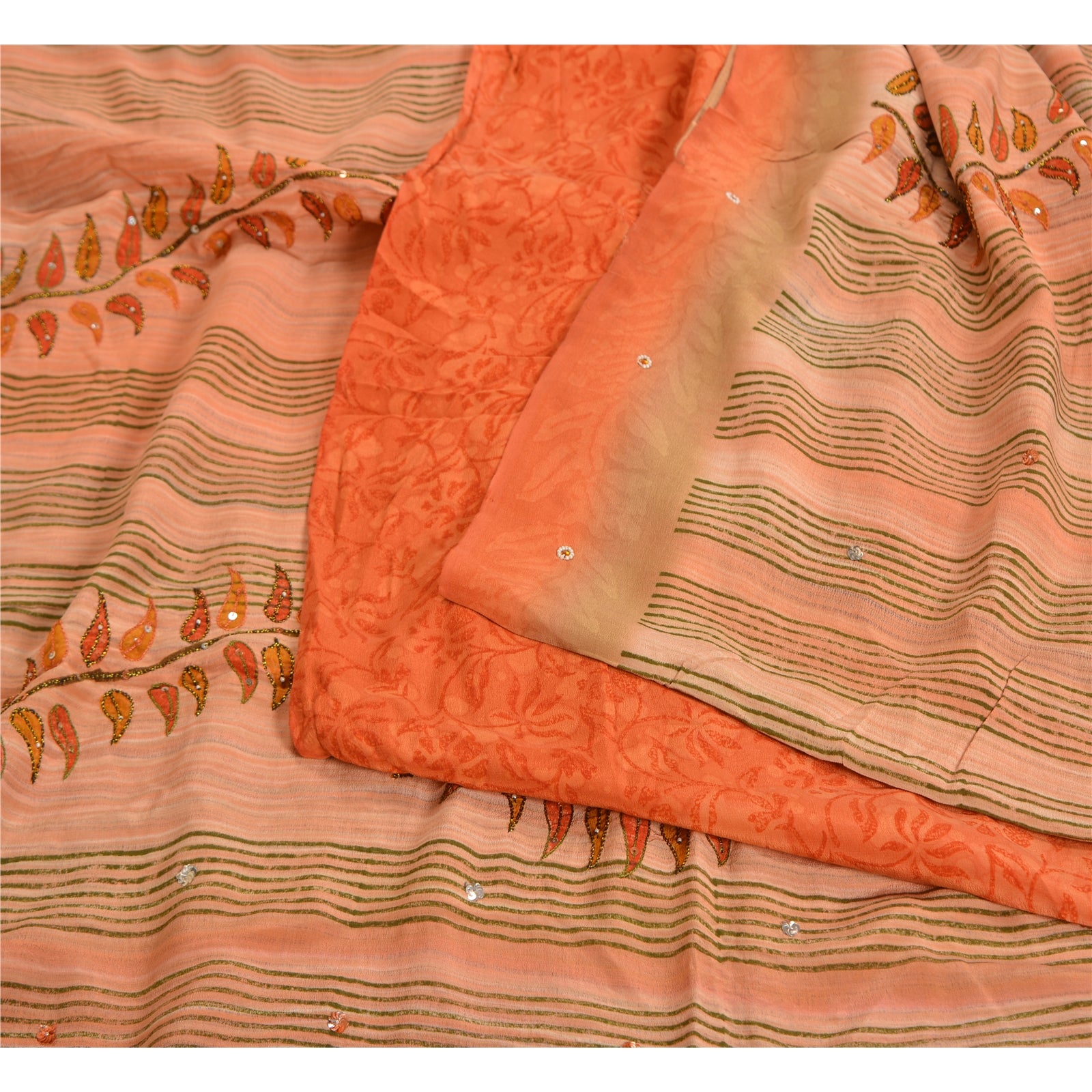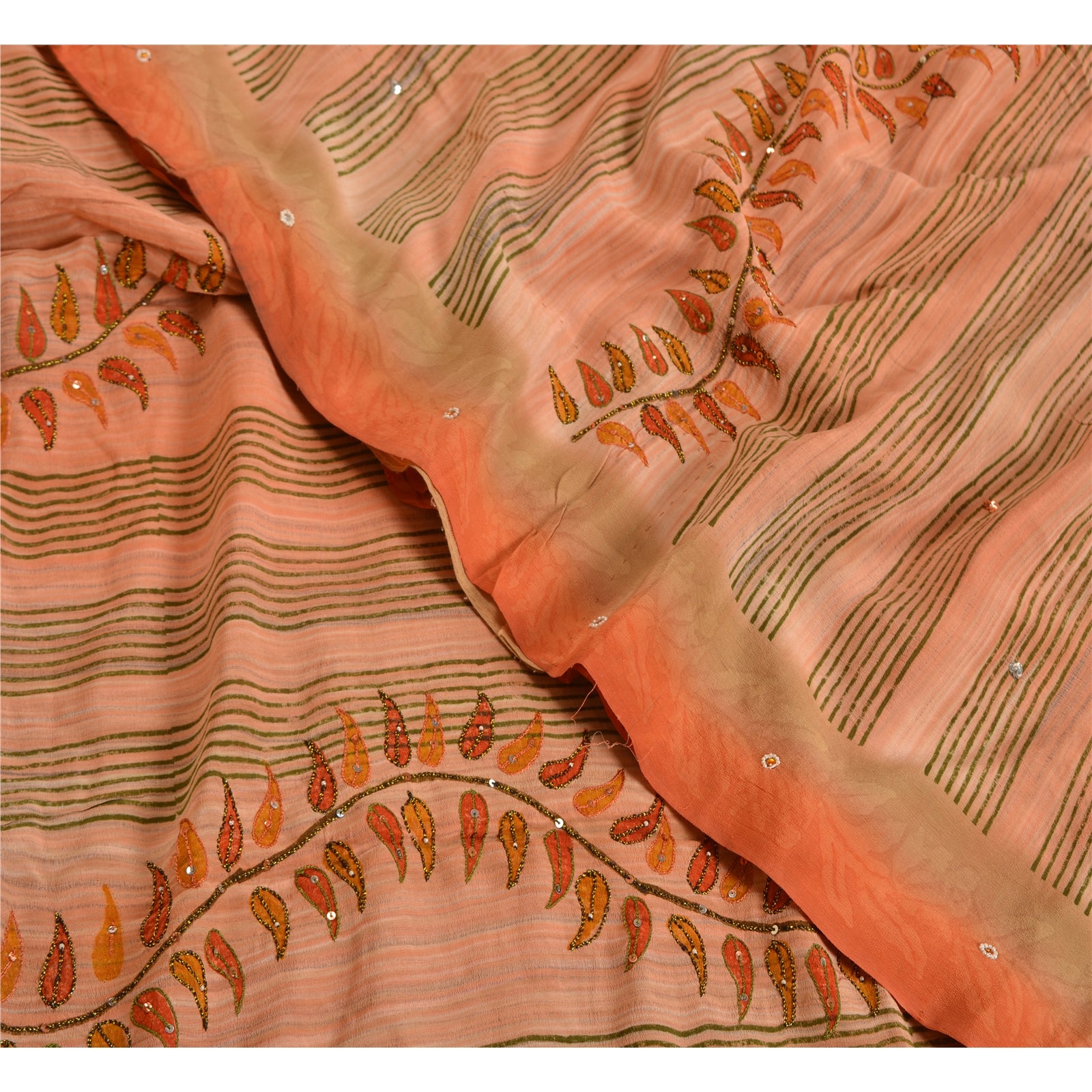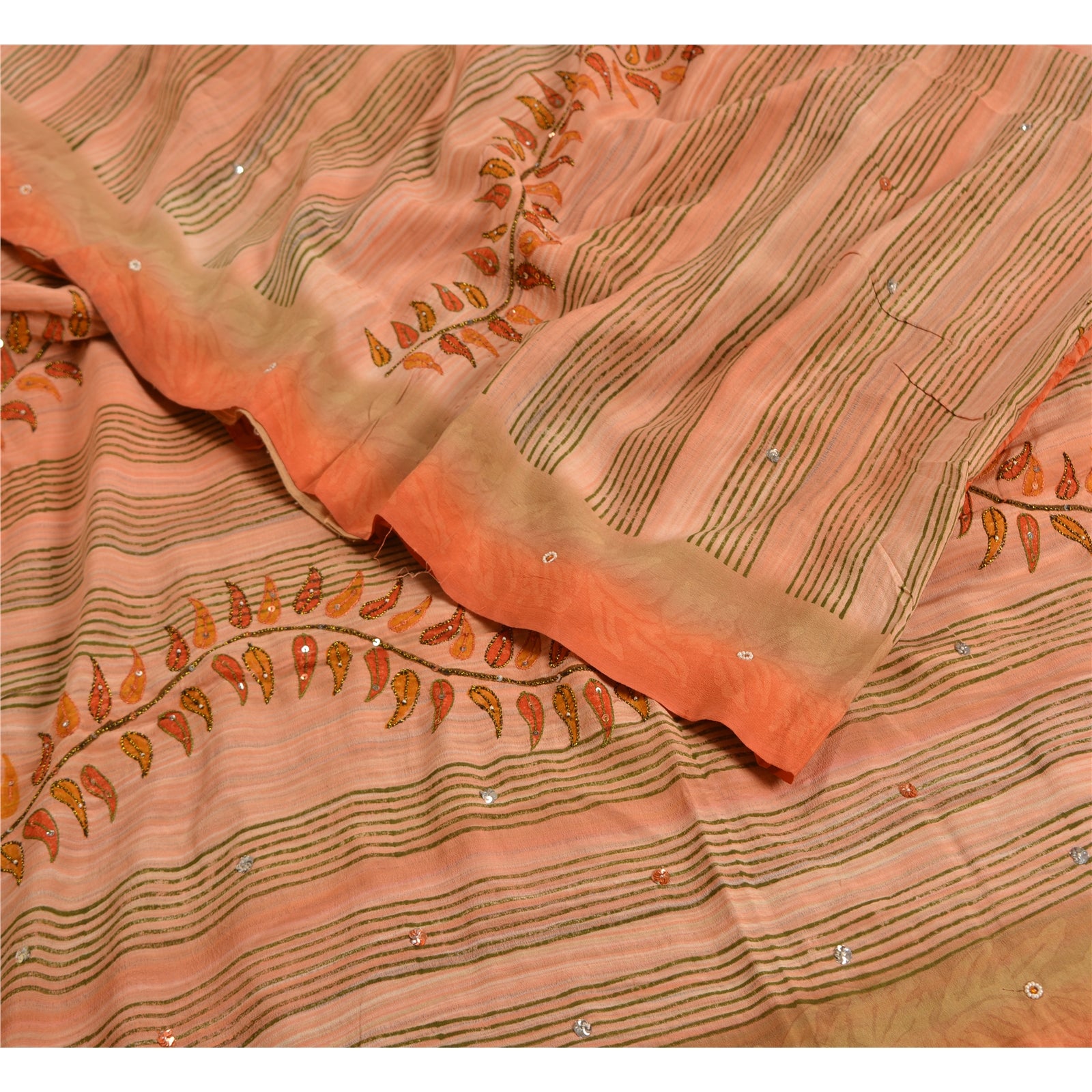 THE ITEM COLOR OR SHADE MAY BE DARKER OR LIGHTER THAN THE PICTURE.' Beautiful peach colored pure crepe silk printed & hand embroidered saree. Pallu & Border has printed floral design with sequins & beaded work. Similar work in center part of saree. What is special about this saree? Fabulous design is really enhancing the beauty of the saree. This unique vintage saree can be used for various crafting ideas even if you don't want to use it as a sari. Design a dress, use it as window,dressing, upholstery, sarongs, throw, dress making and table linen much more. Let your creative juices flow and use this decorated Sustainable Fabric in multiple fashion. International buyers please note: Import duties, taxes, and charges are not included in the item price or postage cost. These charges are the buyer's responsibility. Please check with your country's customs office to determine what these additional costs will be prior to bidding or buying.Buyer will pay custom duty/tax. It is calculated and charged differently by every country. As a seller I do not have any control over it.VAT or sales tax is calculated by the platform at the time of checkout. Customs charge is payable at the time of delivery.