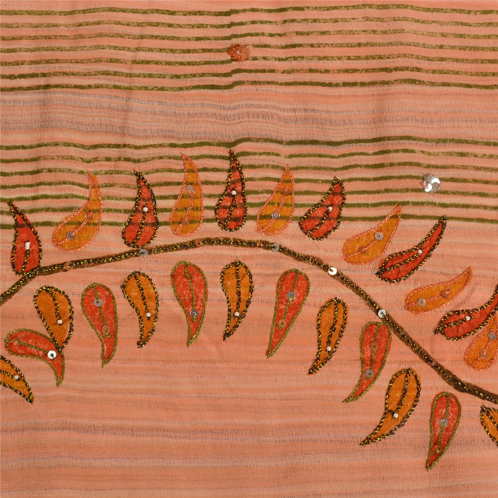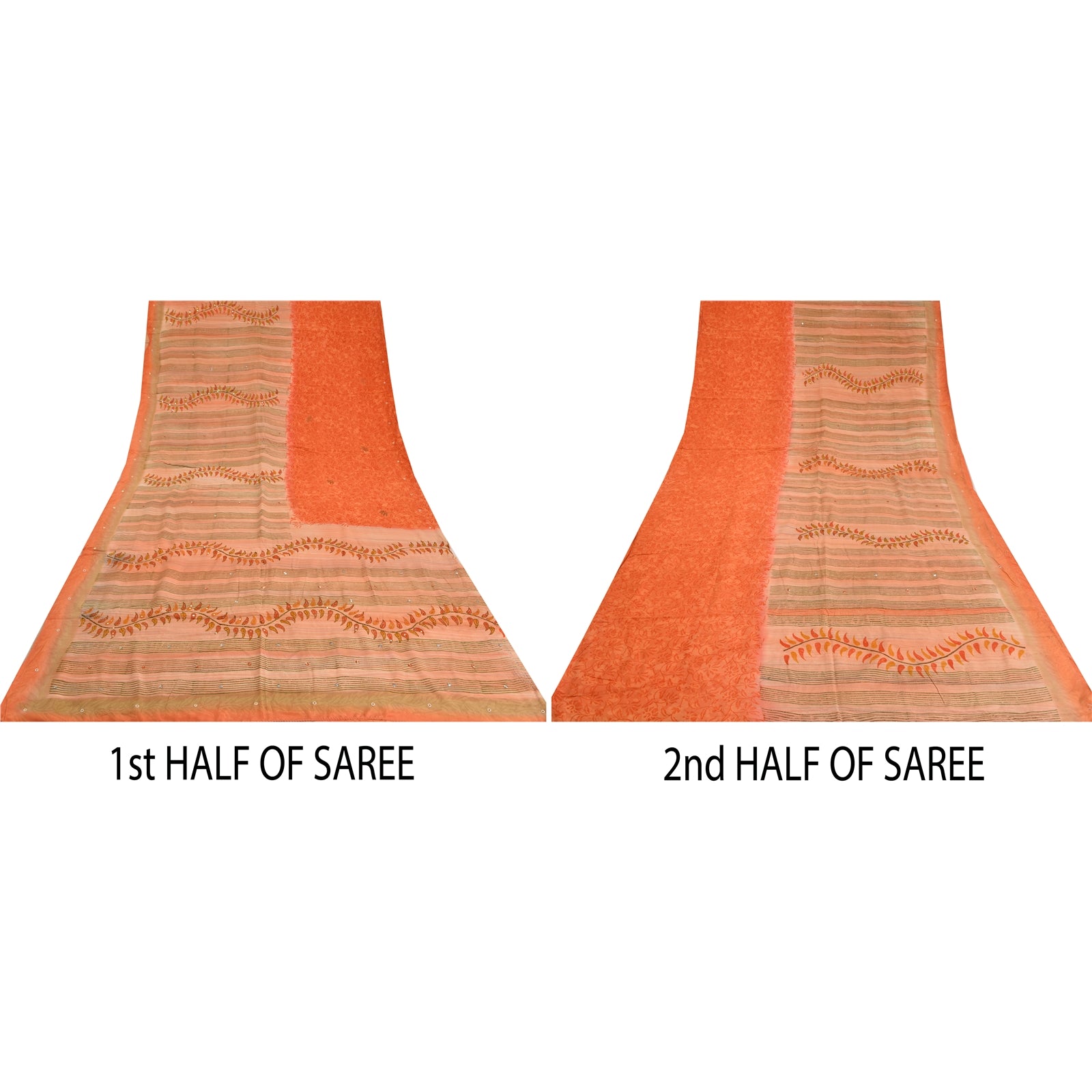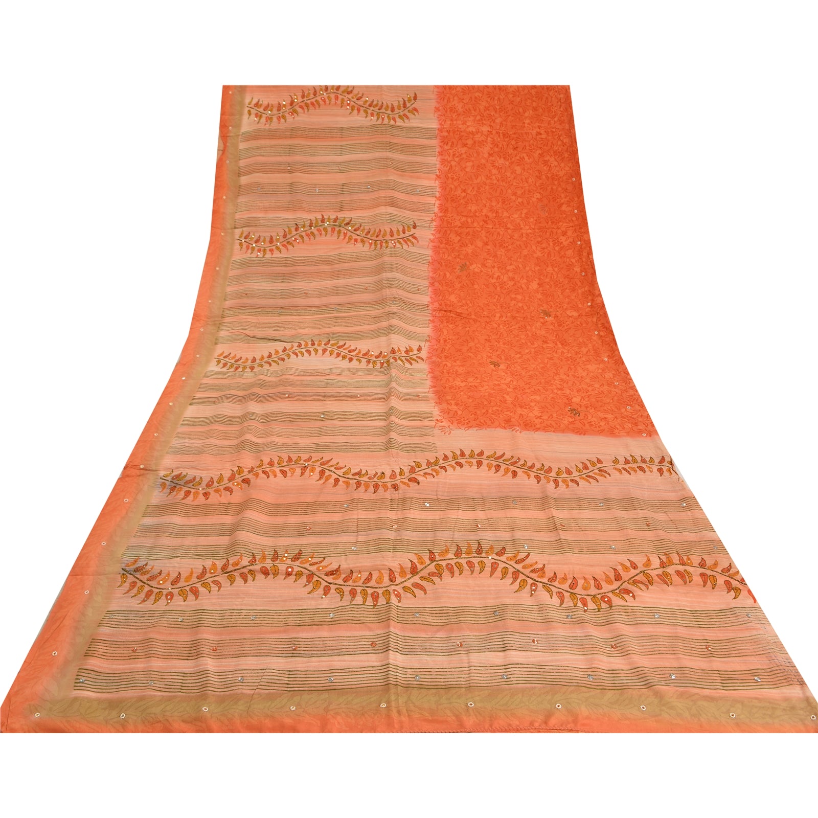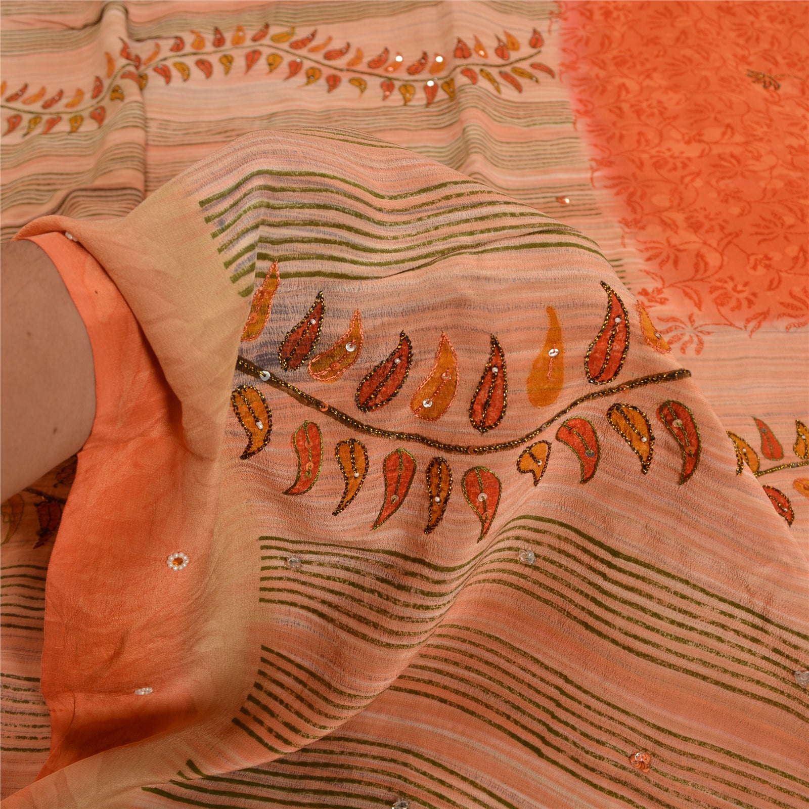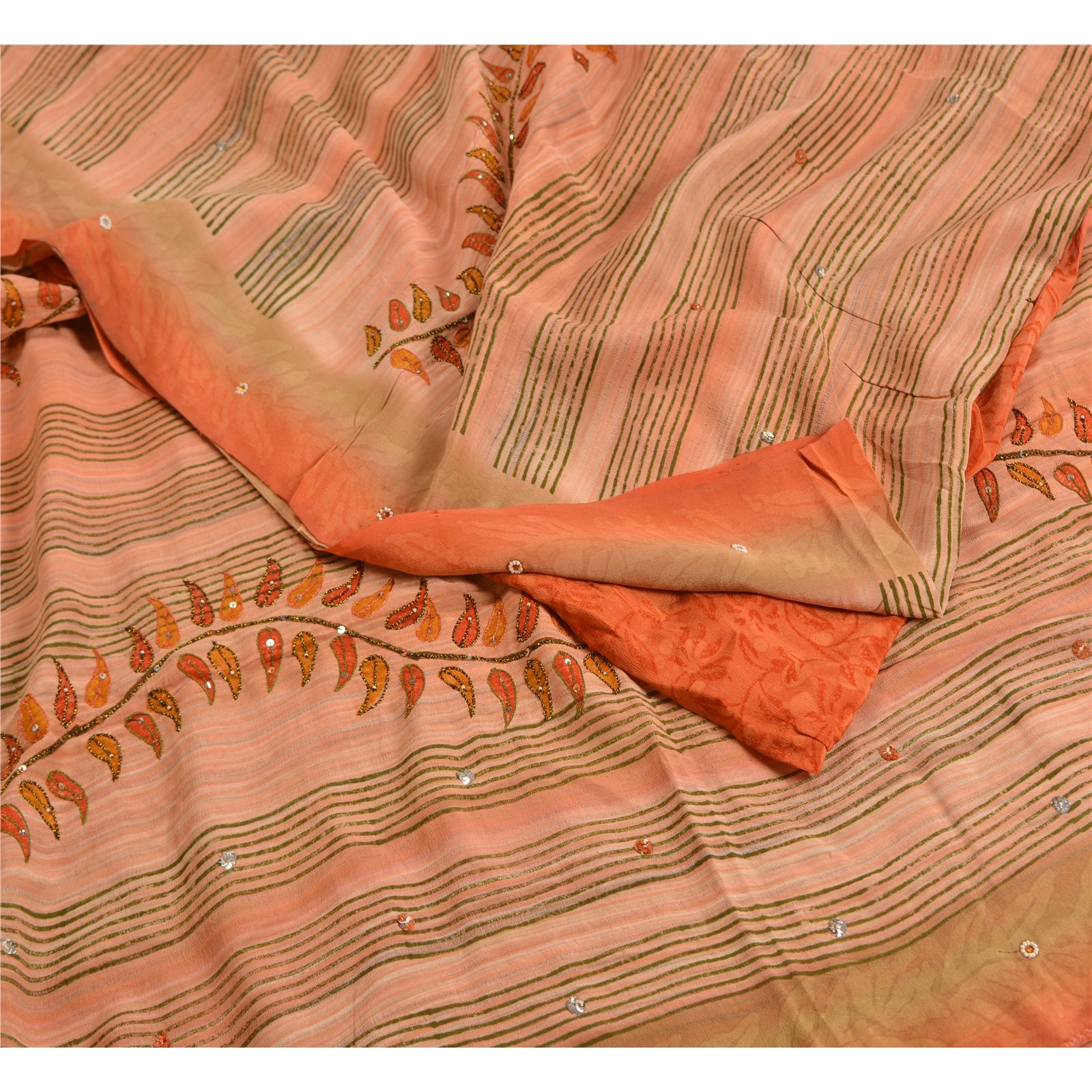 THE ITEM COLOR OR SHADE MAY BE DARKER OR LIGHTER THAN THE PICTURE.' Beautiful peach colored pure crepe silk printed & hand embroidered saree. Pallu & Border has printed floral design with sequins & beaded work. Similar work in center part of saree. What is special about this saree? Fabulous design is really enhancing the beauty of the saree. This unique vintage saree can be used for various crafting ideas even if you don't want to use it as a sari. Design a dress, use it as window,dressing, upholstery, sarongs, throw, dress making and table linen much more. Let your creative juices flow and use this decorated Sustainable Fabric in multiple fashion. International buyers please note: Import duties, taxes, and charges are not included in the item price or postage cost. These charges are the buyer's responsibility. Please check with your country's customs office to determine what these additional costs will be prior to bidding or buying.Buyer will pay custom duty/tax. It is calculated and charged differently by every country. As a seller I do not have any control over it.VAT or sales tax is calculated by the platform at the time of checkout. Customs charge is payable at the time of delivery.