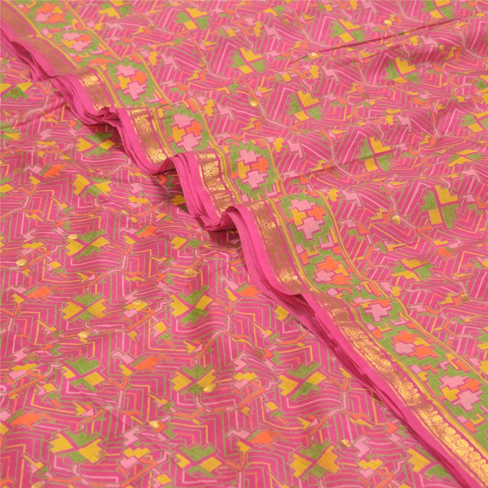 Sanskriti Vintage Sarees Pink Zari Border Geometric Printed Pure Silk 5YD Sari