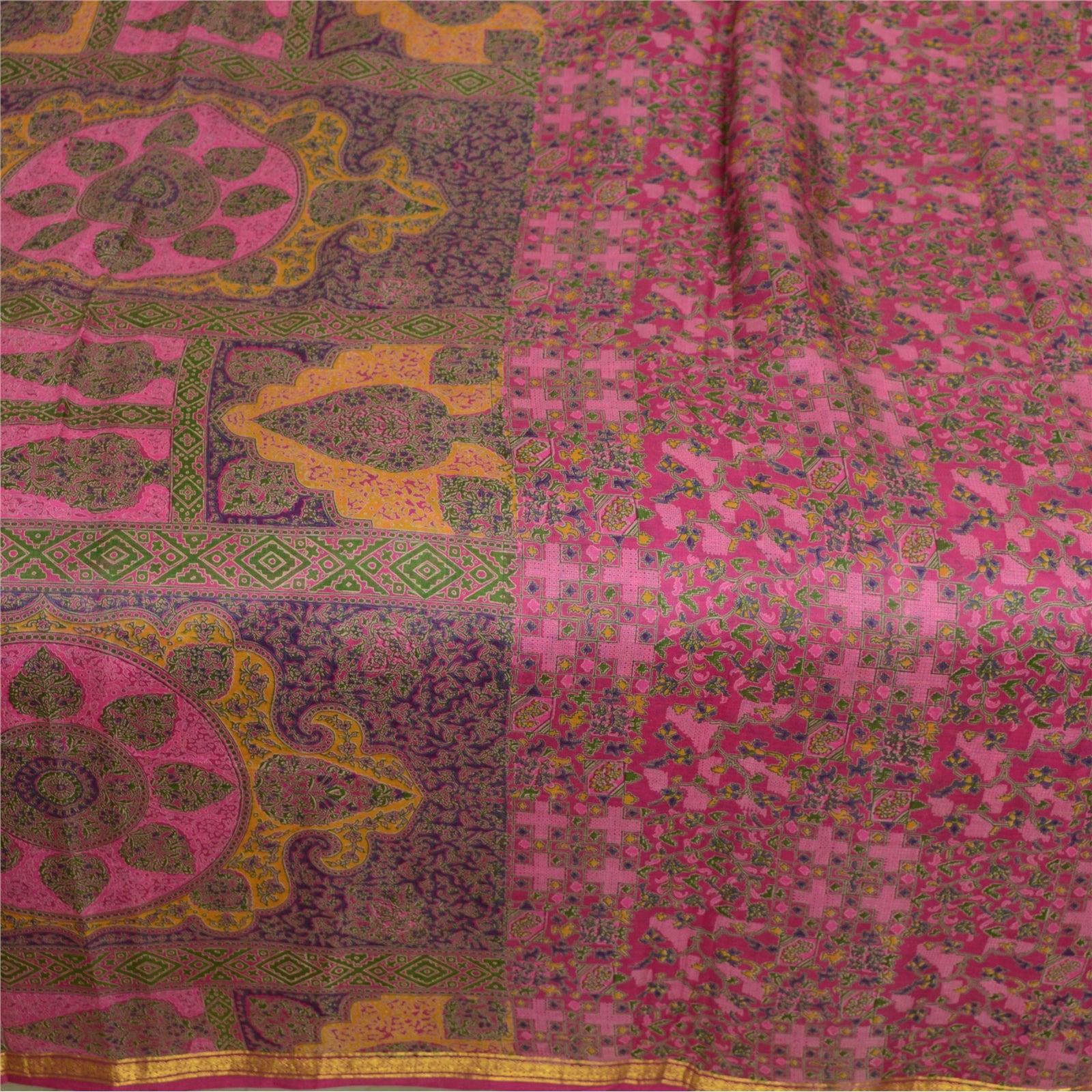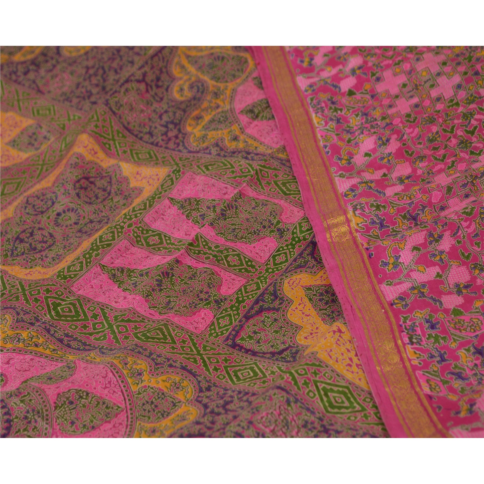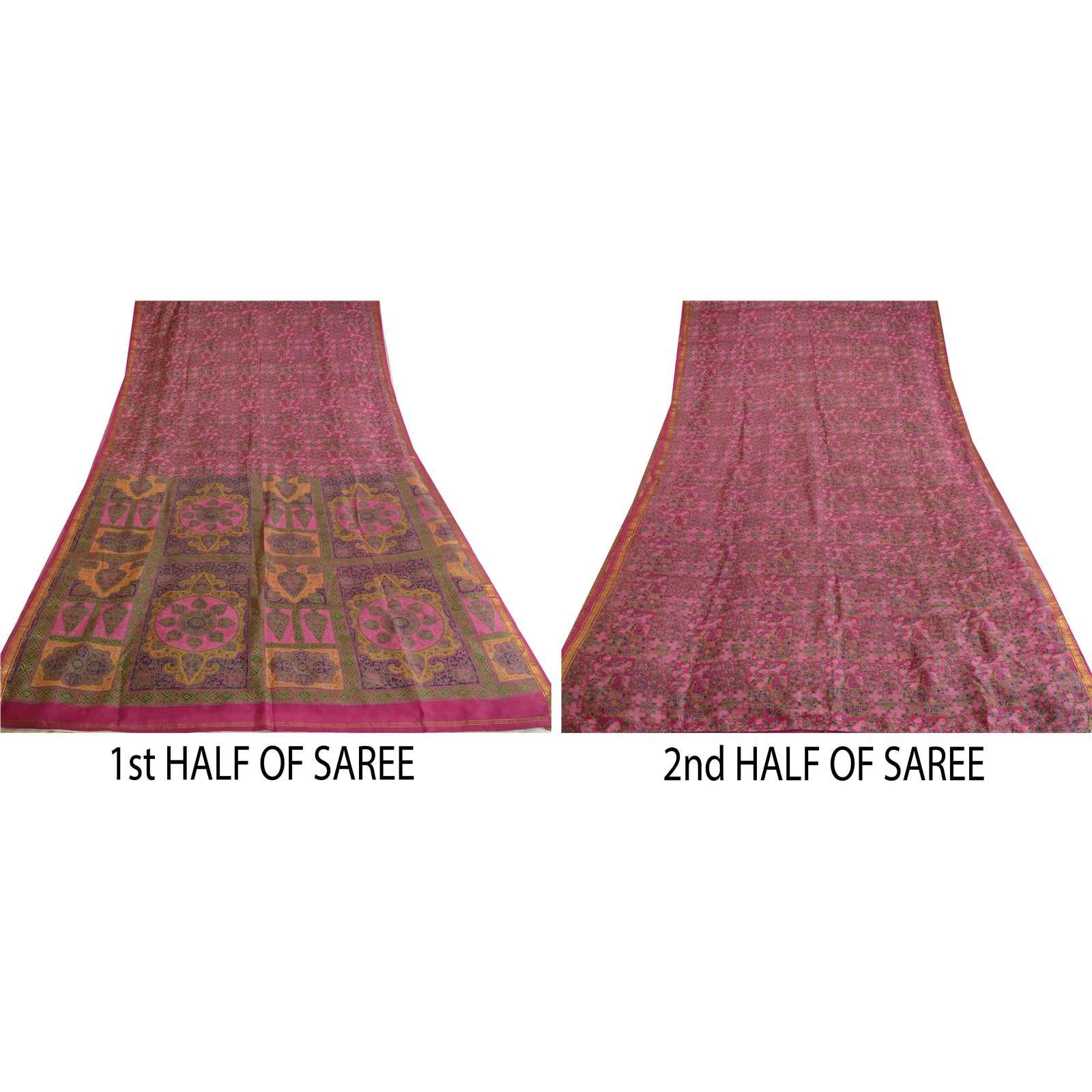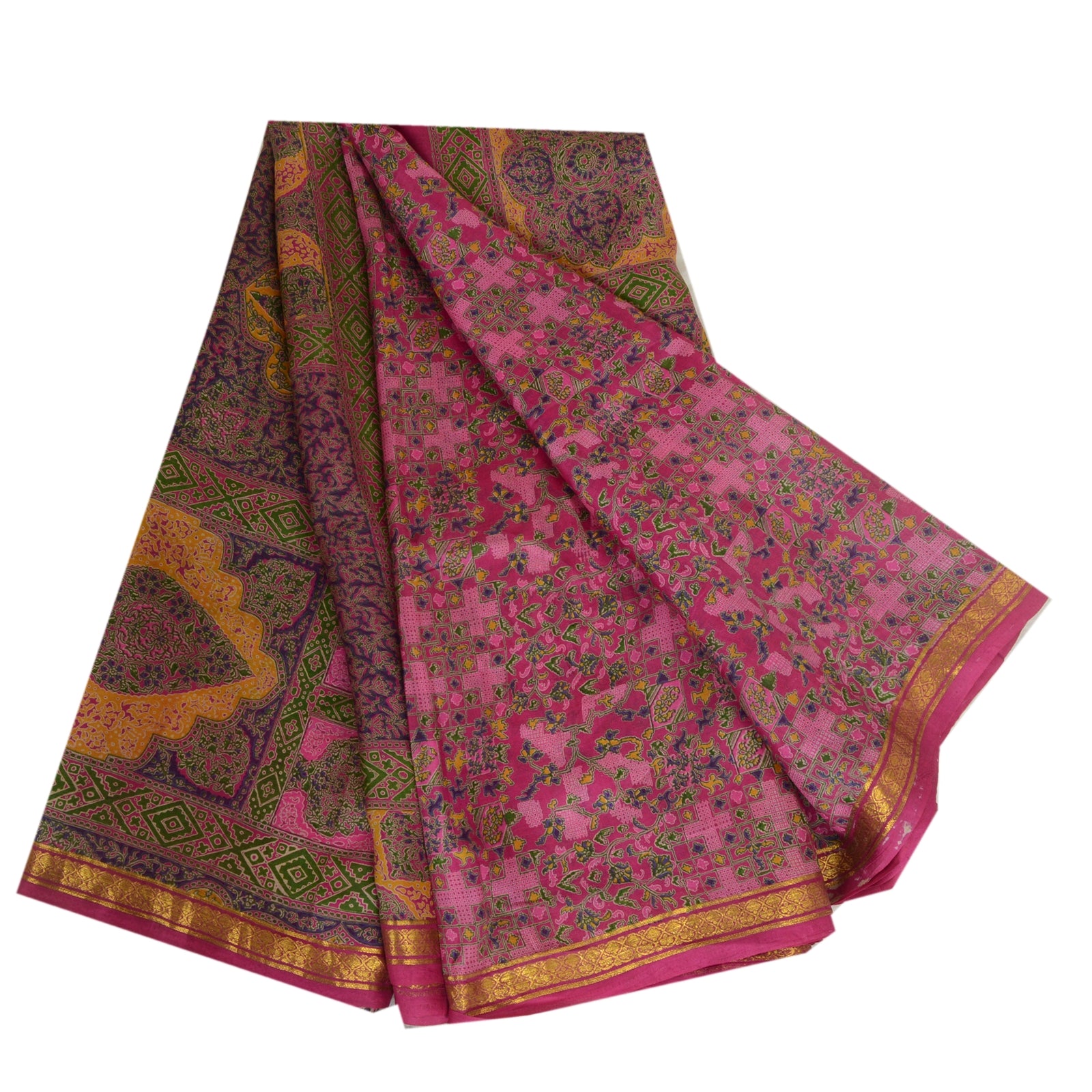 Sanskriti Vintage Sarees Pink Zari Border Pure Silk Printed Sari Craft Sustainable Fabric