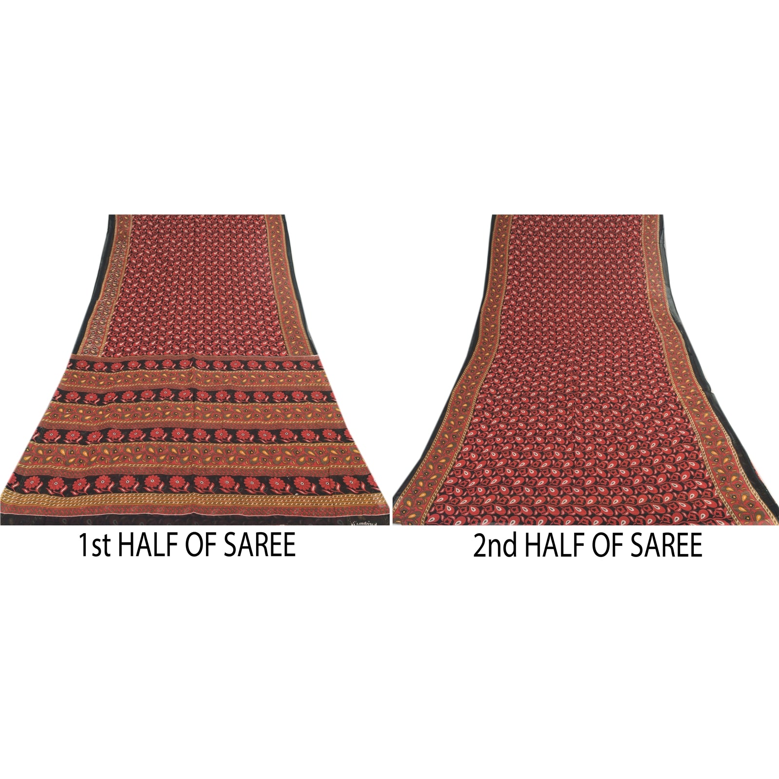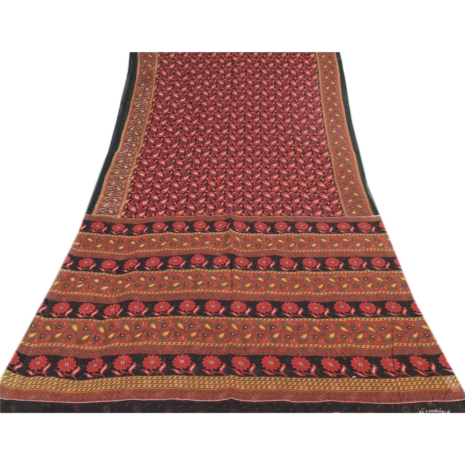 Sanskriti Vintage Sarees Red/Black 100%Pure Cotton Printed Sari 5yd Craft Fabric