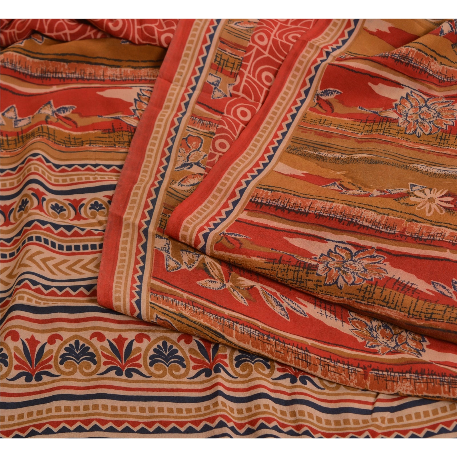Sanskriti Vintage Sarees Red/Brown Pure Crepe Silk Printed Sari 5yd Craft Sustainable Fabric