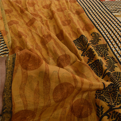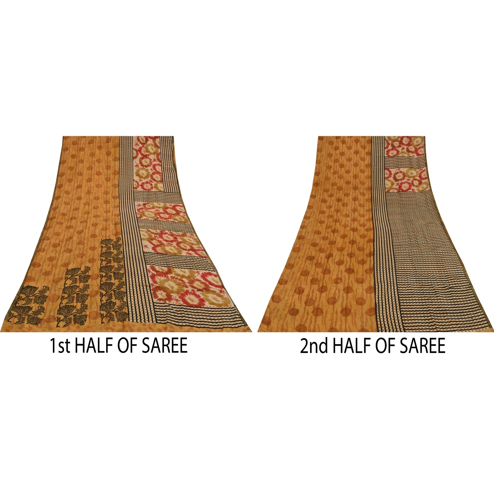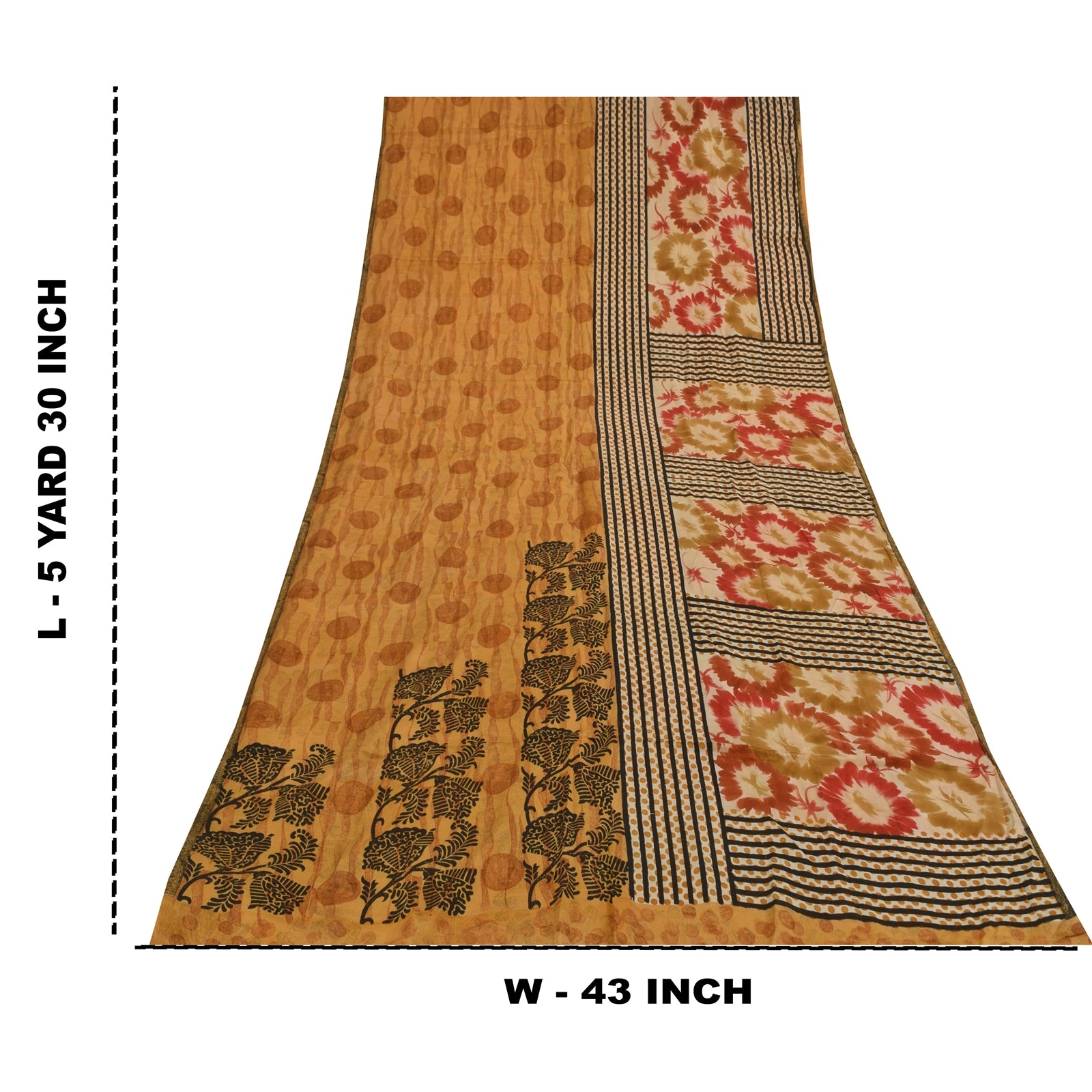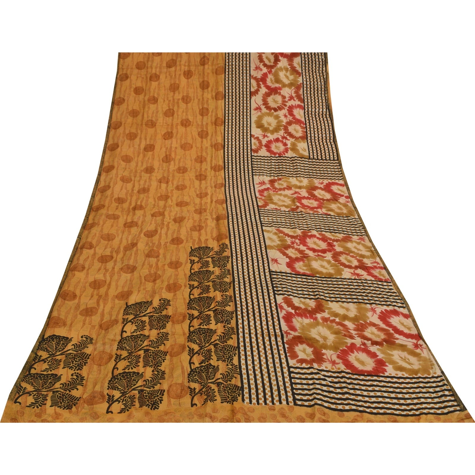 Sanskriti Vintage Sarees Saffron Pure Crepe Silk Printed Sari 5+yd Craft Sustainable Fabric