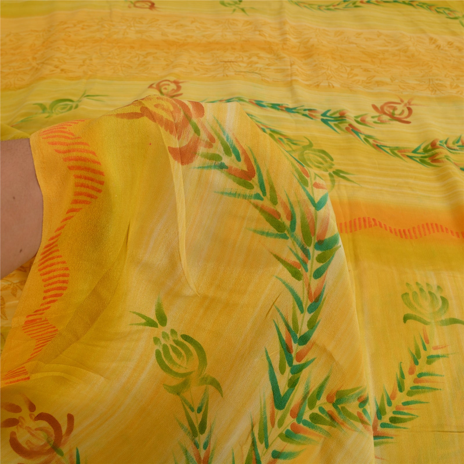 Sanskriti Vintage Sarees Yellow/Green Pure Crepe Silk Printed Sari Craft Sustainable Fabric