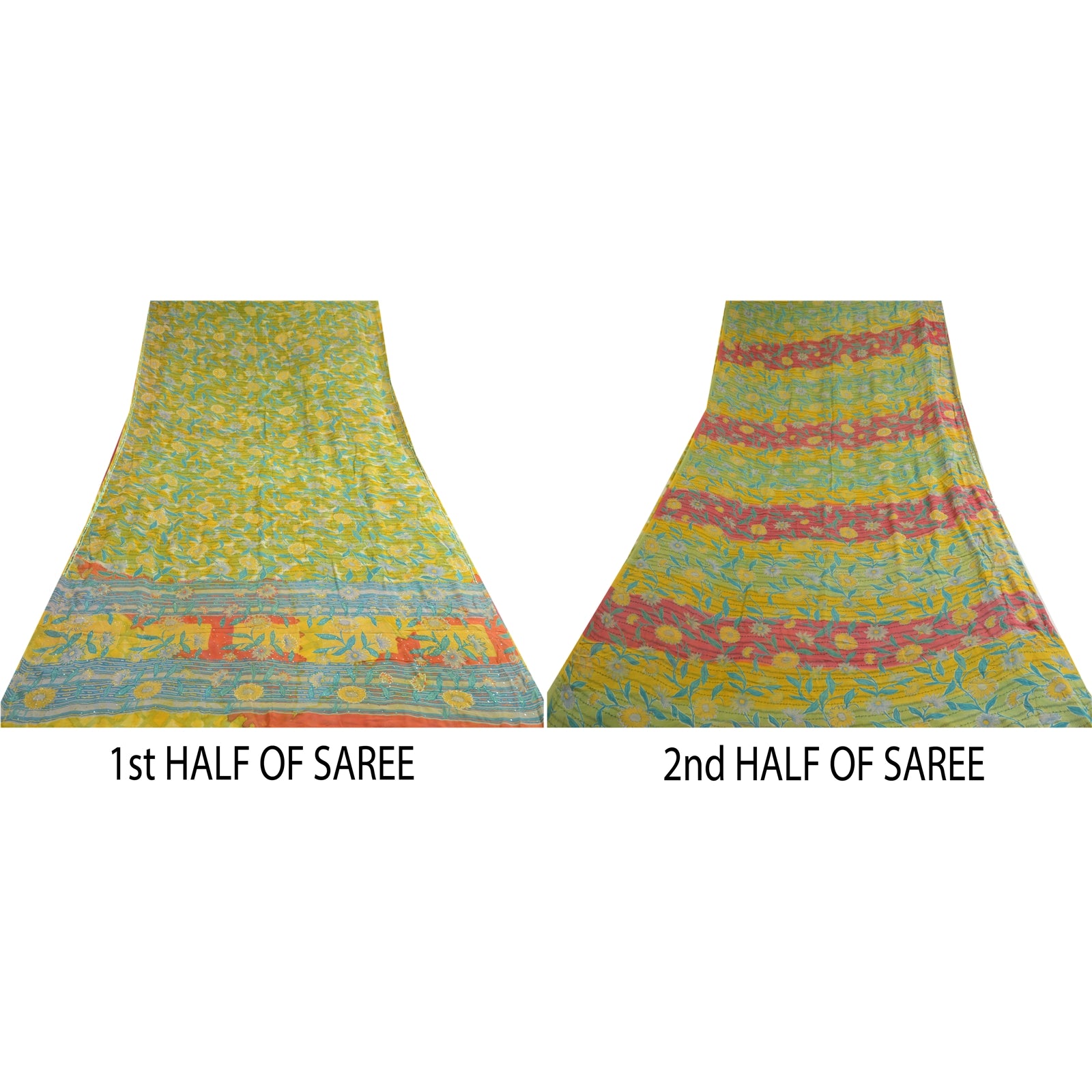 Sanskriti Vintage Sarees Yellow Hand Beaded Pure Georgette Silk Sari 5yd Sustainable Fabric