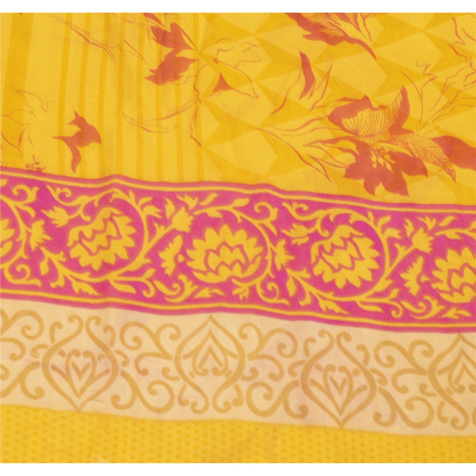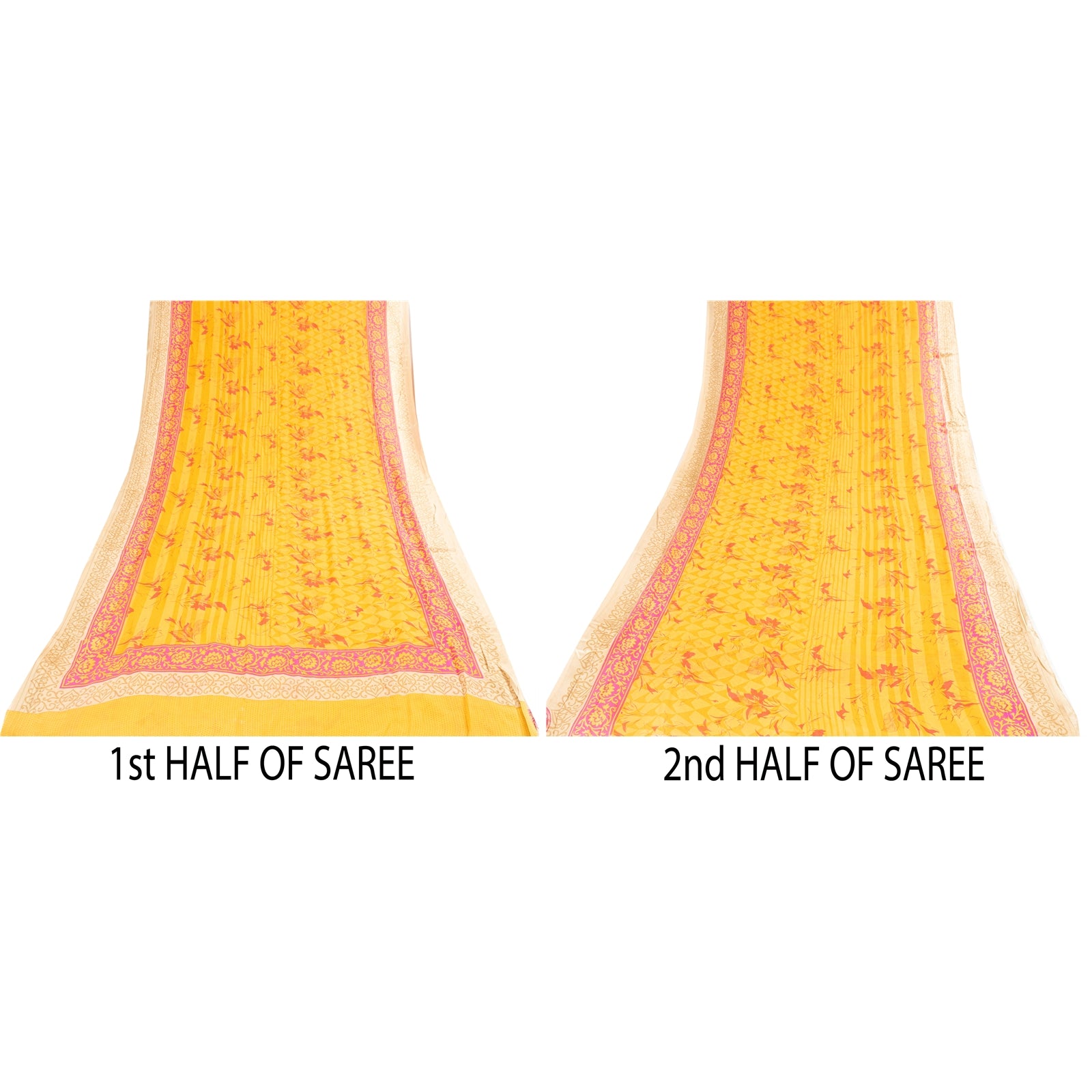 Sanskriti Vintage Sarees Yellow Pure Silk Floral Printed Sari 5+yd Craft Fabric