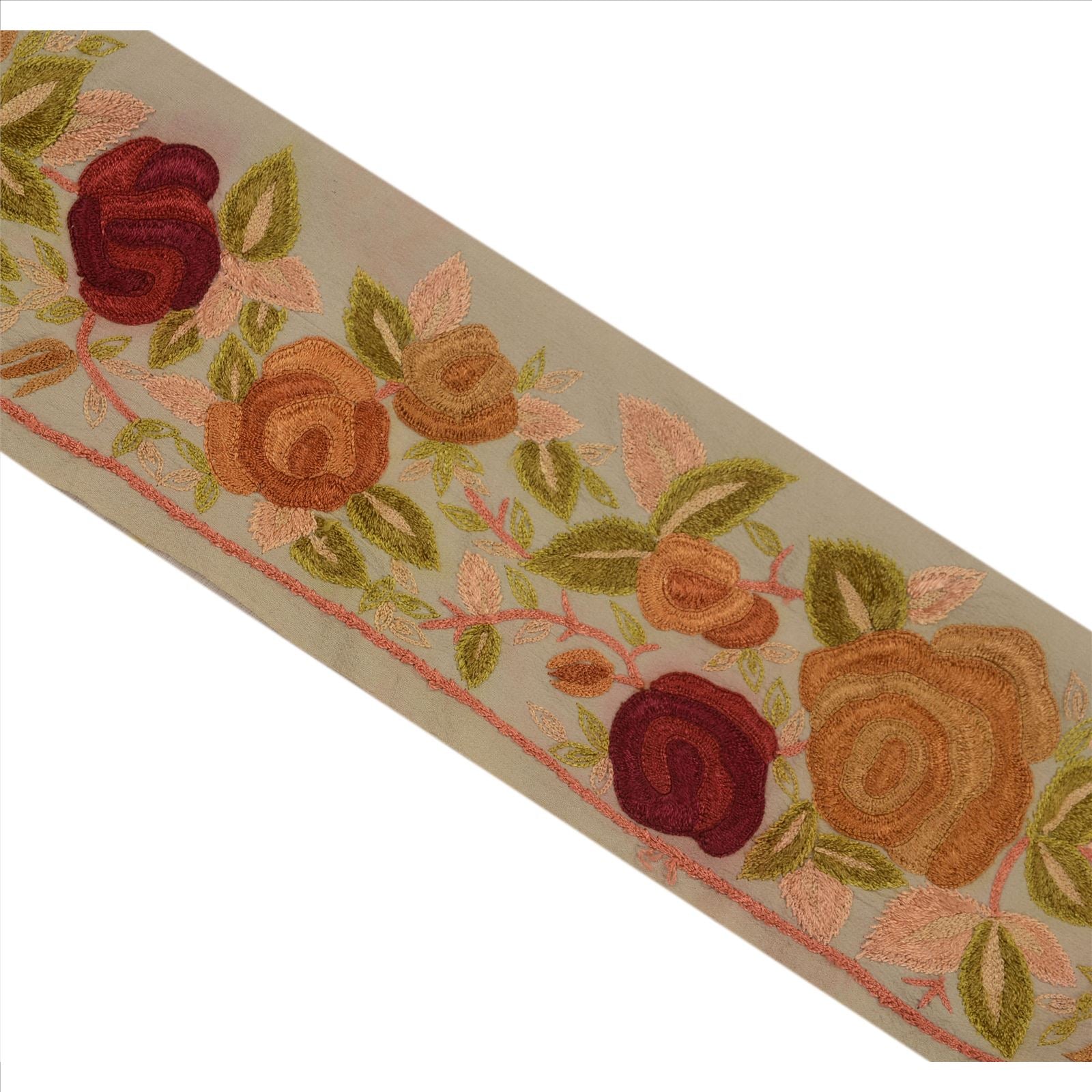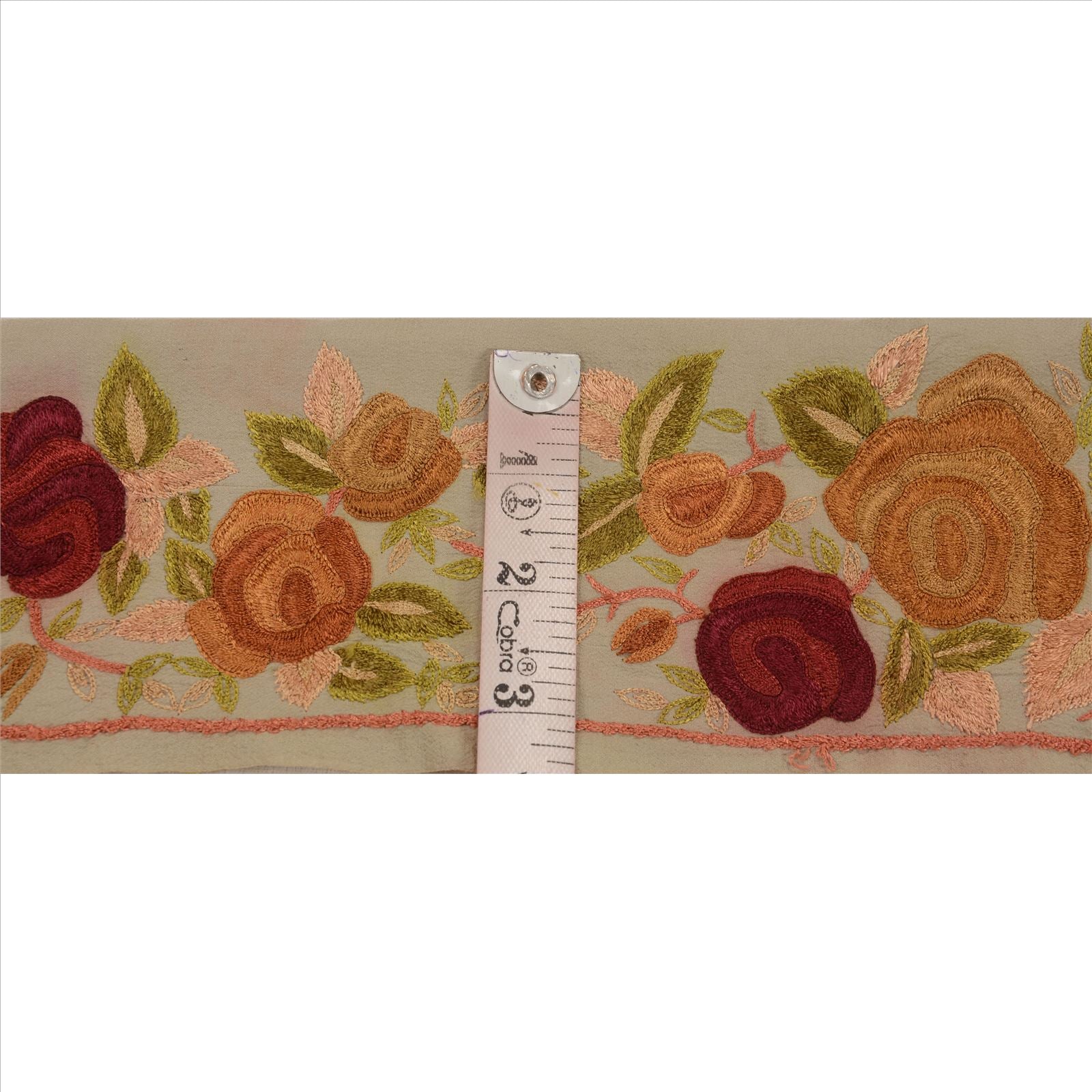 Beautiful crepe silk hand embroidered sari border. Further embellished by saffron, maroon, peach, green, brown thread work along with floral design on pale cream base Sustainable Fabric. 1 quantity = 1 yard