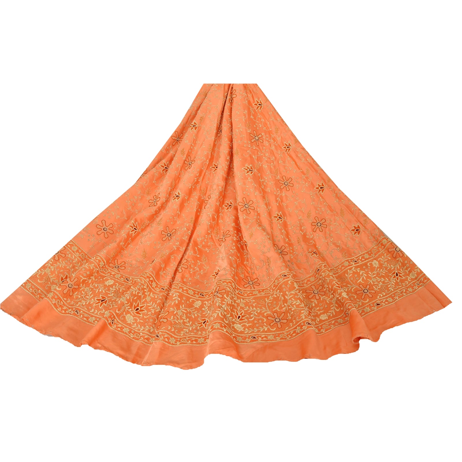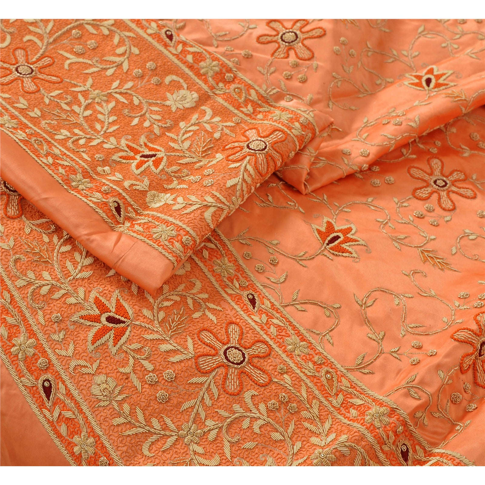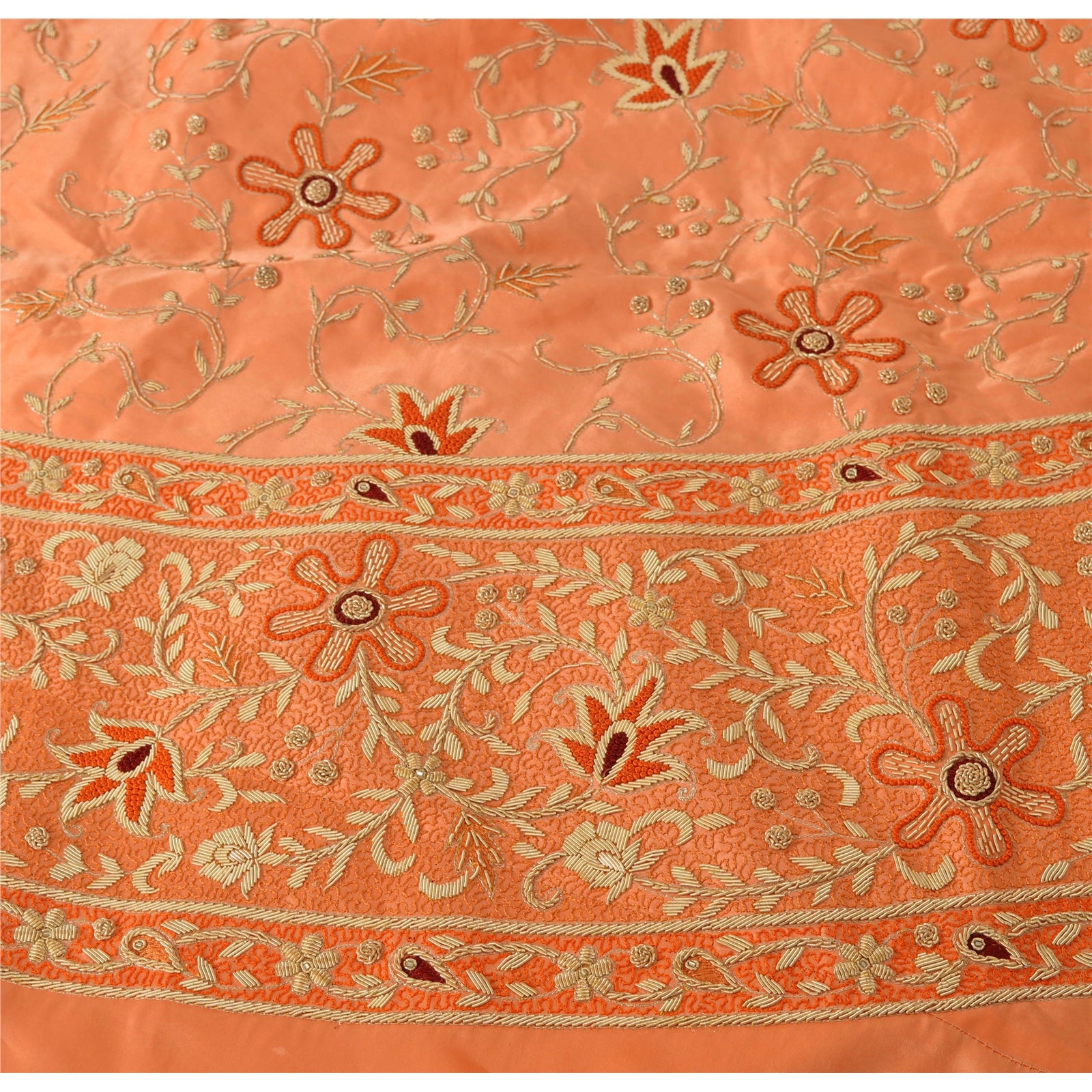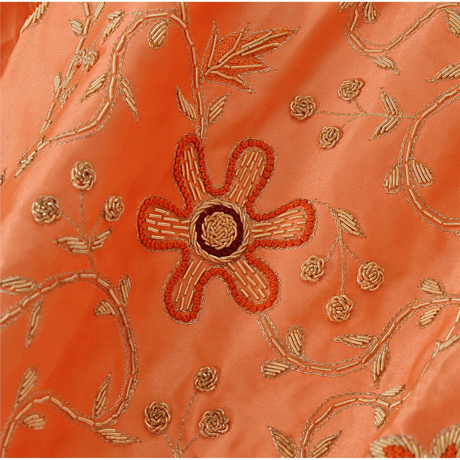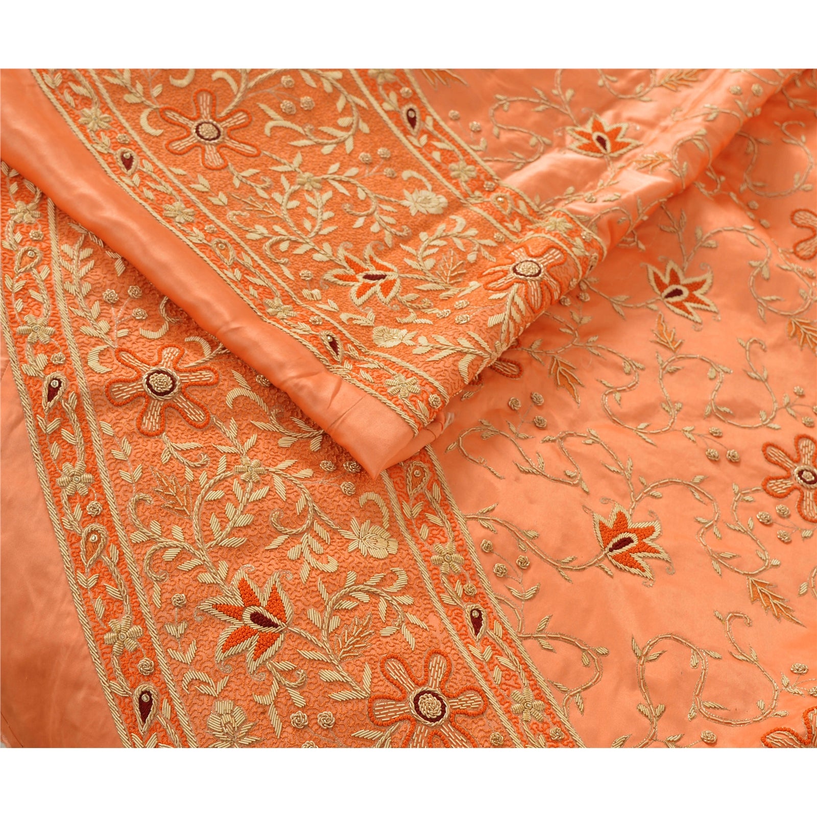 We Are Offering A Peach Coloured Pure Satin Silk Unstitched Lehenga Skirt. Lehenga Is A Form Of Skirt Which Is Long, Embroidered And Pleated, It Is Secured At The Waist. Satin Is A Weave That Typically Has A Glossy Surface And A Dull Back. If A Sustainable Fabric Is Formed With A Satin Weave Using Filament Fibres Such As Silk, Nylon, Or Polyester, The Corresponding Sustainable Fabric Is Termed A Satin. Silk Is A Natural Protein Fibre, Some Forms Of Which Can Be Woven Into Textiles. The Shimmering Appearance Of Silk Is Due To The Triangular Prism-Like Structure Of The Silk Fibre, Which Allows Silk Cloth To Refract Incoming Light At Different Angles, Thus Producing Different Colours. Satin Silk Together Gives The Qualities Of Satin And Silk. This Lehenga Is Peach In Colour On A Pure Satin Silk Sustainable Fabric Which Is Unstitched. Full Lehenga Is Embroidered In Floral, Paisley, And Plus Designs Made With Golden zari/Zardozi, peach thread work, orange/brown french knot design and white Glass Beads work. The Ghera Of This Lehenga Is Heavily Embroidered With Golden zari/Zardozi, peach thread work, orange/brown french knot design and white Glass Beads work In Floral, Leafs, Paisley And Other Designs. Pair It With A Similar Colour Top For Beautiful Look On A Wedding Day.