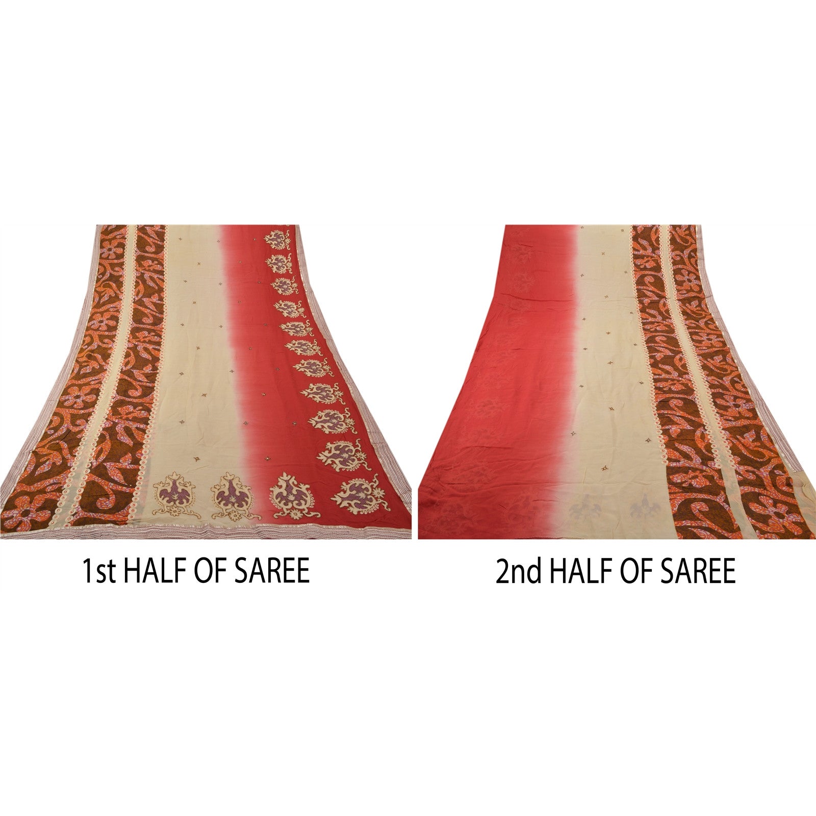 ? Beautiful pink & cream colored hand embroidered printed blend georgette sari ? All over sari features floral design embellished with cream/purple/green thread work, yellow rhinestone work and yellow glass beads work. ? There are cream embroidered Sustainable Fabric patch work on both sides of borders. What is special about this saree? Vibrant embroidered work with floral design on pink & cream color base Sustainable Fabric is really enhancing the beauty of the saree. This unique vintage saree can be used for various crafting ideas even if you don't want to use it as a sari. Design a dress, use it as a throw, as window dressing, upholstery, sarongs, table linen and much more. Let your creative juices flow and use this decorated Sustainable Fabric in multiple fashion.