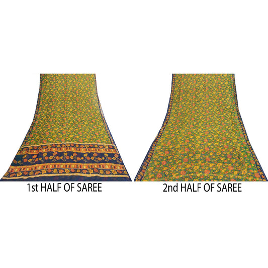 Sanskriti Vintage Green Sarees 100% Pure Crepe Silk Printed Sari Craft Sustainable Fabric