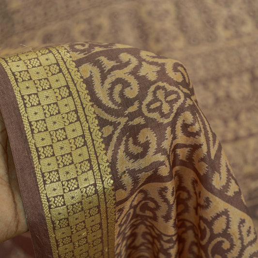 Sanskriti Vintage Sarees Brown Pure Silk Printed Sari Woven Border Craft Sustainable Fabric