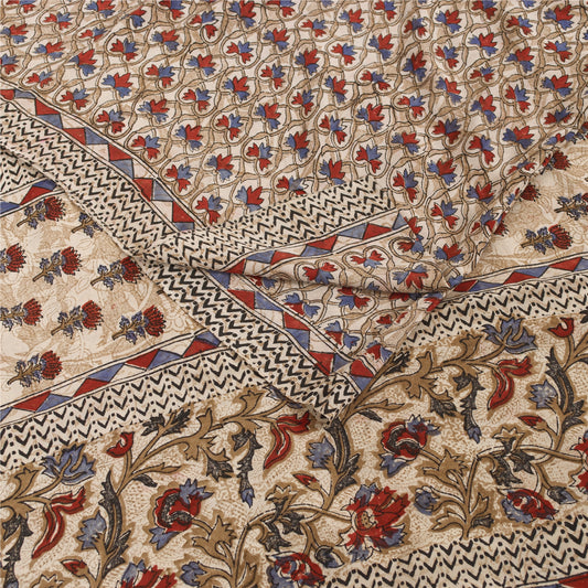 Sanskriti Vintage Cream Sari Art Silk Sustainable Fabric Craft Printed Sewing 5 Yard Sarees