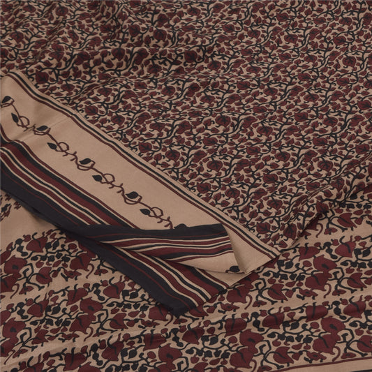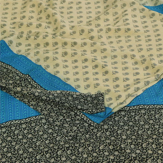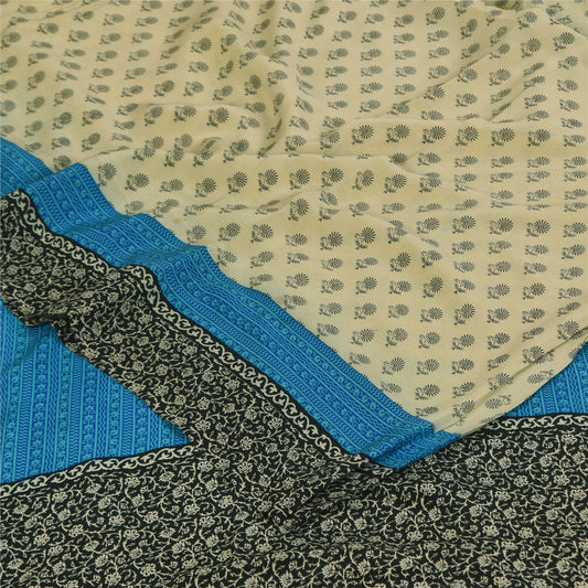 Sanskriti Vintage Sarees Cream Pure Crepe Silk Printed Sari 5+yd Craft Sustainable Fabric