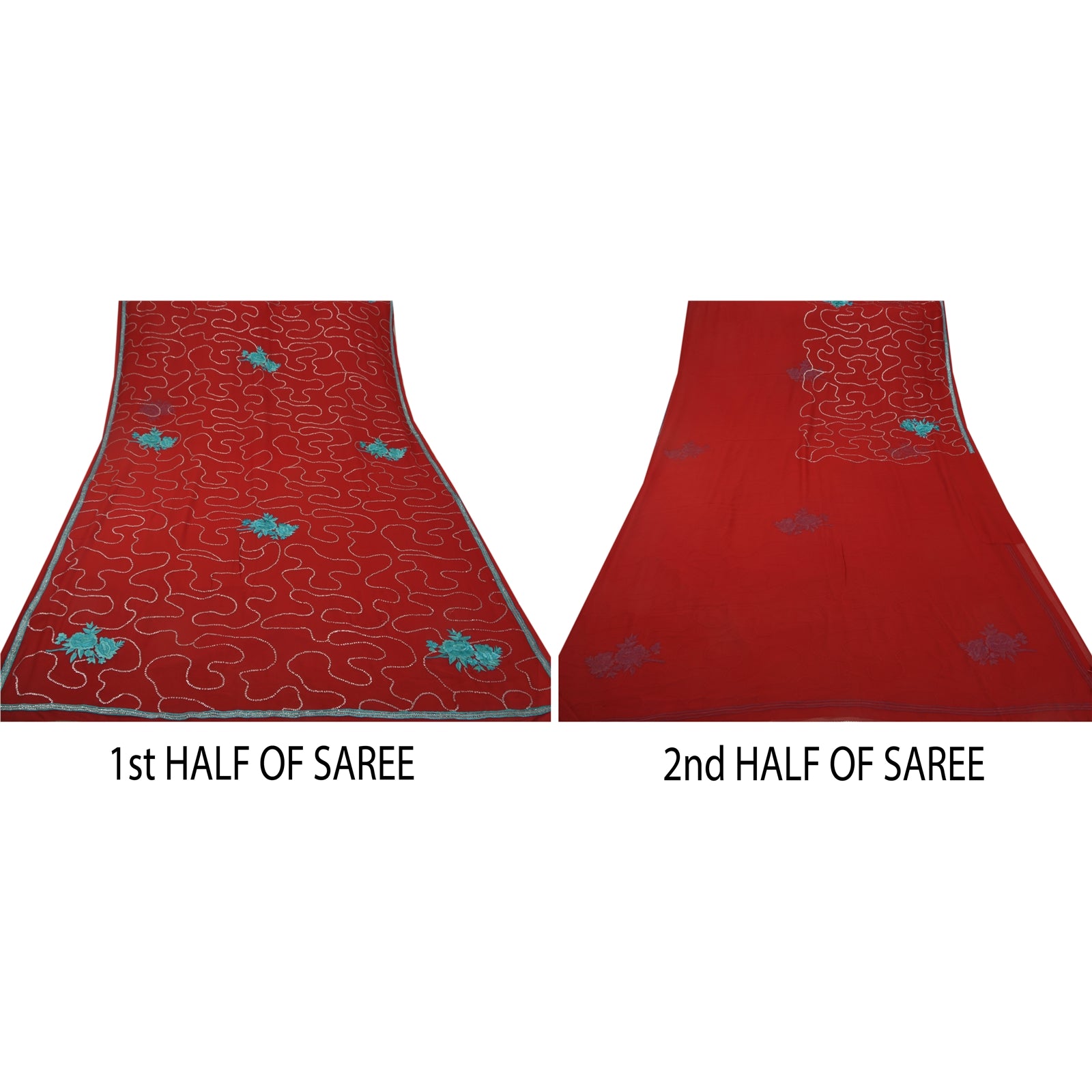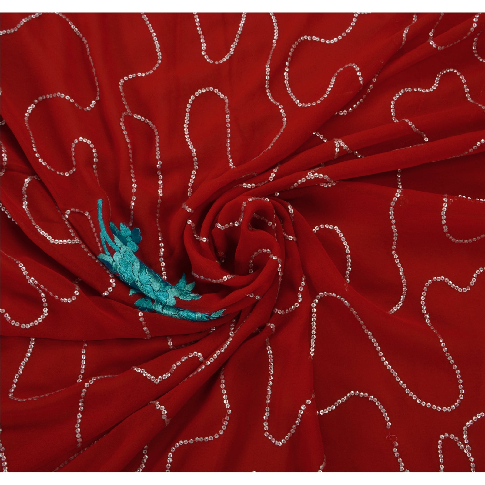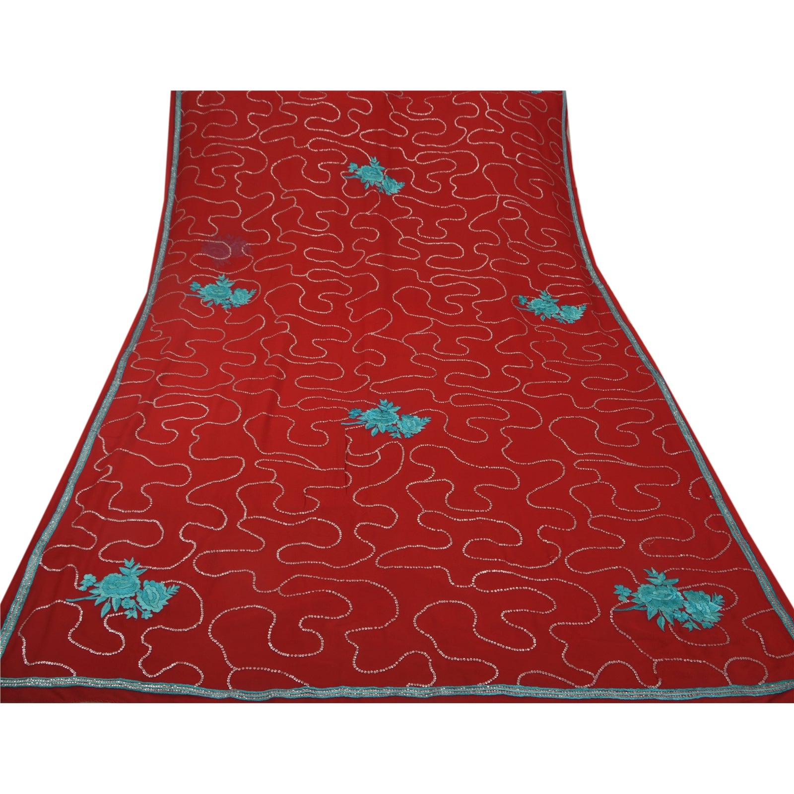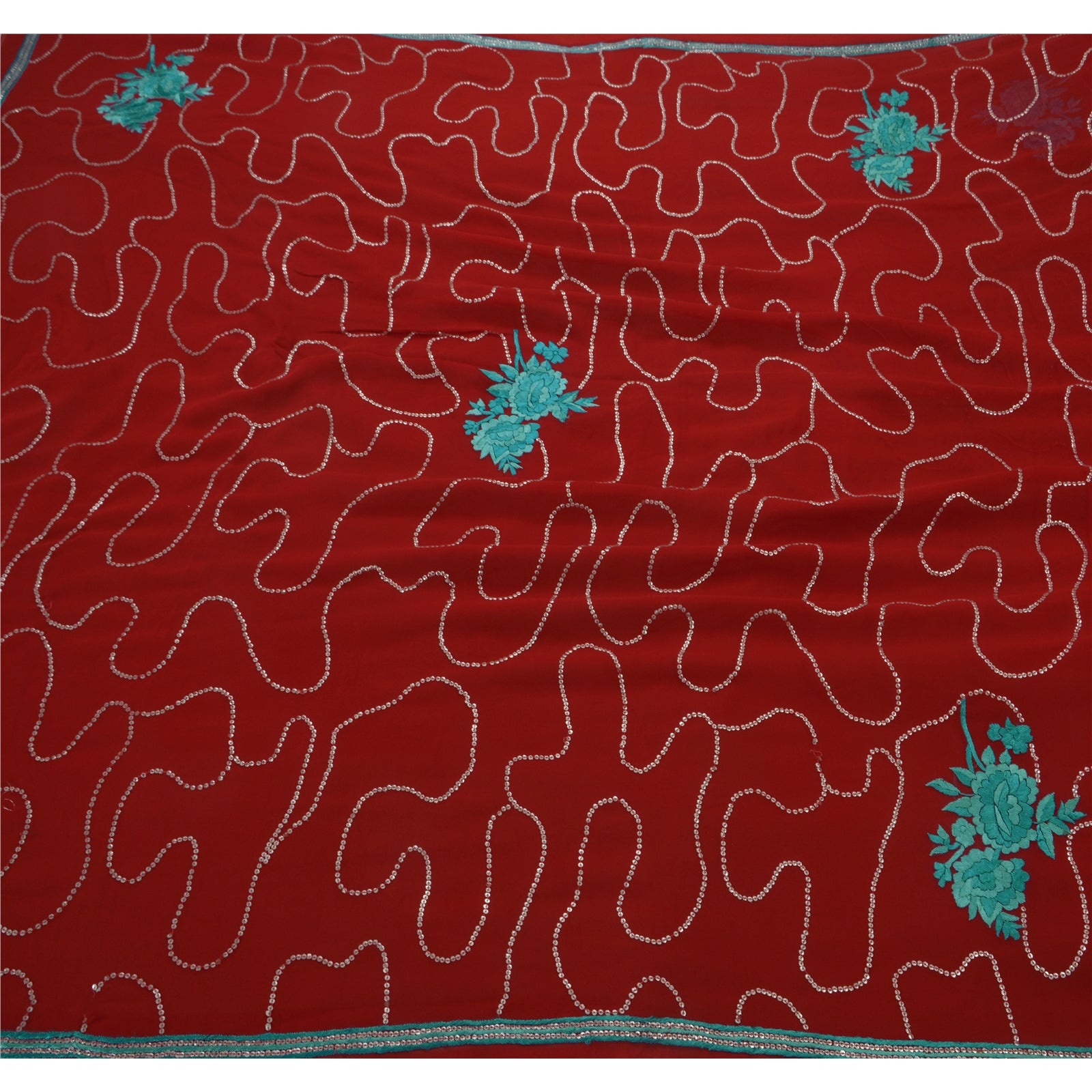 ? Beautiful dark red colored embroidered georgette sari ? All over sari features floral design embellished with blue thread work and silver sequins beads work. What is special about this saree? Sparkling sequins work with floral design on dark red color base Sustainable Fabric is really enhancing the beauty of the saree. This unique vintage saree can be used for various crafting ideas even if you don't want to use it as a sari. Design a dress, use it as a throw, as window dressing, upholstery, sarongs, table linen and much more. Let your creative juices flow and use this decorated Sustainable Fabric in multiple fashion.