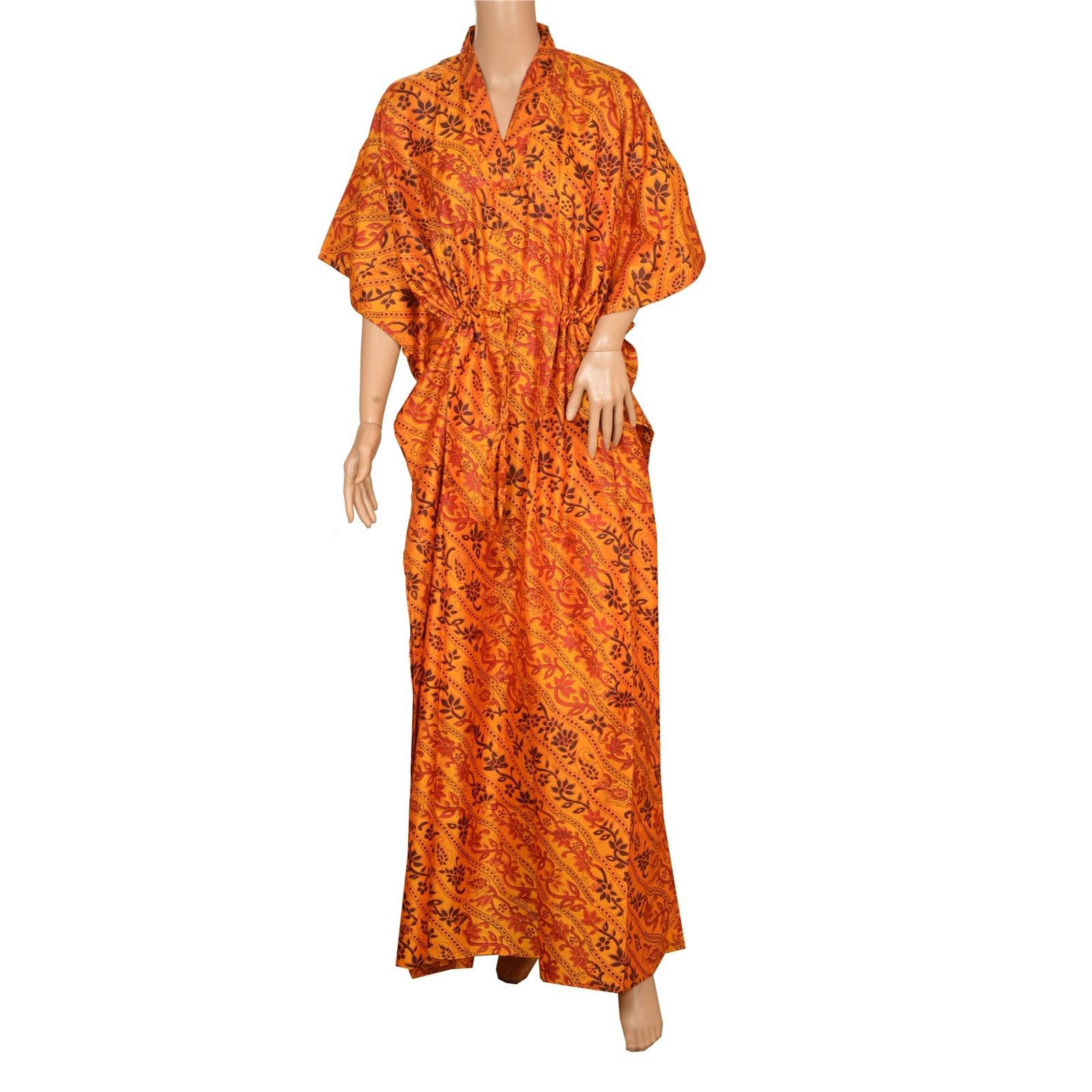 Sanskriti introducing printed caftans/long top. This caftan is made from our beautiful printed work caftans/long top. Pure silk Sustainable Fabric saffron colored is giving a lovely fall to a caftan. There is a belt inside the caftan which can be used for fitment from the waist. Their styling is also done keeping in mind the latest fashion trends. These Caftans are not only attractive but also skin friendly