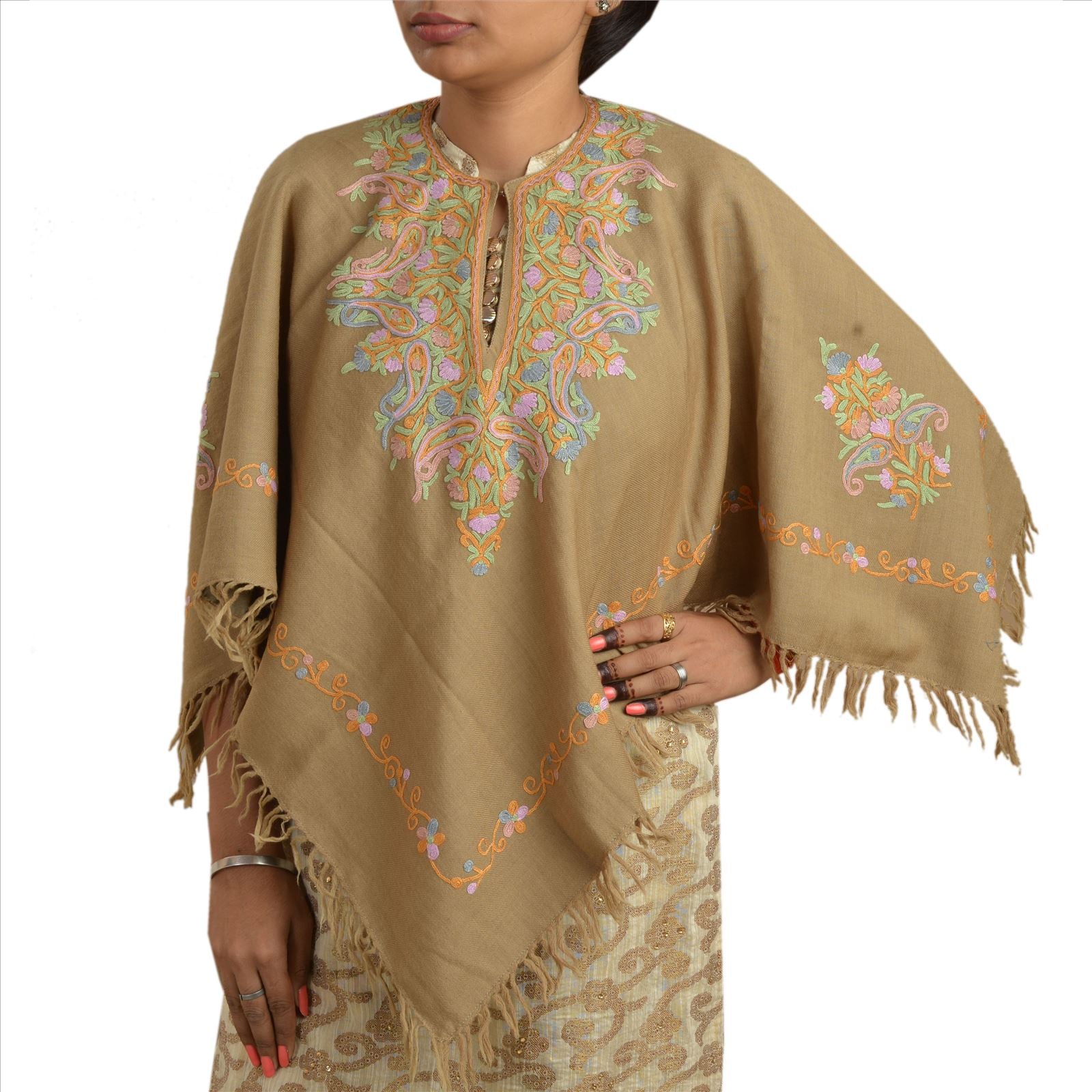 Sanskriti Vintage Sanskriti Pashmina Pure Wool Hand Embroidered Arizama Poncho Top Heena Green