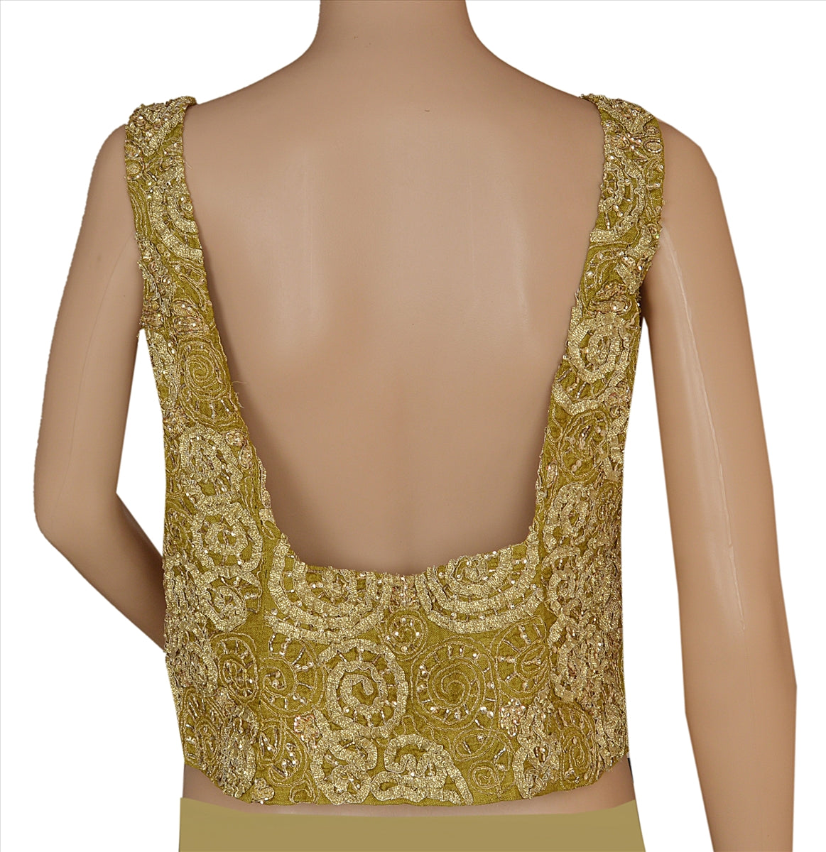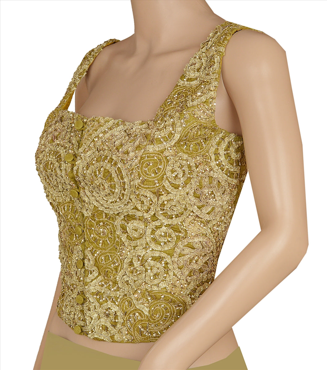 Attractive green colored hand embroidered short top/blouse. Floral design embellished with gold sequins, gold glass beads, gold dori work and golden gota work. Button in front with square neck. Top with remarkable golden contrast brightens the look of wearer and will add style and class to their look. Awesome work. This designer top with shining sequins work will make you look smart & awesome.