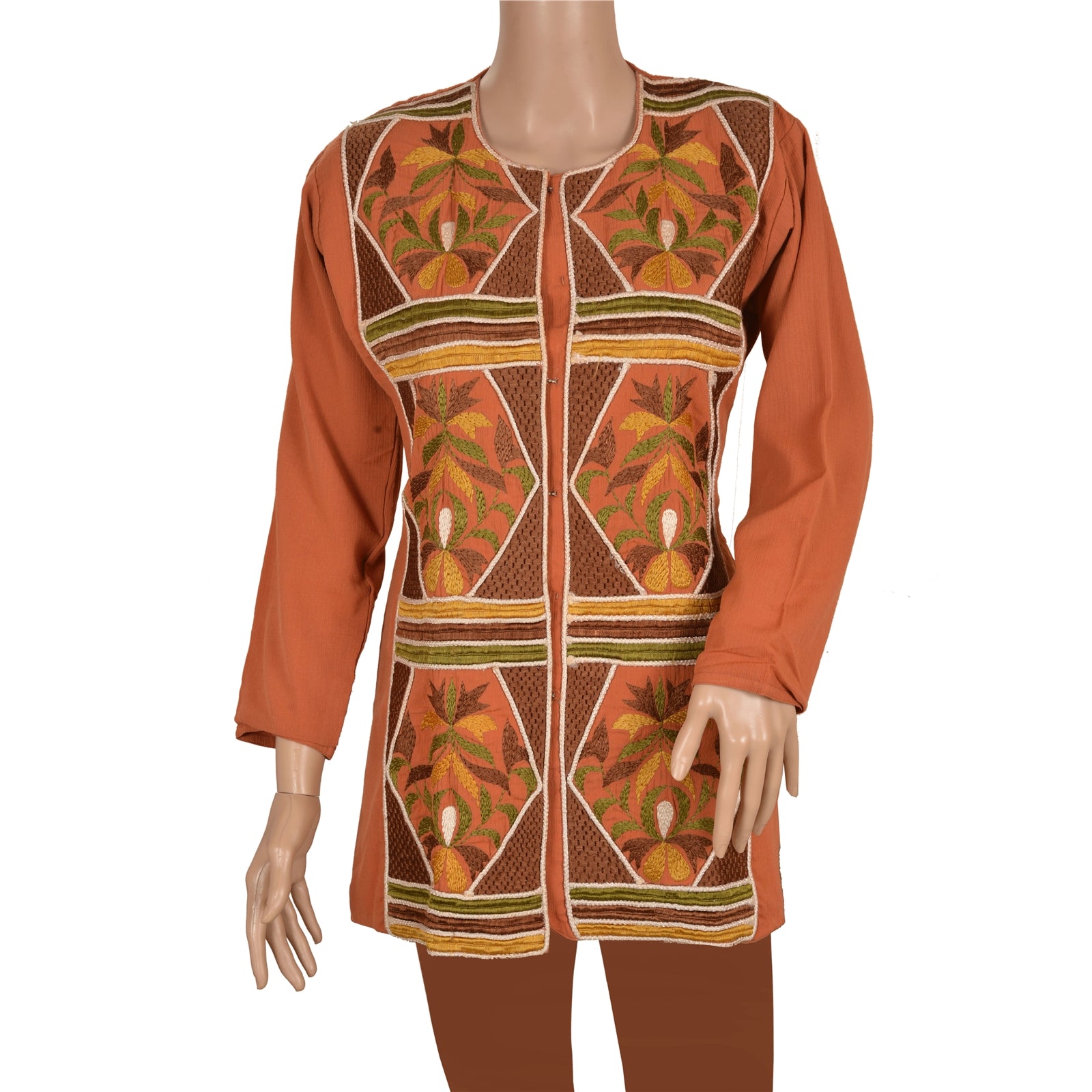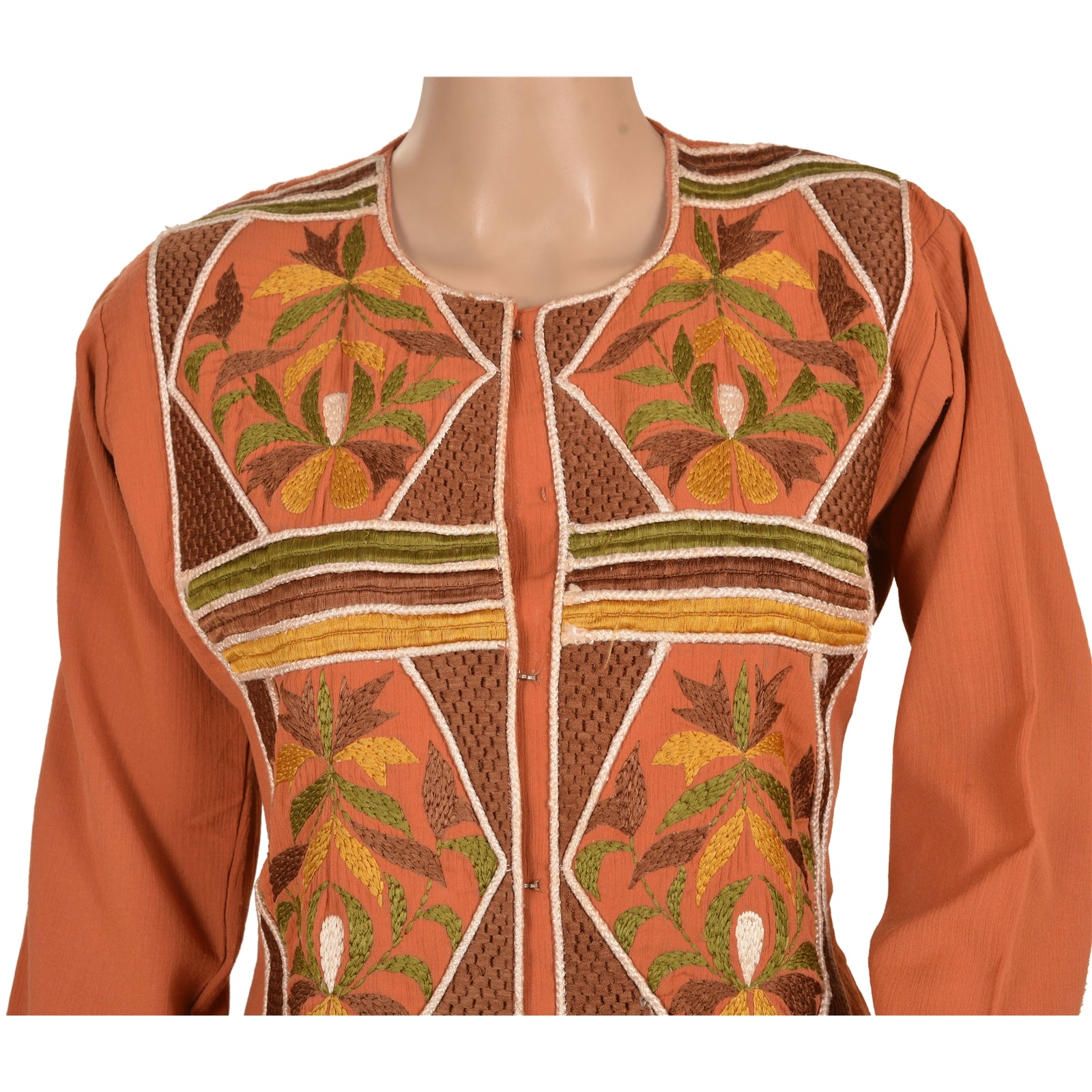 Peach color cotton hand embroidered short top. Floral design painstakingly hand worked in brown, yellow, white and cream color. Top with remarkable embroidery brightens the look of wearer and adds up charm to their outfits. Awesome work. This designer top with a round neck and front buttons will make you look smart & elegant. Team it with leggings for comfort & style.