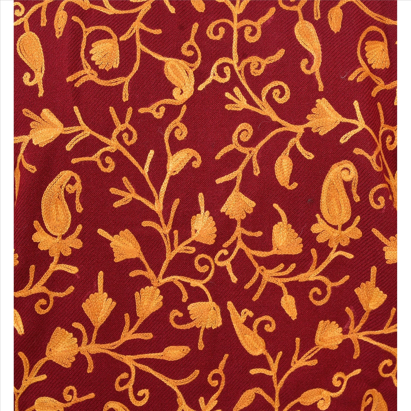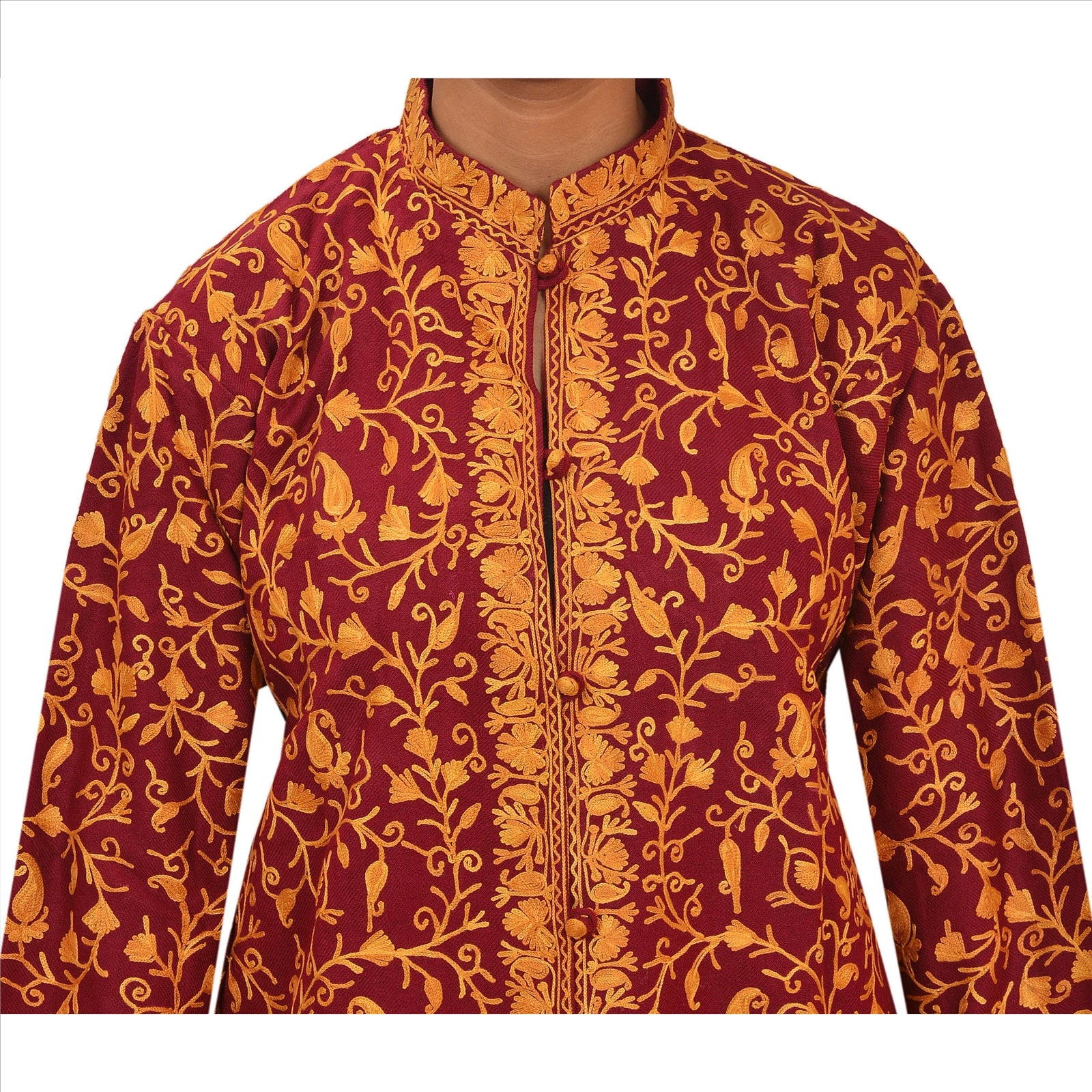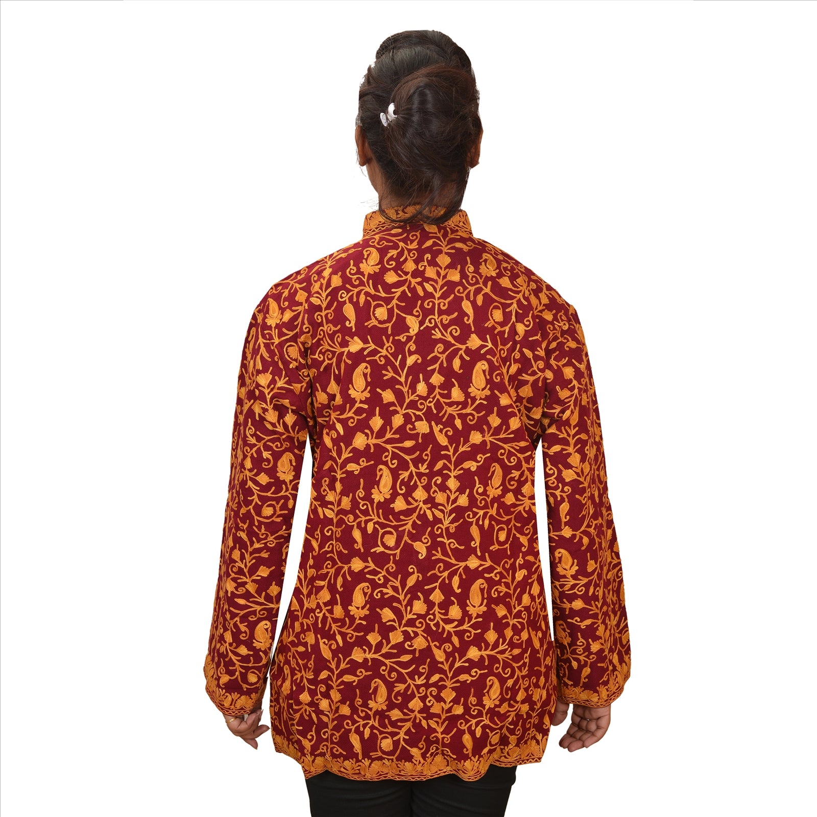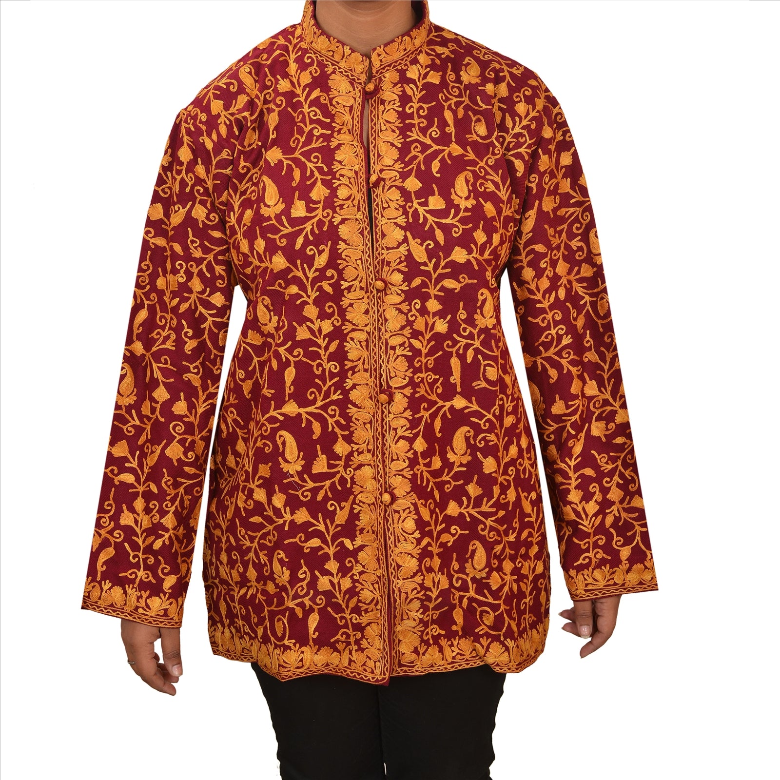 Maroon color woolen hand embroidered arizama (crewel work) short top. Floral & paisley design painstakingly hand worked in shades of brown & saffron. Top with remarkable embroidery brightens the look of wearer and adds up charm to their outfits. Awesome work. This designer top with a band collar and buttons in front will make you look smart & elegant. Team it with leggings for comfort & style.