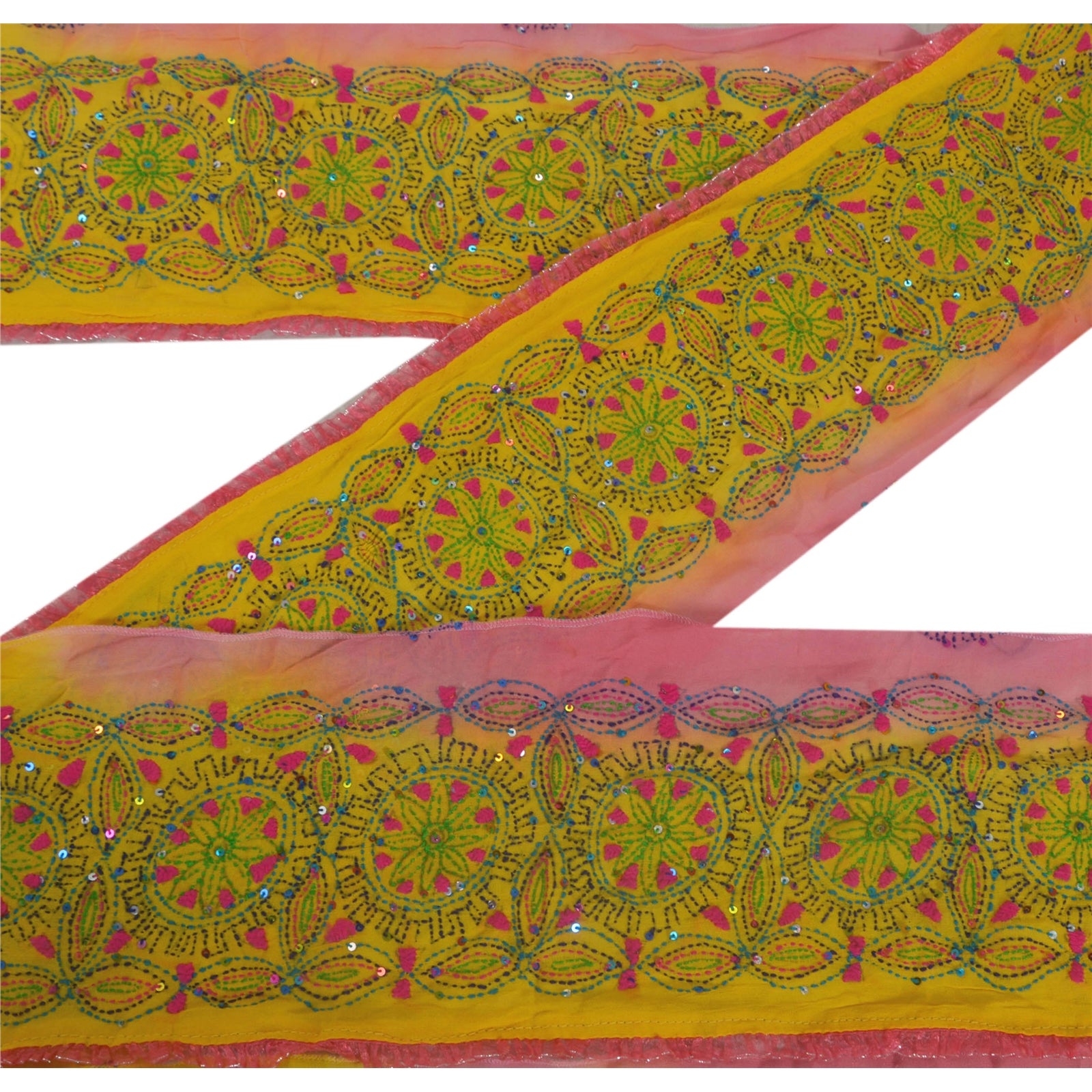Sanskriti Vintage 1 YD Kantha Sari Border Hand Beaded Trim Sewing Yellow Lace