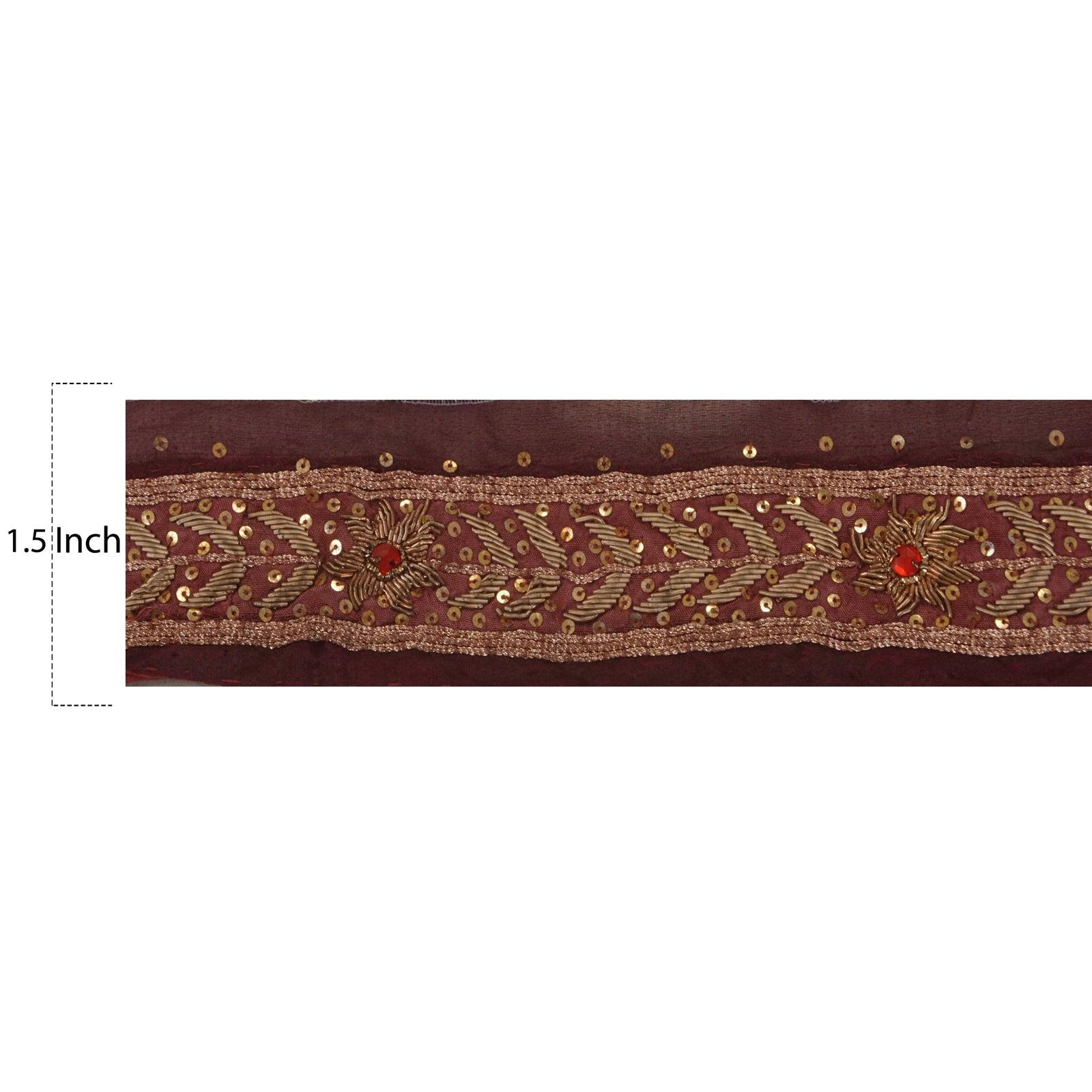Fabulous organza silk hand beaded sari border in wine color highlighting patch work. Border has beautiful floral patterns painstakingly hand beaded with golden zardozi, dori and sequins work. Further you can see fine detailing with red rhinestones. WOW!! an awesome one of a kind versatile border. 1 Quantity = 1 Yard