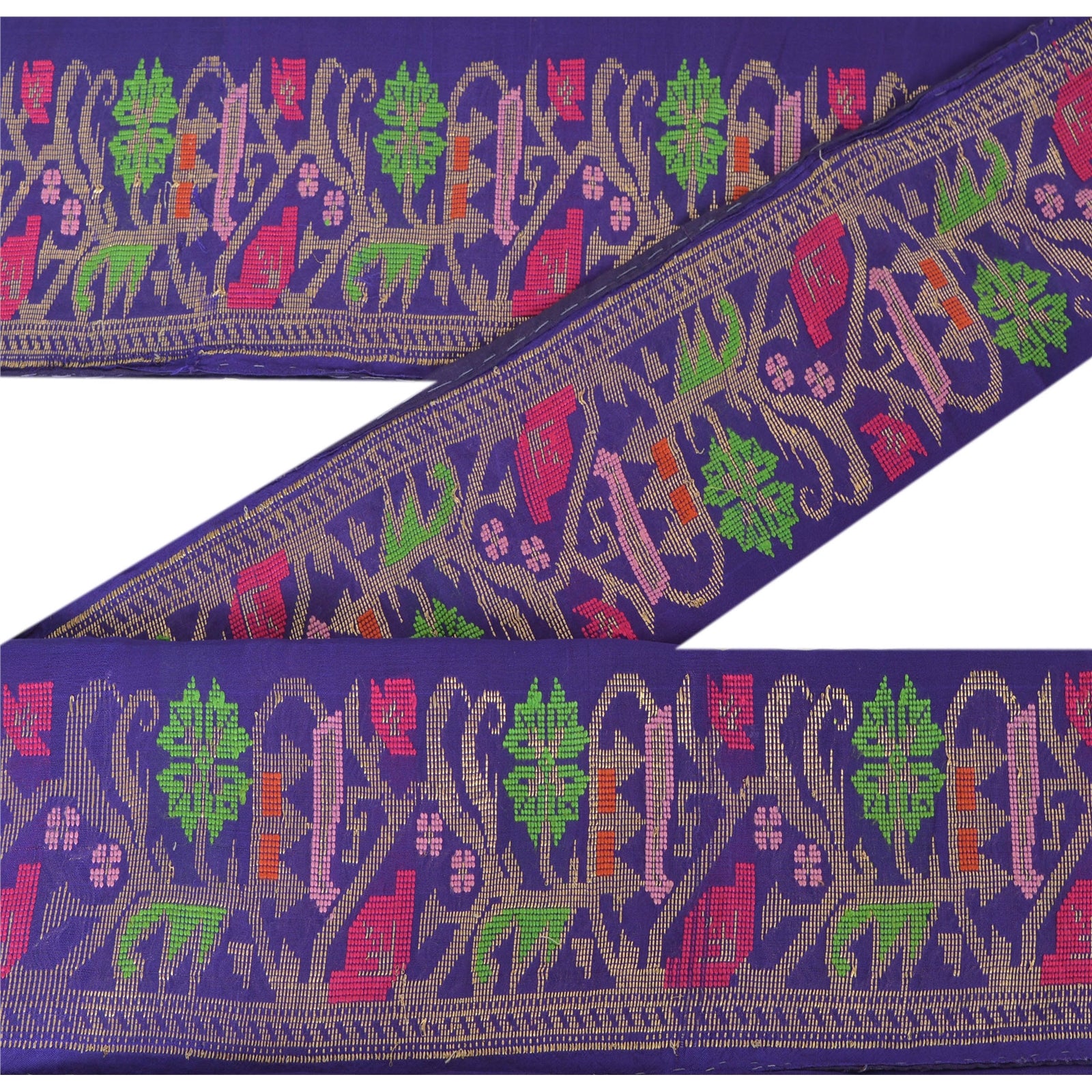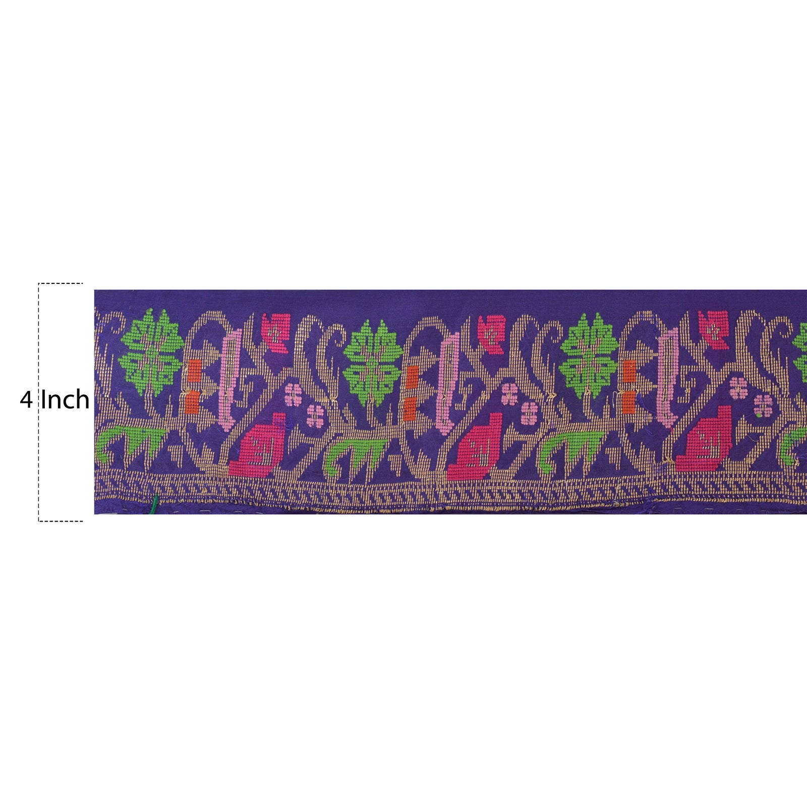 Graceful pure silk woven sari border in blue color highlighting thread work. Border has beautiful floral patterns painstakingly golden zari work, green/pink weaving work. WOW!! an awesome one of a kind versatile border. 1 Quantity = 1 Yard