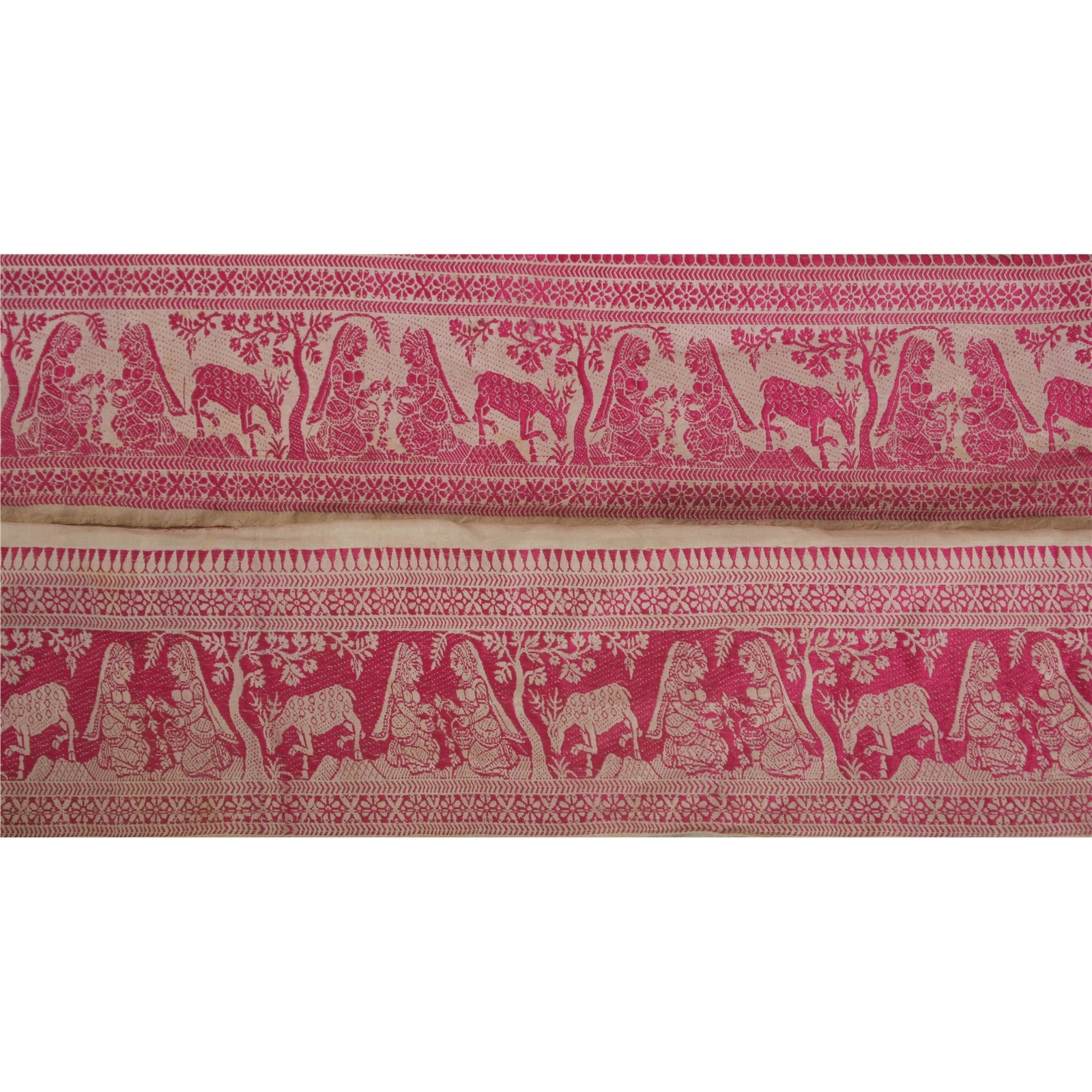 Wonderful pure silk woven sari border in cream color highlighting traditional Baluchari work from Odisha (Eastern India). Border has beautiful woven pattern in pink color showcasing human & deer. Floral motifs further add to the beauty of the trim. WOW!! and awesome one of a kind versatile border. 1 Quantity = 1 Yard