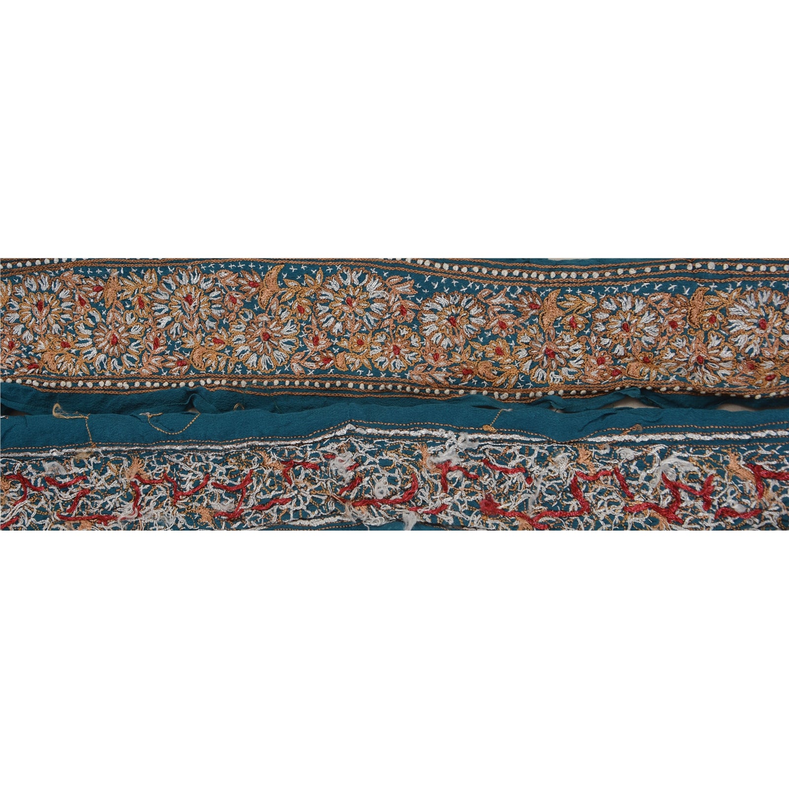Amazing crepe silk hand embroidered sari border in till blue color highlighting thread work. Border has beautiful floral patterns painstakingly embroidered with brown, red, white thread work . WOW!! an awesome one of a kind versatile border. 1 Quantity = 5 Yard