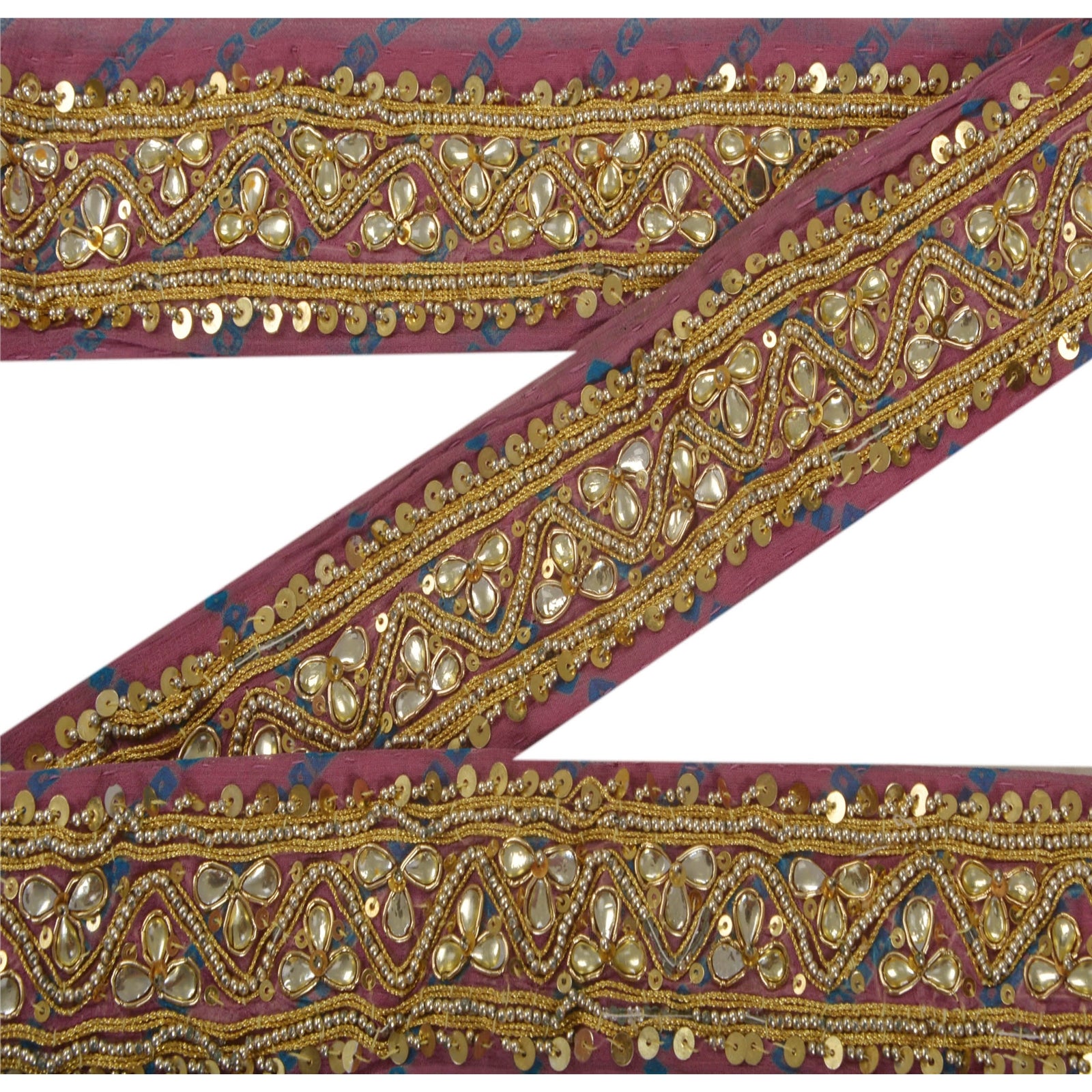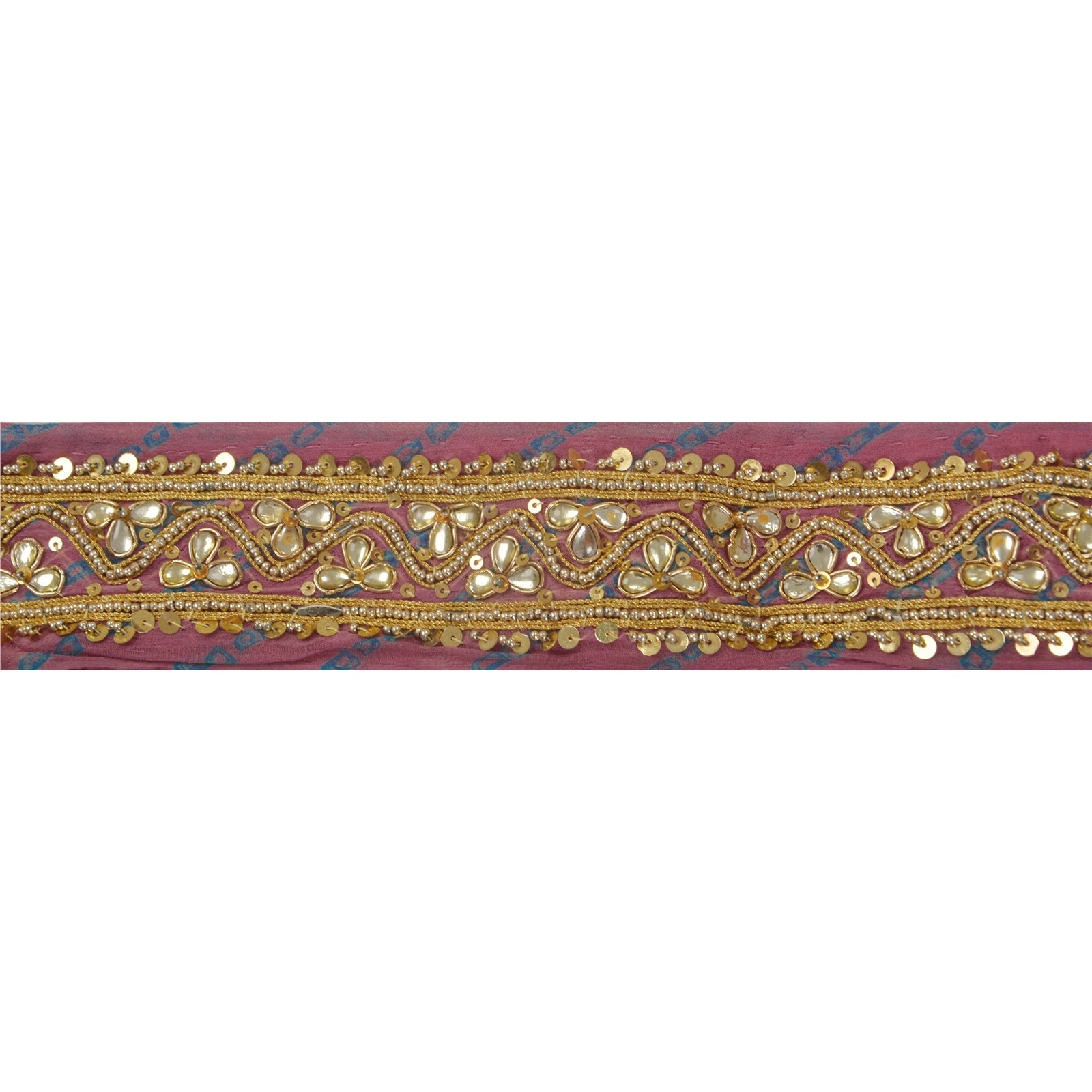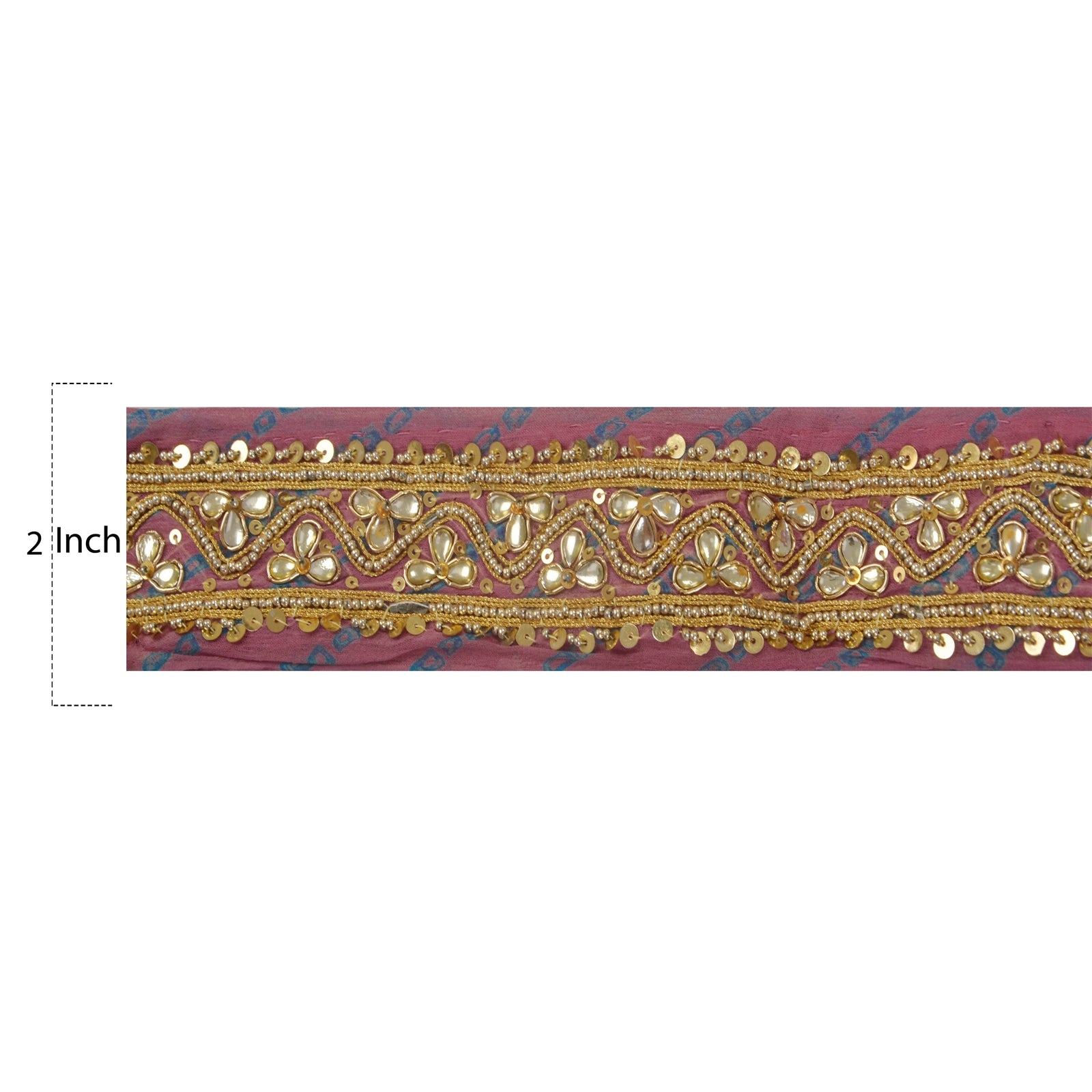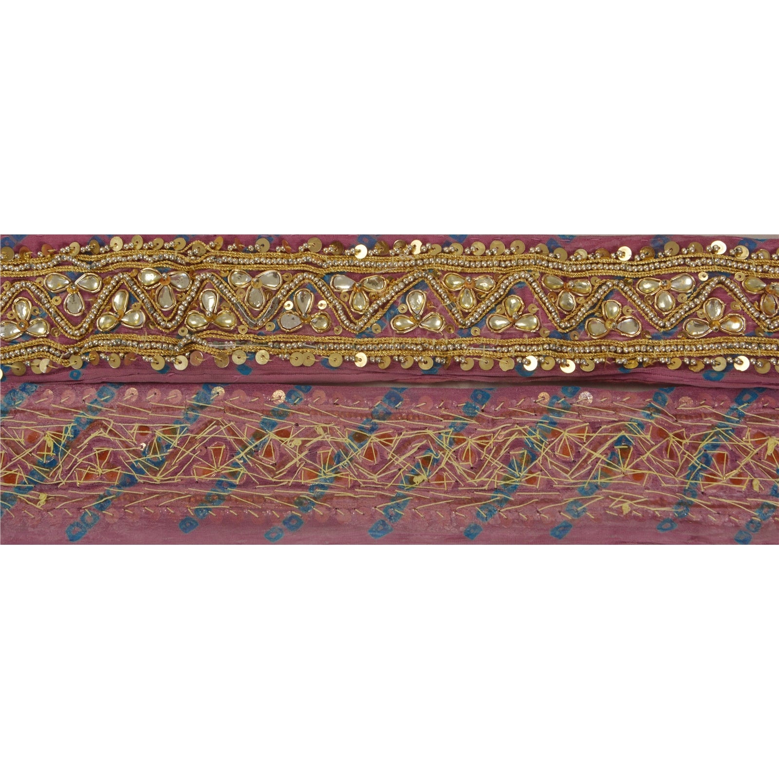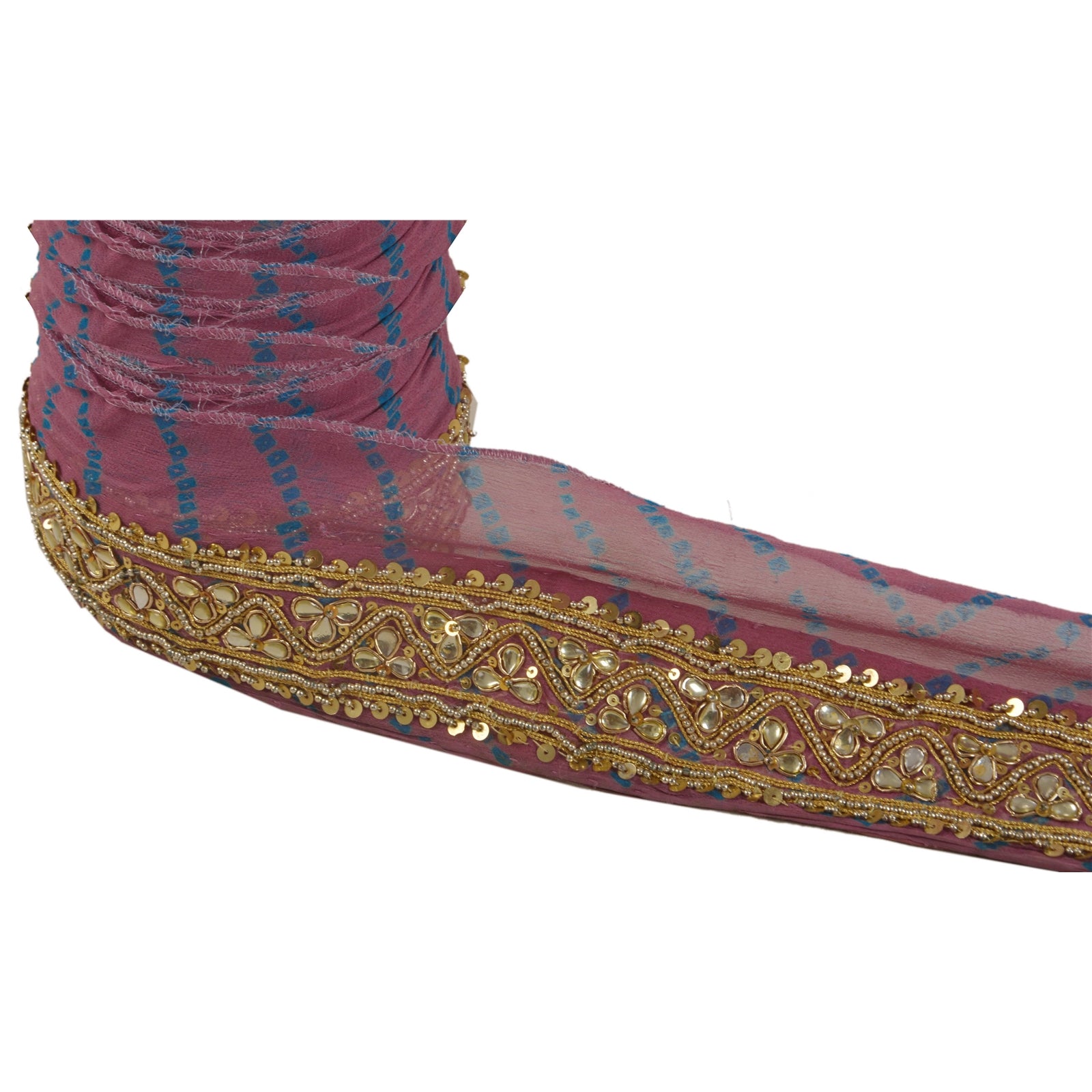Fabulous georgette hand beaded Bandhani sari border in pink color highlighting kundan stone work. Border has beautiful floral patterns painstakingly hand beaded with kundan stone work, golden sequins and beads work. Further you can see fine detailing with golden dori work. WOW!! an awesome one of a kind versatile border. 1 Quantity =1 Yard