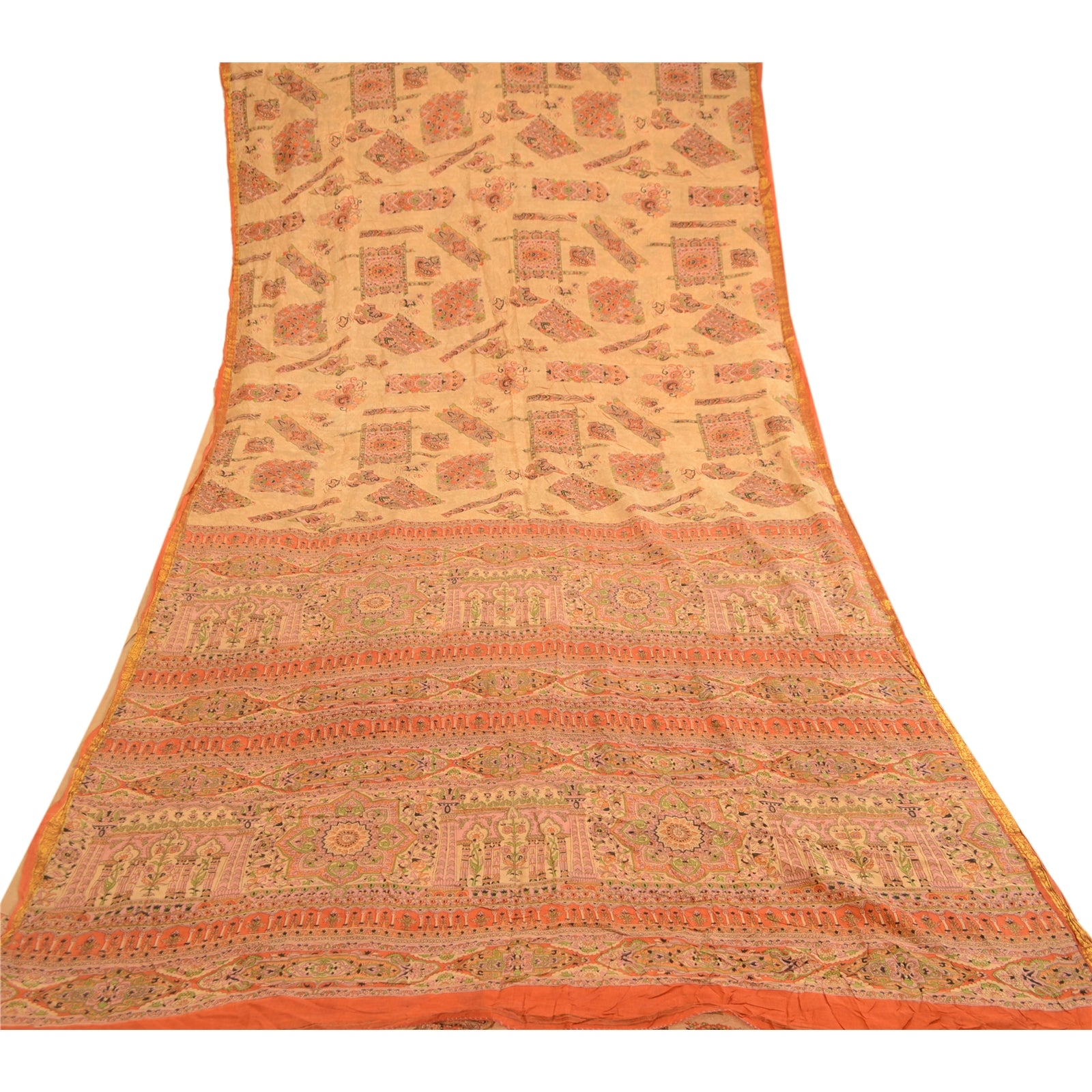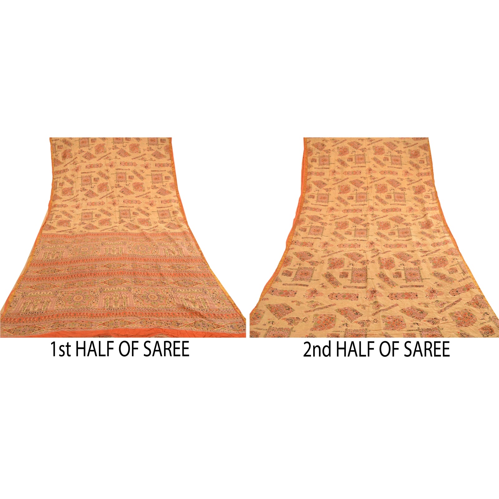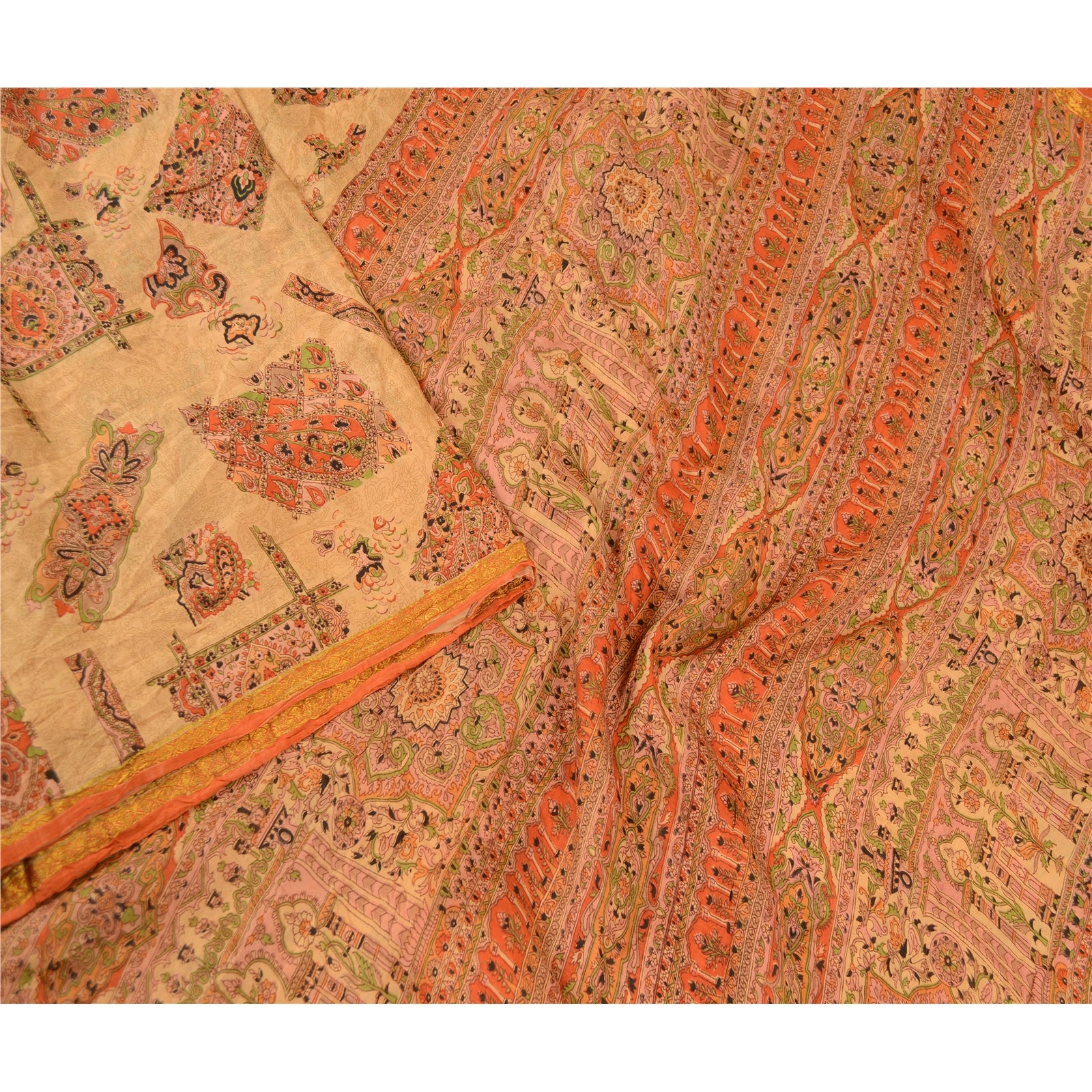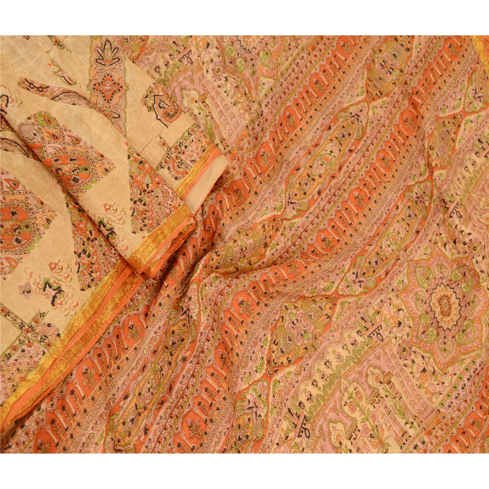 Beautiful beige & orange colored pure silk printed saree. Pallu & border has printed floral design. Similar design in center part of saree. What is special about this saree? Fabulous design is really enhancing the beauty of the saree.This unique vintage saree can be used for various crafting ideas even if you don't want to use it as a sari. Design a dress, use it as window,dressing, upholstery, sarongs, throw, dress making and table linen much more. Let your creative juices flow and use this decorated Sustainable Fabric in multiple fashion.