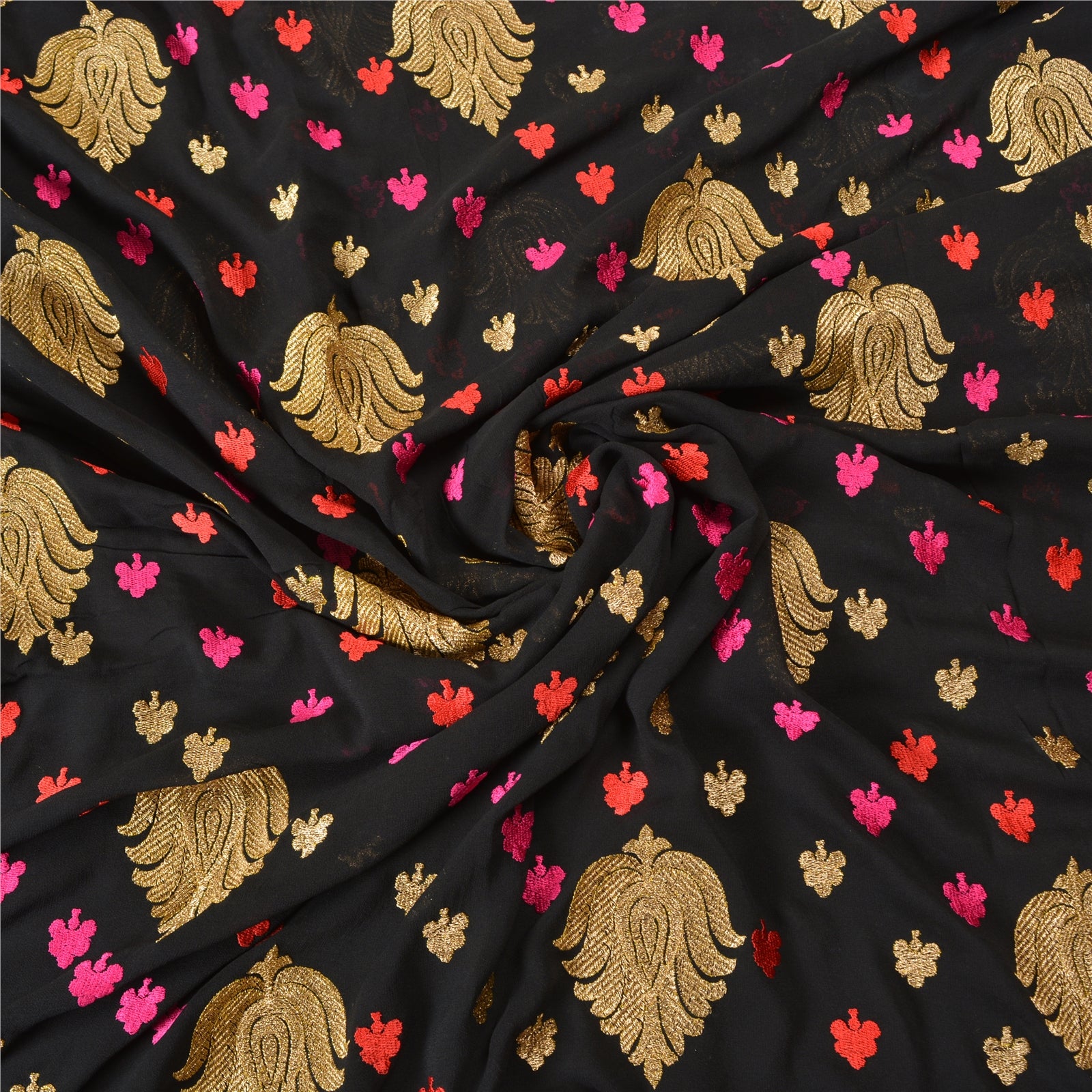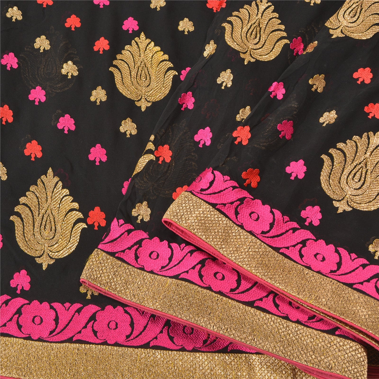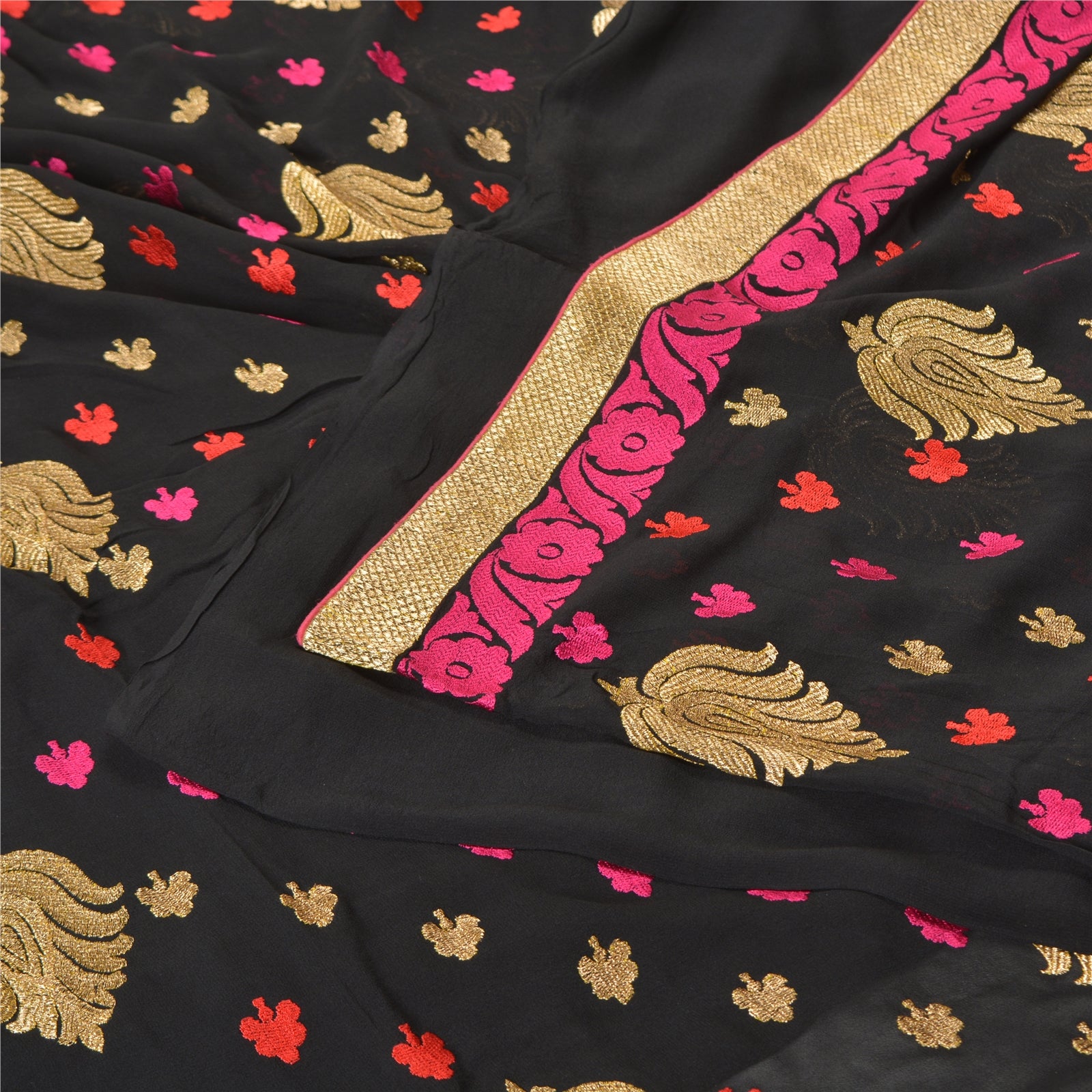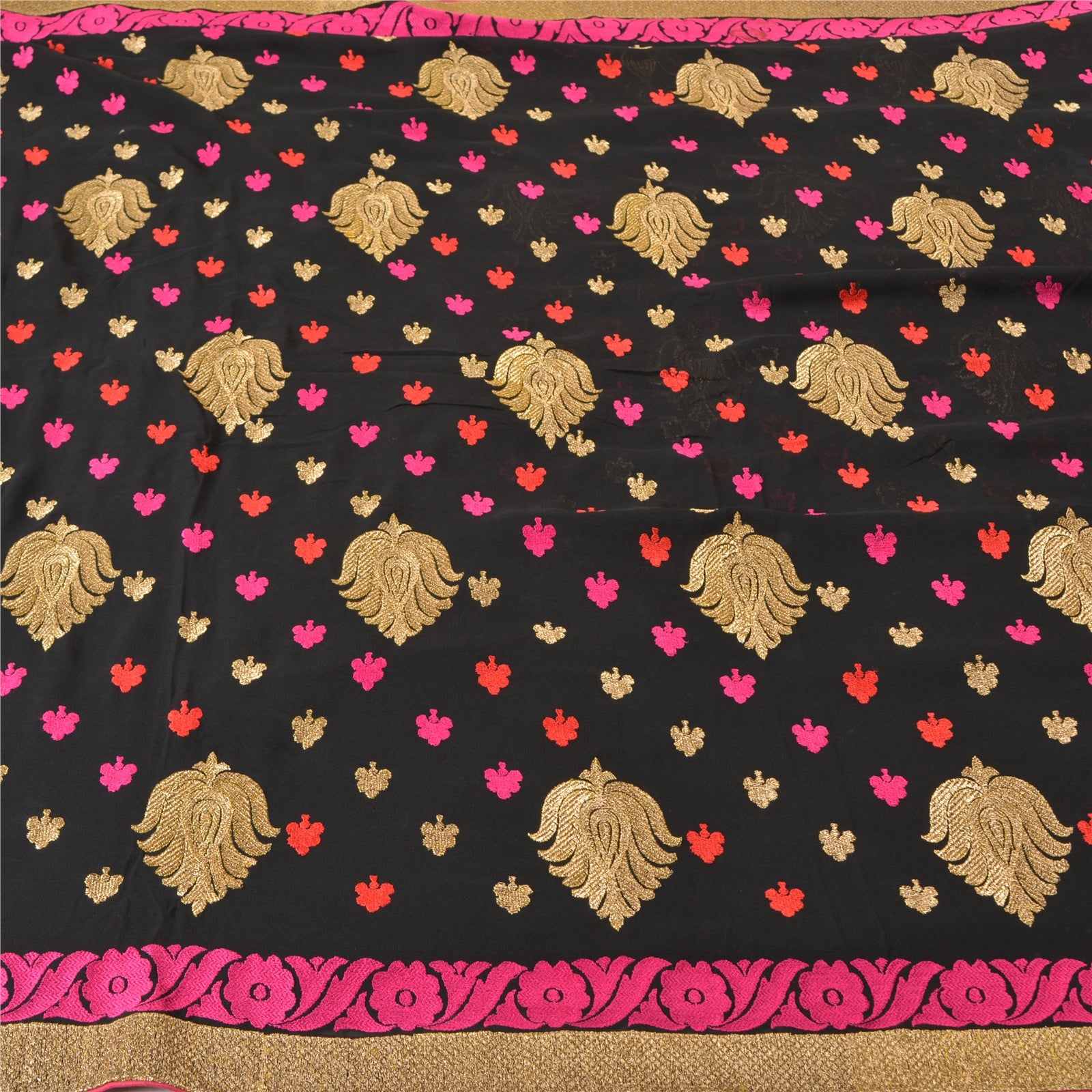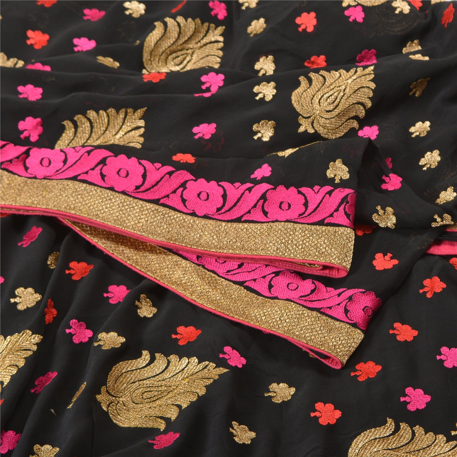 'THE ITEM COLOR OR SHADE MAY BE DARKER OR LIGHTER THAN THE PICTURE.' Beautiful black colored 100% pure georgette embroidered sari. Border has golden/pink thread work with floral design. The center of the saree has similar embroidered thread work with floral design. This saree can be used for various crafting ideas too. Use it for dress designing, as a throw, as window dressing, upholstery, table linen and much more. Let your creative juices flow. 'International buyers please note: Import duties, taxes, and charges are not included in the item price or postage cost. These charges are the buyer's responsibility. Please check with your country's customs office to determine what these additional costs will be prior to bidding or buying. Buyer will pay custom duty/tax. It is calculated and charged differently by every country. As a seller I do not have any control over it. VAT or sales tax is calculated by the platform at the time of checkout. Customs charge is payable at the time of delivery.'