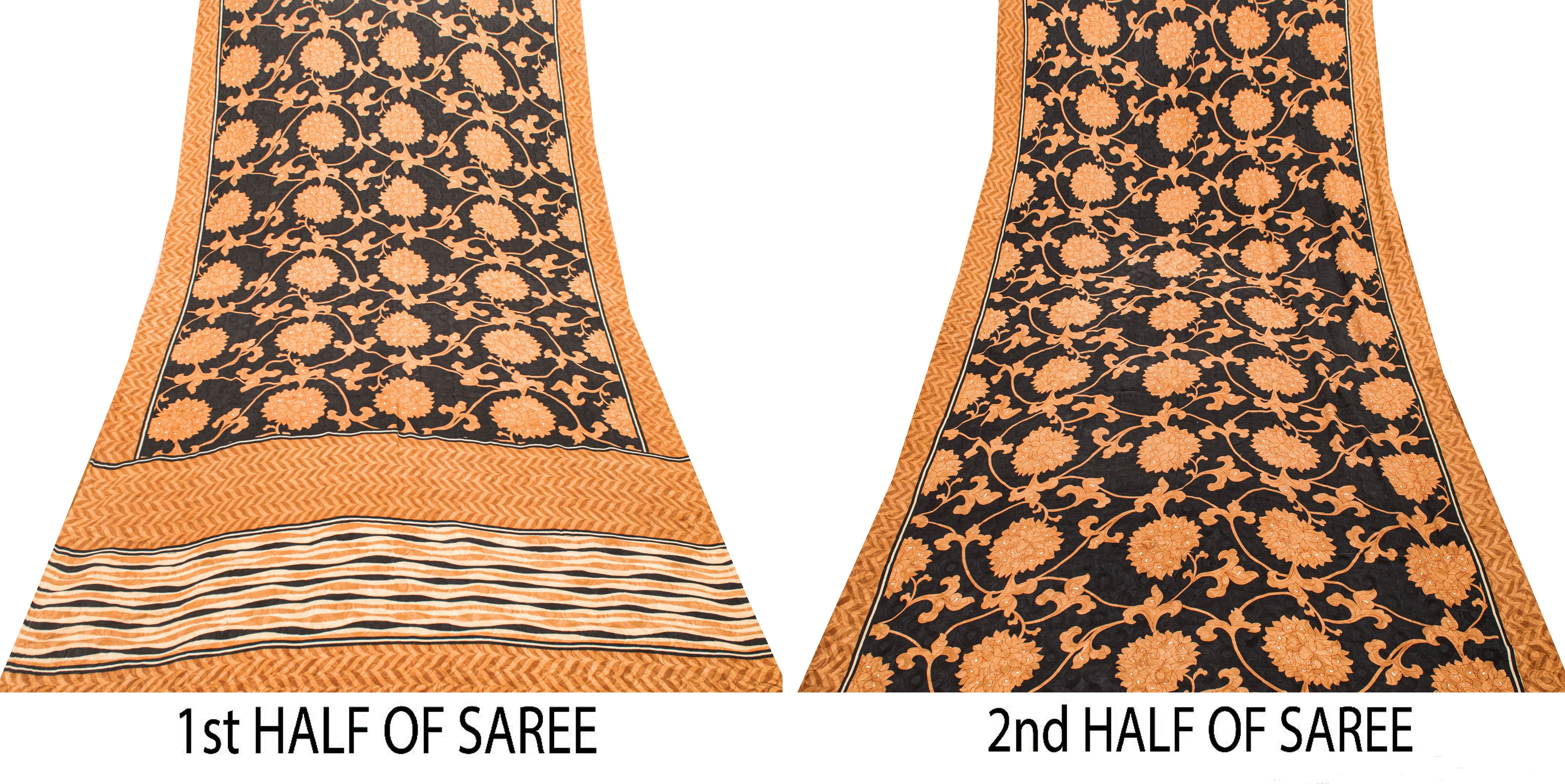 Sanskriti Vintage Black-Brown Pure Crepe Sarees Printed Woven Sari 5.5YD Fabric