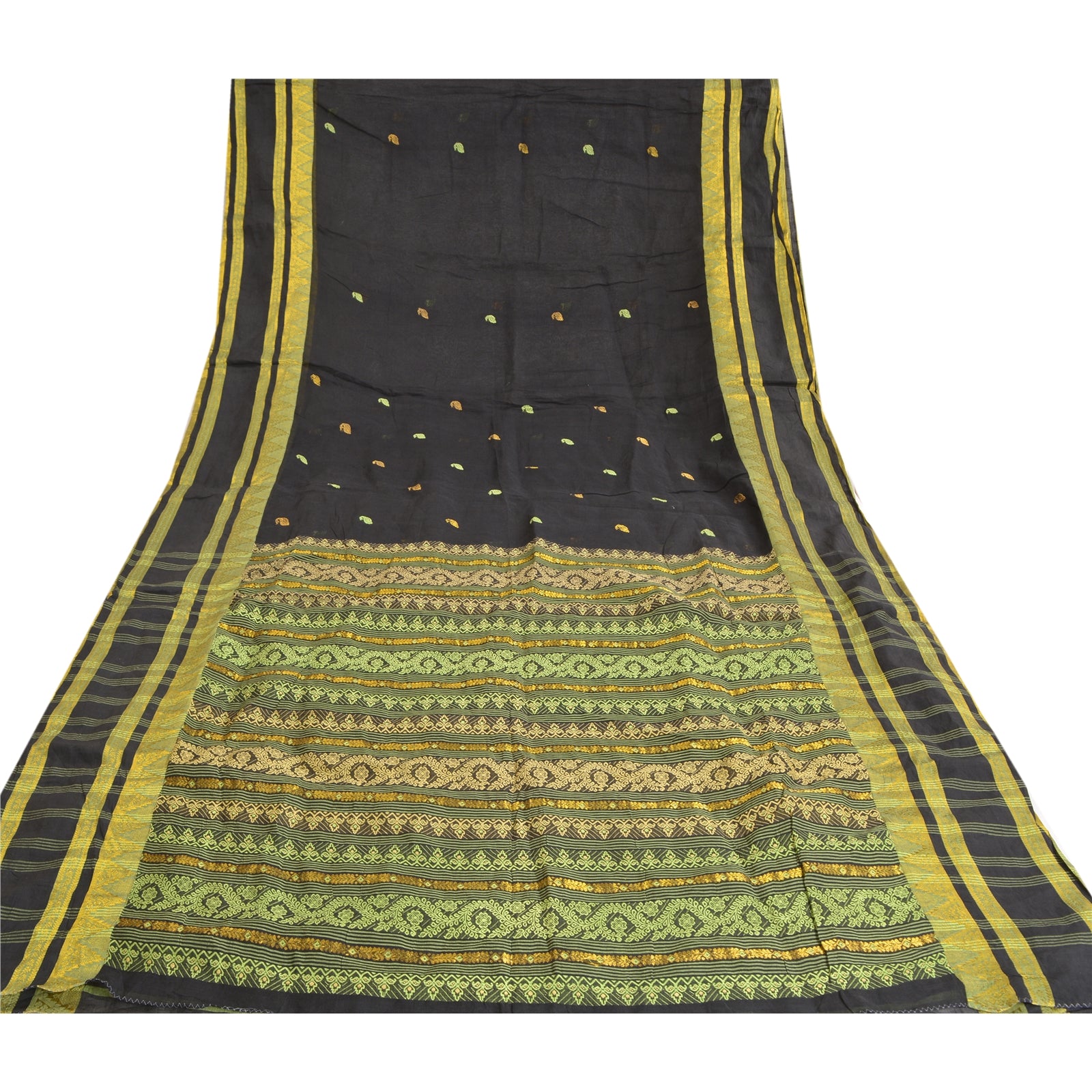 'THE ITEM COLOR OR SHADE MAY BE DARKER OR LIGHTER THAN THE PICTURE.' Beautiful black colored 100% pure cotton woven sari. Pallu & Border has green woven thread & shinning golden zari work with floral & zig- zag design. The center of the saree woven work with paisley motifs. This saree can be used for various crafting ideas too. Use it for dress designing, as a throw, as window dressing, upholstery, table linen and much more. Let your creative juices flow. 'International buyers please note: Import duties, taxes, and charges are not included in the item price or postage cost. These charges are the buyer's responsibility. Please check with your country's customs office to determine what these additional costs will be prior to bidding or buying. Buyer will pay custom duty/tax. It is calculated and charged differently by every country. As a seller I do not have any control over it. VAT or sales tax is calculated by the platform at the time of checkout. Customs charge is payable at the time of delivery.'