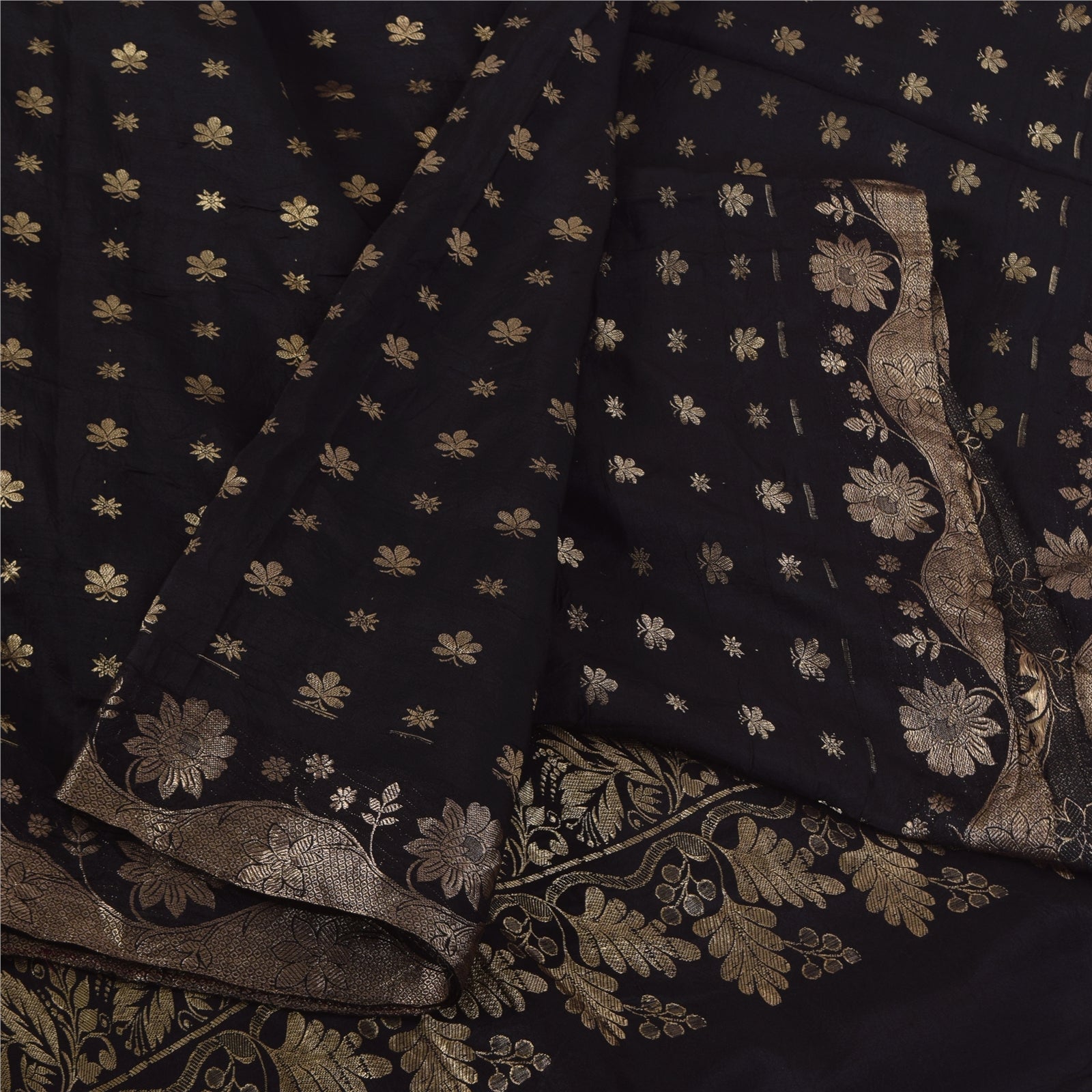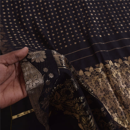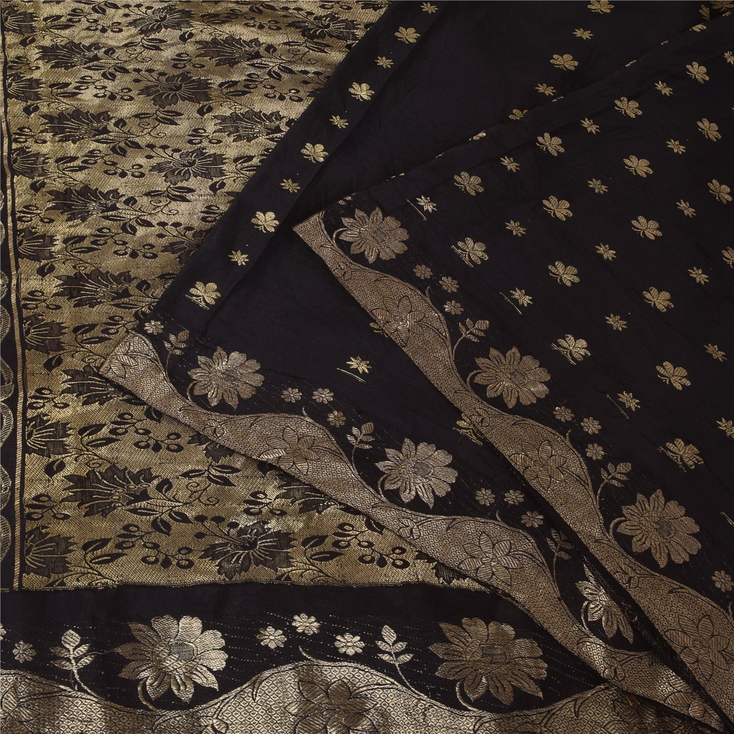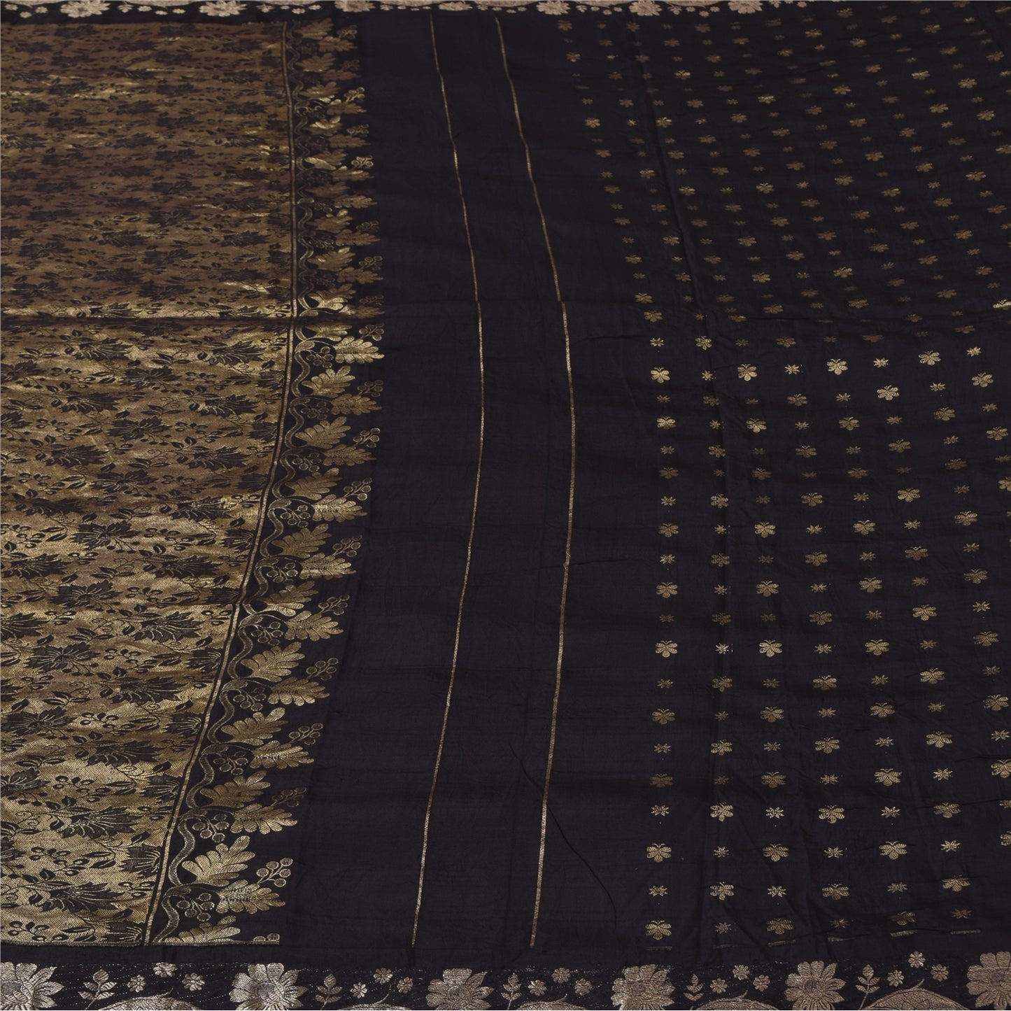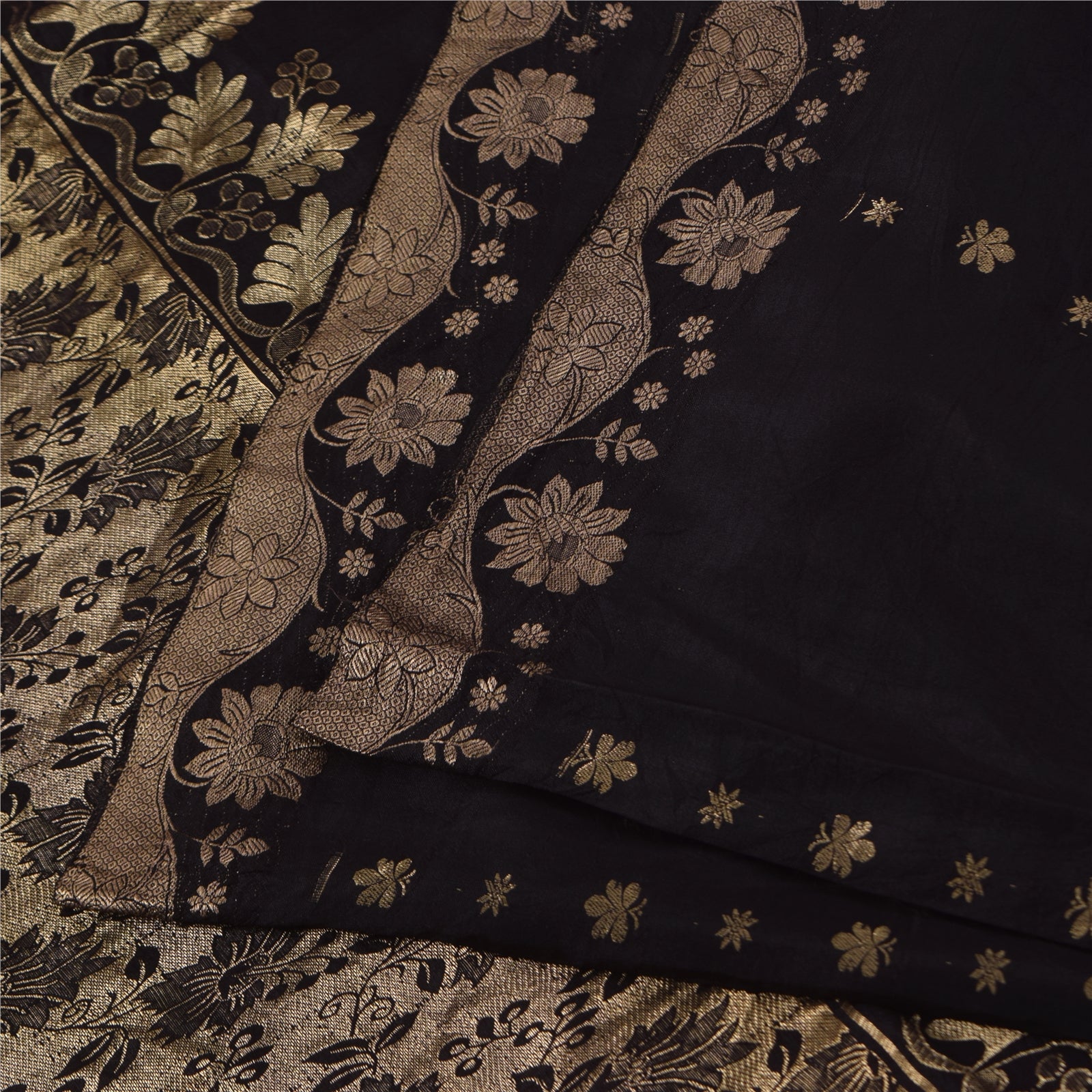 Sanskriti Vintage Black Sarees Pure Silk Brocade/Banarasi Woven Sari 5+yd Sustainable Fabric