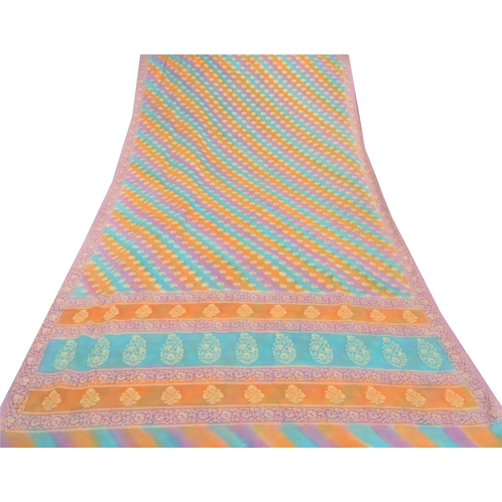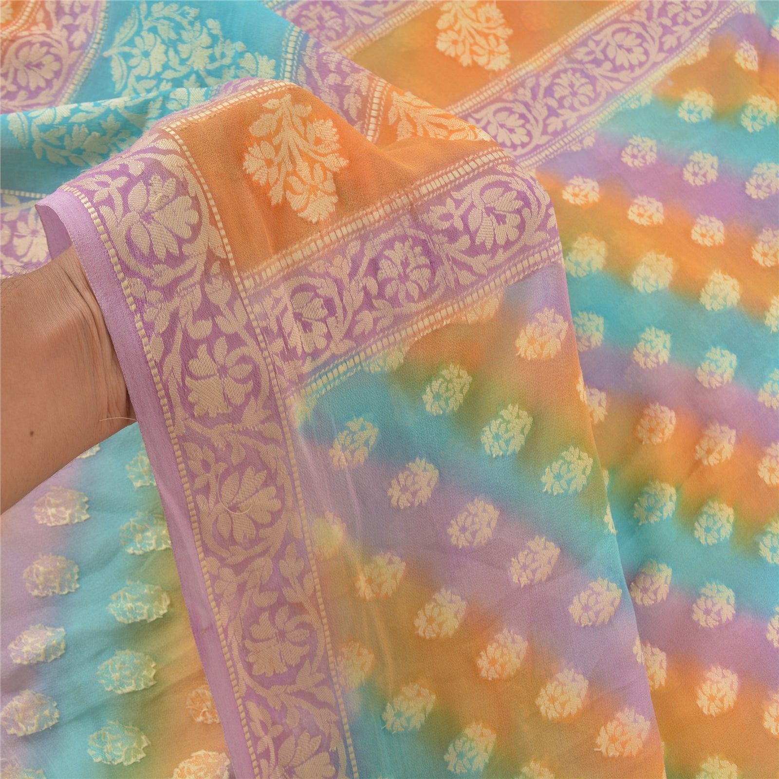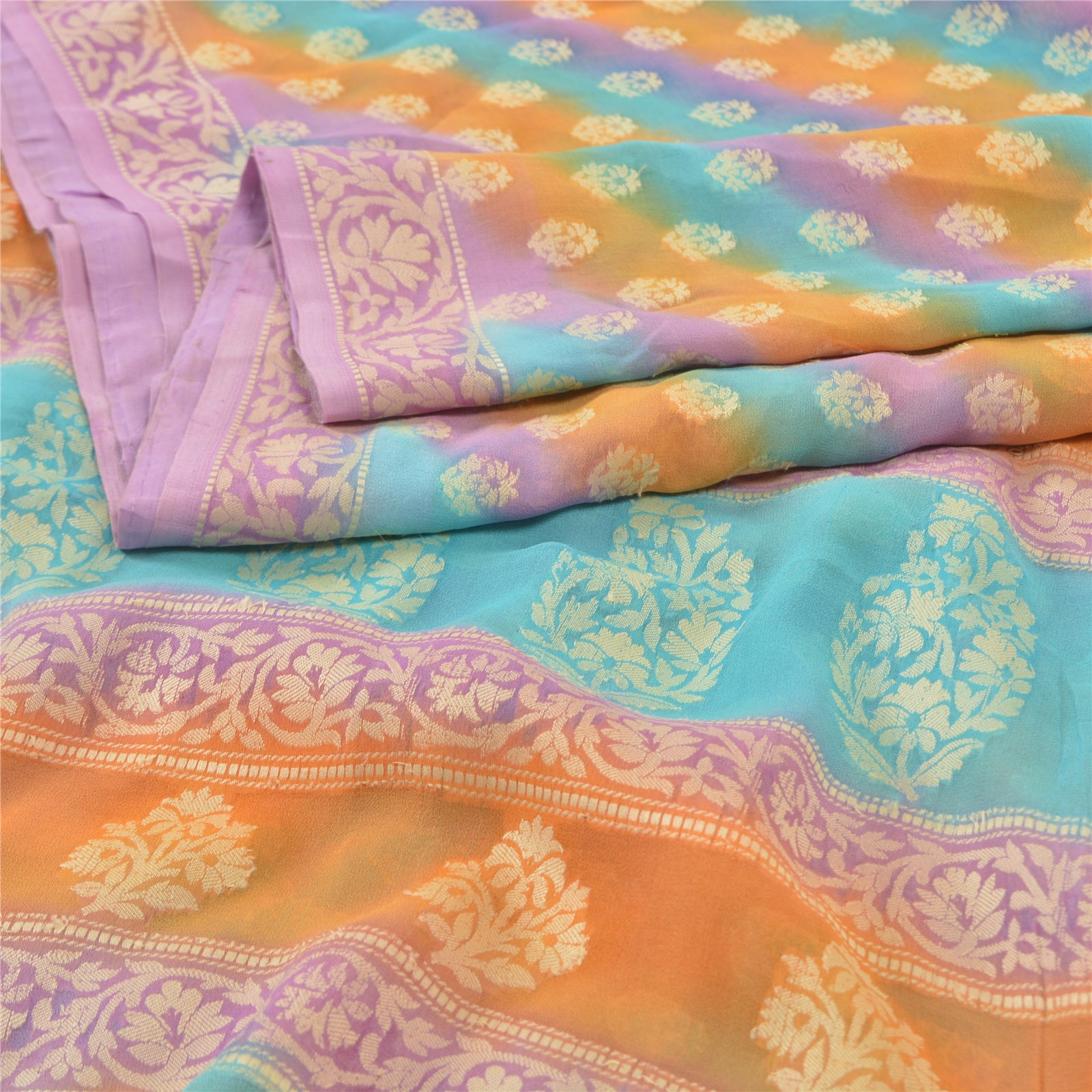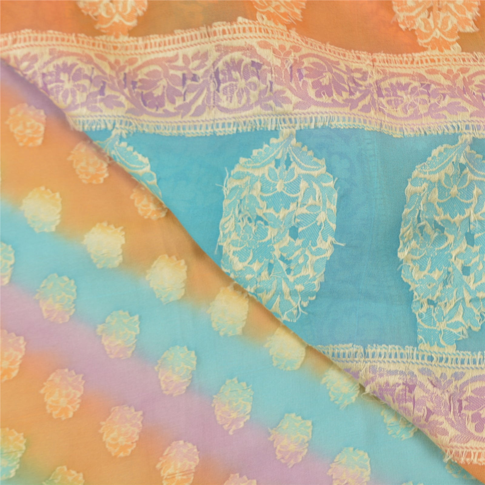 Beautiful Multi Color Colored 100% Pure Georgette Silk Hand-Woven Sari. Pallu & Border features is hand-woven cream thread work with floral design. Center part of the sari has similar woven floral design. This saree can be used for various crafting ideas too. Use it for dress designing, as a throw, as window dressing, upholstery, table linen and much more. Let your creative juices flow. For USA buyers - Single item ships via registered air mail, buy 1 more to get FedEx.