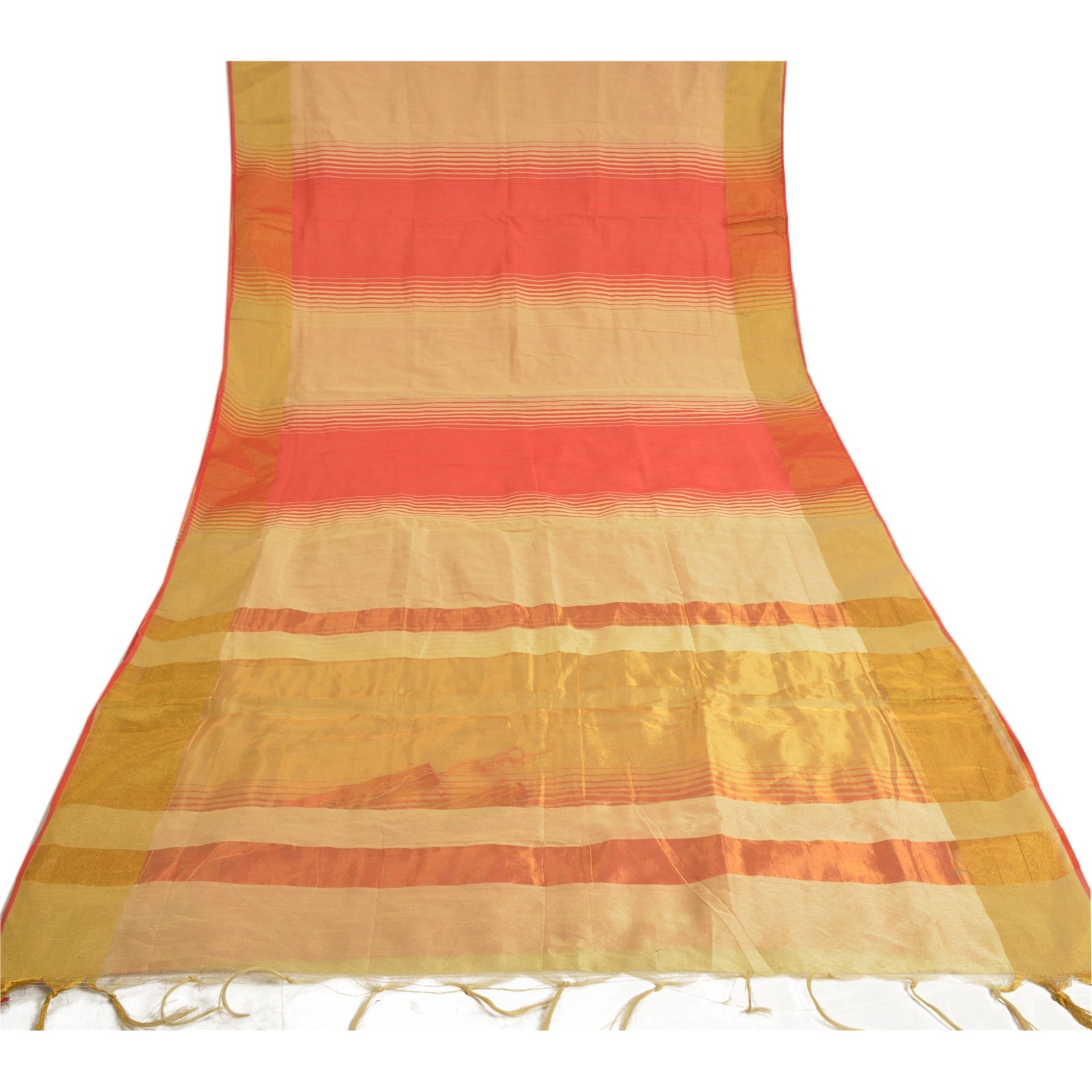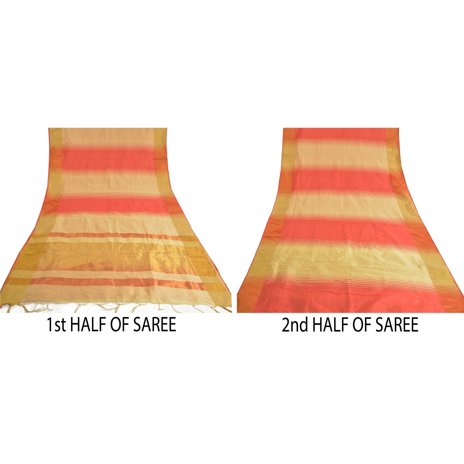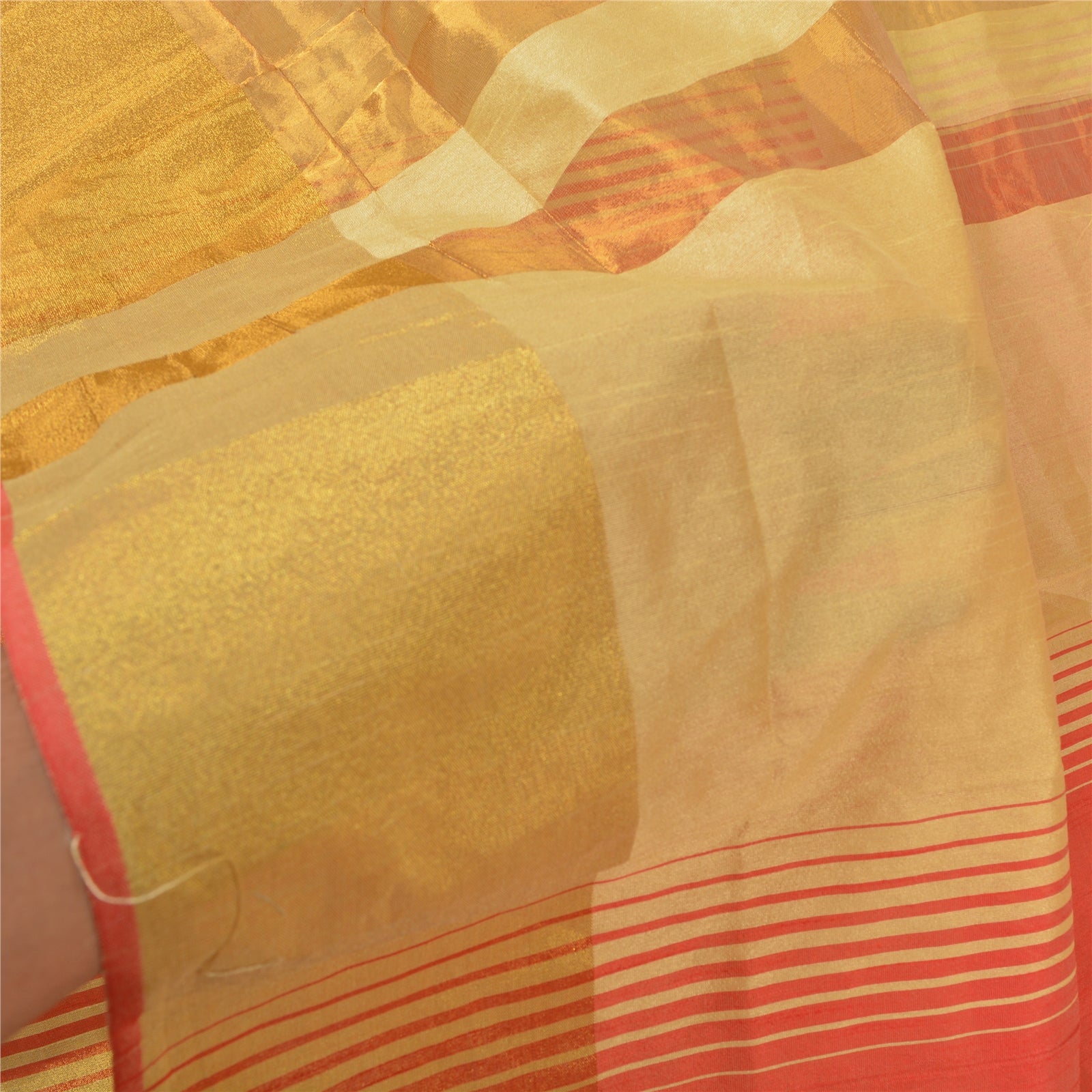 Beautiful cream & golden colored 100% pure silk hand embroidered woven sari. Pallu & Border has shinning golden woven work. You can see matching fringes on pallu. The center of the saree has red woven lines design. This saree can be used for various crafting ideas too. Use it for dress designing, as a throw, as window dressing, upholstery, table linen and much more. Let your creative juices flow.