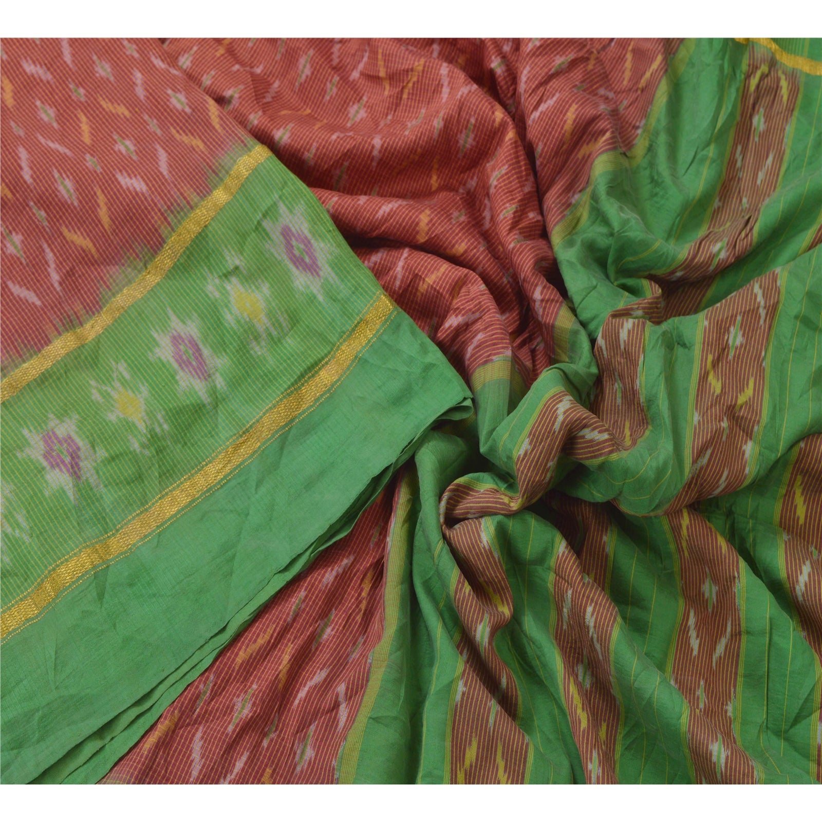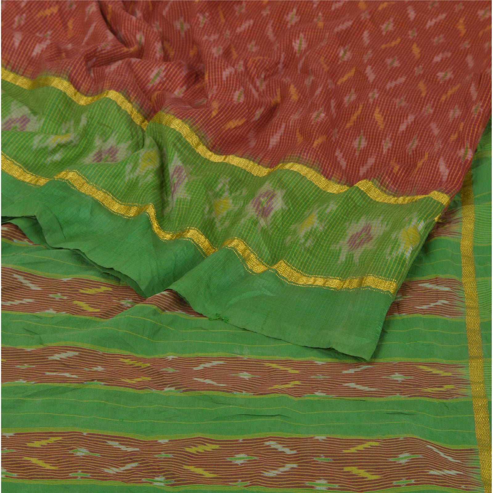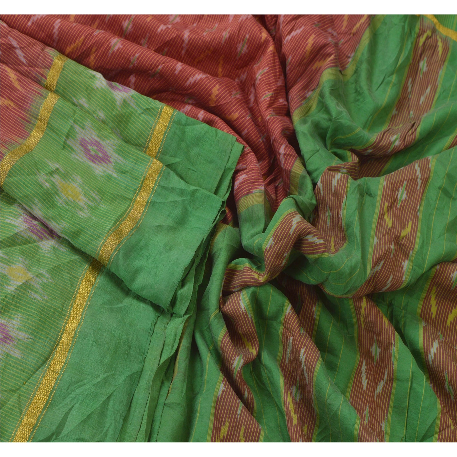 Beautiful Dark Red & Green Colored Woven Pochampally Ikat Saree 100% Pure Silk Base Sustainable Fabric Pallu & Border has floral design with multi color ikat woven work. Golden zari woven work on borders. The center part of sari boasts similar woven work. This unique vintage saree can be used for various crafting ideas even if you don't want to use it as a sari. Design a dress, use it as a throw, as window dressing, upholstery, sarongs, table linen and much more. Let your creative juices flow and use this decorated Sustainable Fabric in multiple fashion.