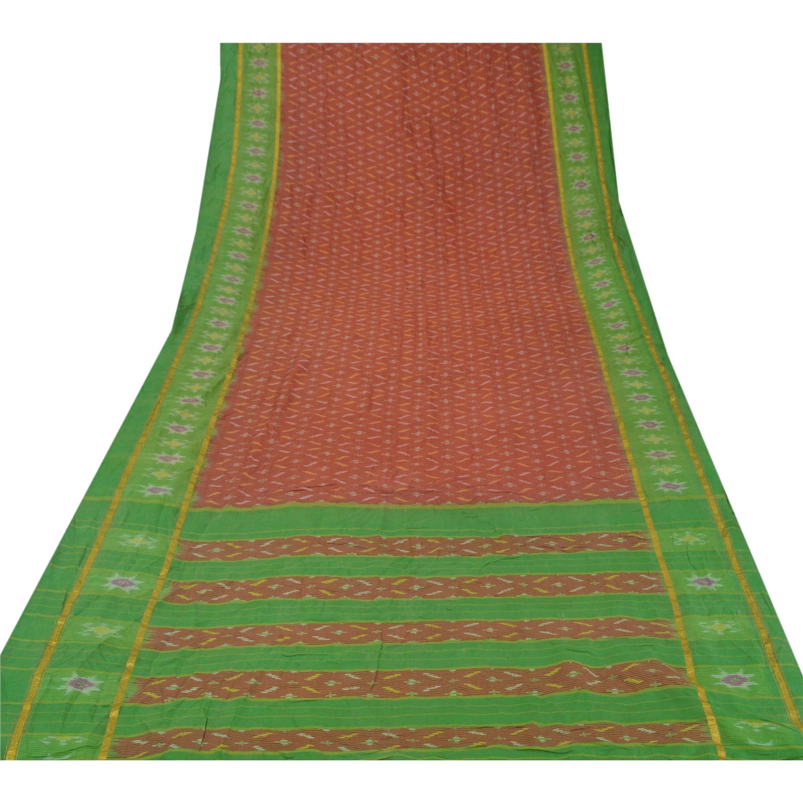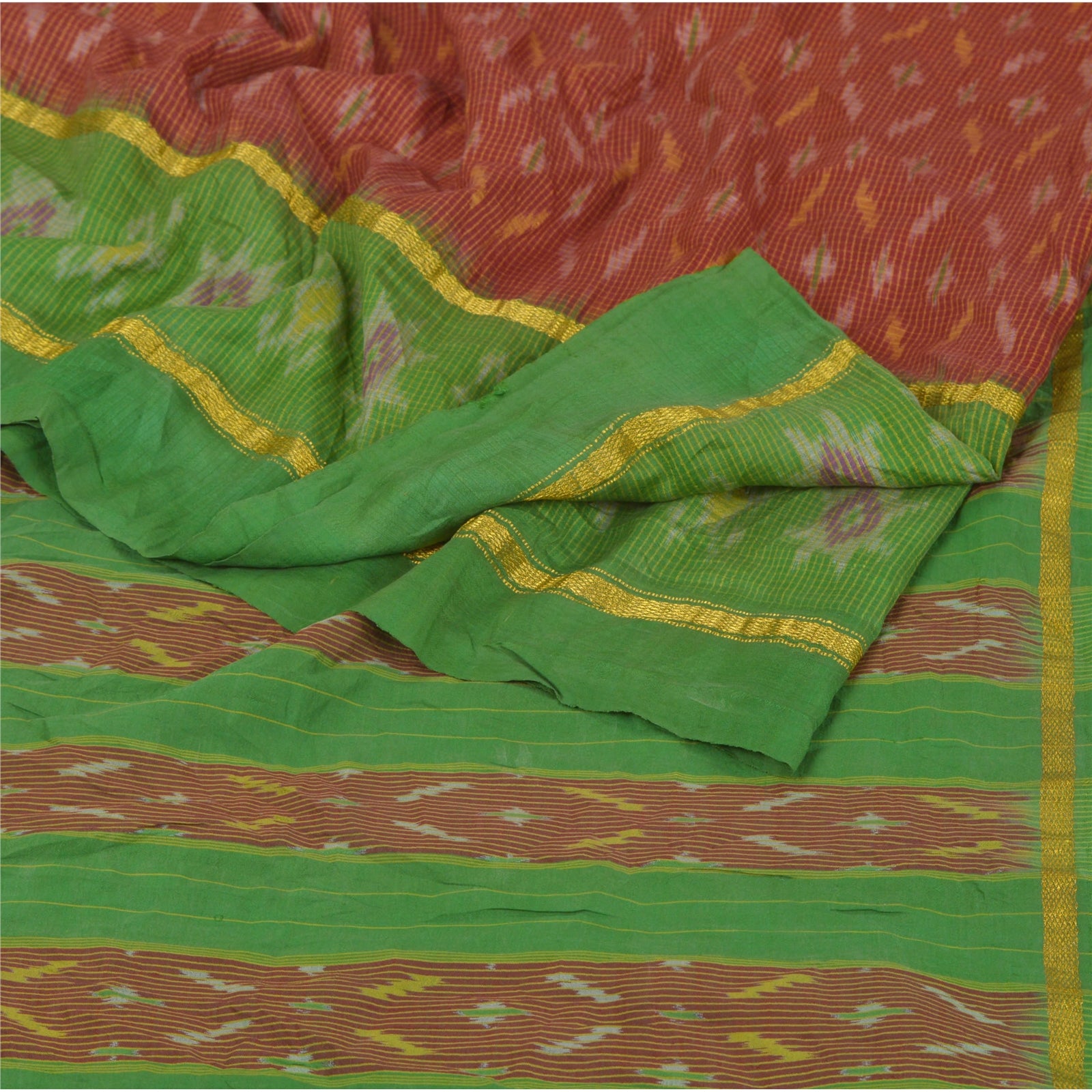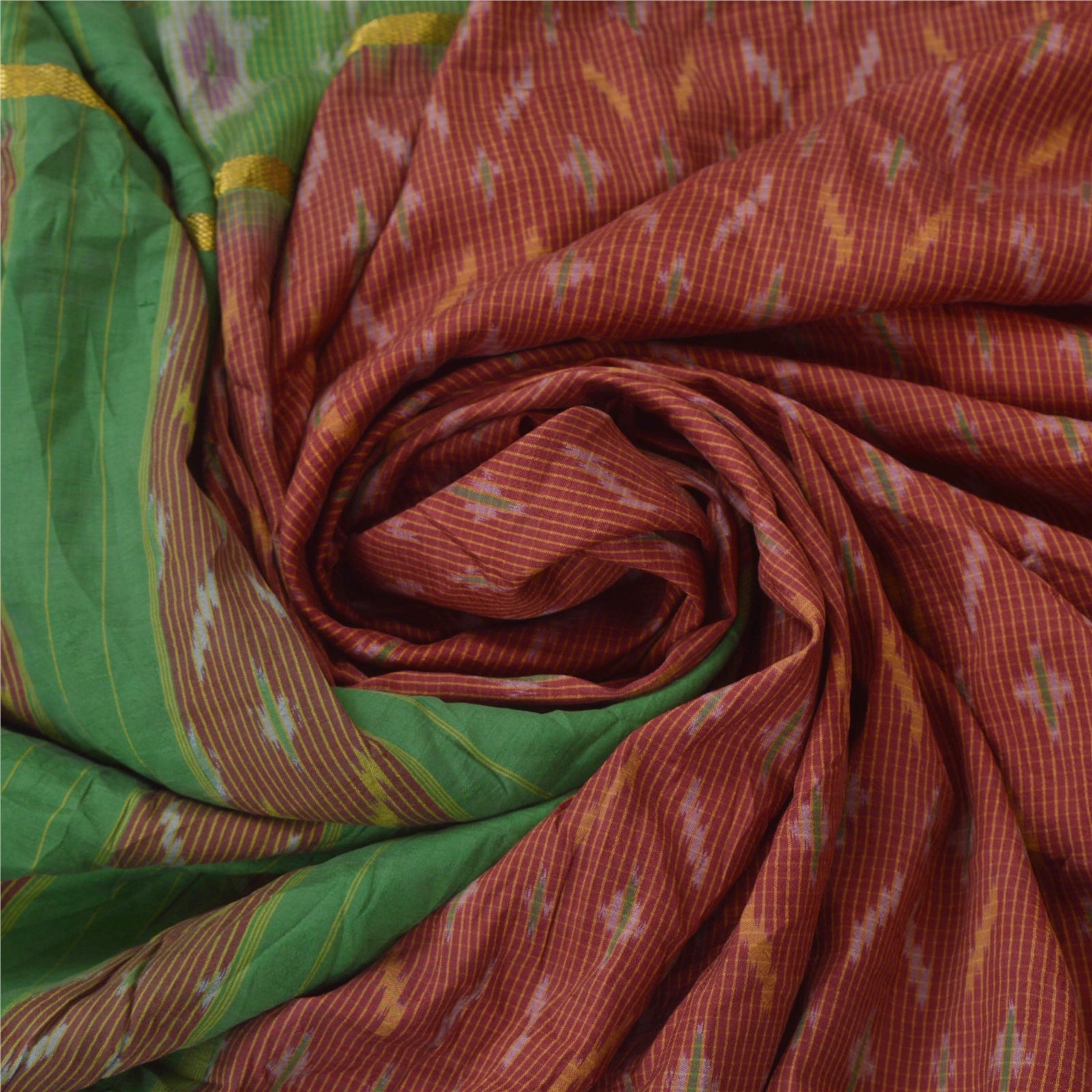 Beautiful Dark Red & Green Colored Woven Pochampally Ikat Saree 100% Pure Silk Base Sustainable Fabric Pallu & Border has floral design with multi color ikat woven work. Golden zari woven work on borders. The center part of sari boasts similar woven work. This unique vintage saree can be used for various crafting ideas even if you don't want to use it as a sari. Design a dress, use it as a throw, as window dressing, upholstery, sarongs, table linen and much more. Let your creative juices flow and use this decorated Sustainable Fabric in multiple fashion.