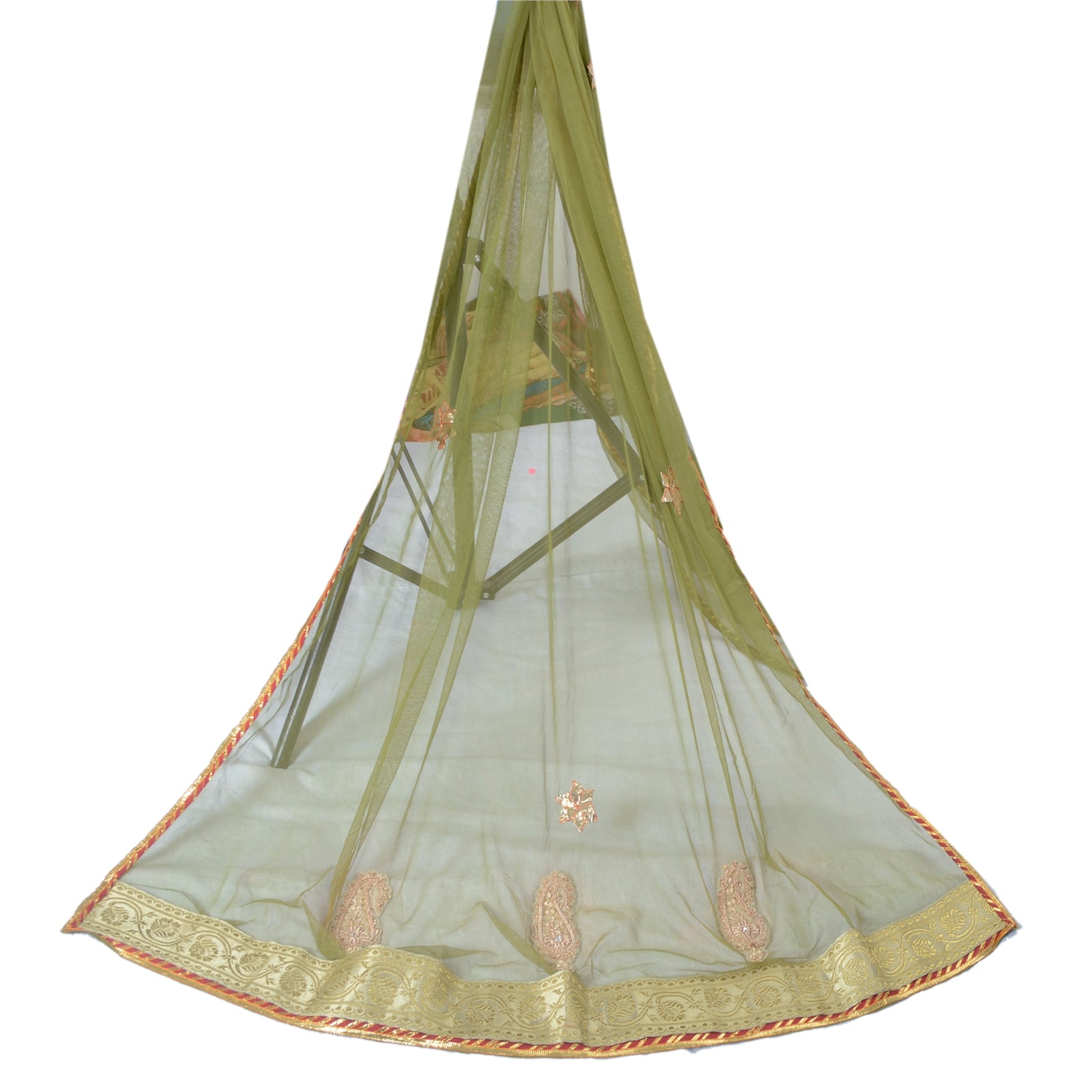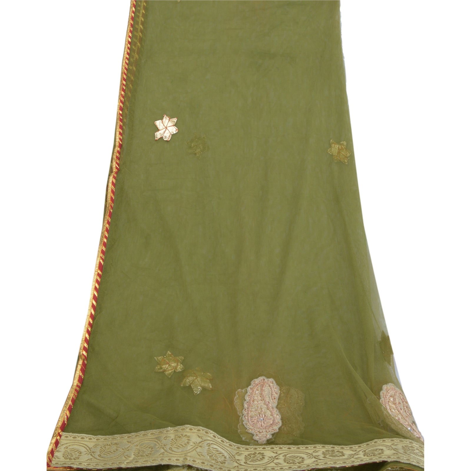 THE ITEM COLOR OR SHADE MAY BE DARKER OR LIGHTER THAN THE PICTURE. Beautiful green colored net hand embroidered long scarf/dupatta. The center portion has embroidered floral & paisley patterns with gold zardozi/dabka work, yellow glass beads, white rhinestone, cream fabric patch work . Also you can see golden gota work. Both sides of the dupatta has golden woven lace work and adorned red fabric patch with golden lace work on borders . International buyers please note: Import duties, taxes, and charges are not included in the item price or postage cost. These charges are the buyer's responsibility. Please check with your country's customs office to determine what these additional costs will be prior to bidding or buying. Buyer will pay custom duty/tax. It is calculated and charged differently by every country. As a seller I do not have any control over it. VAT or sales tax is calculated by the platform at the time of checkout. Customs charge is payable at the time of delivery.'