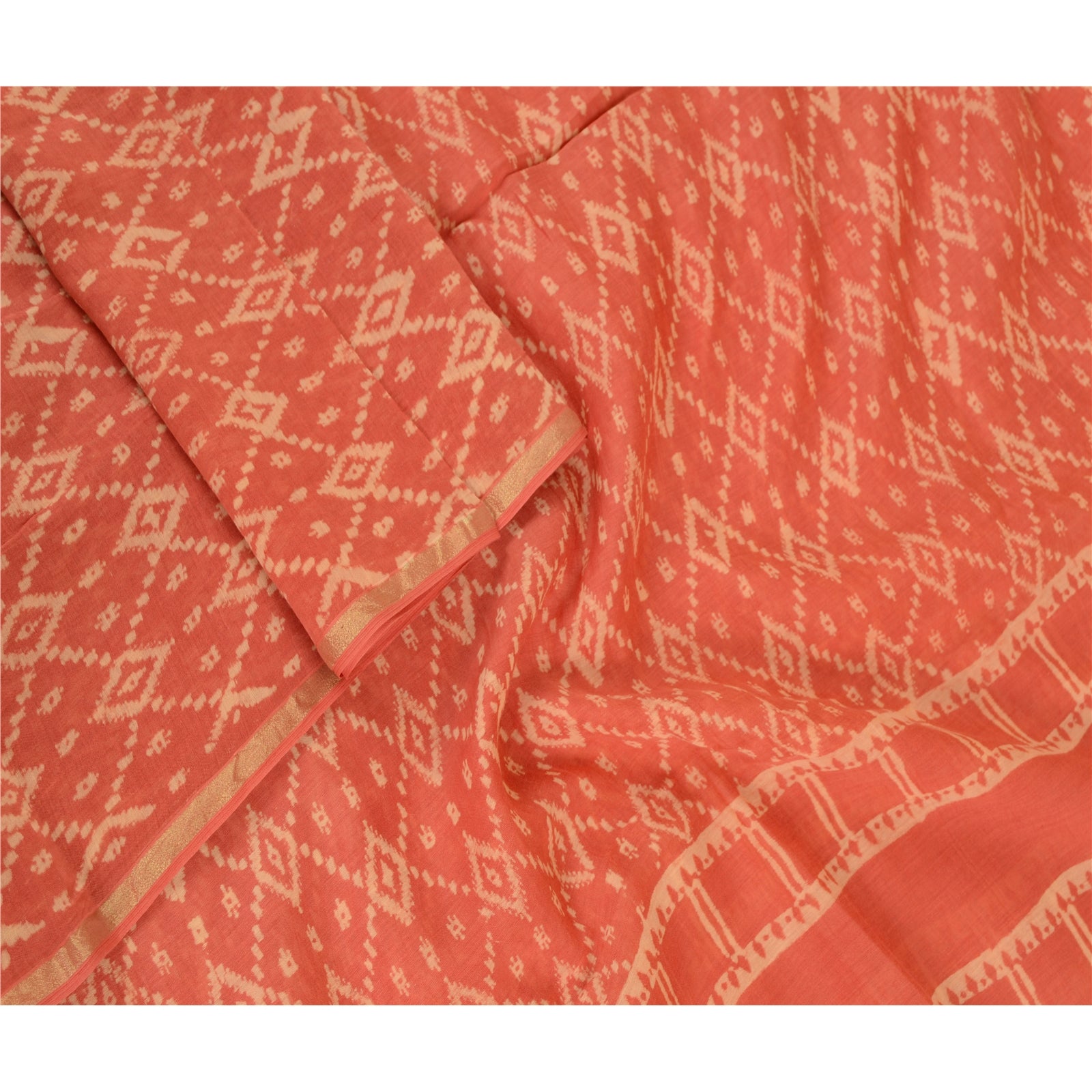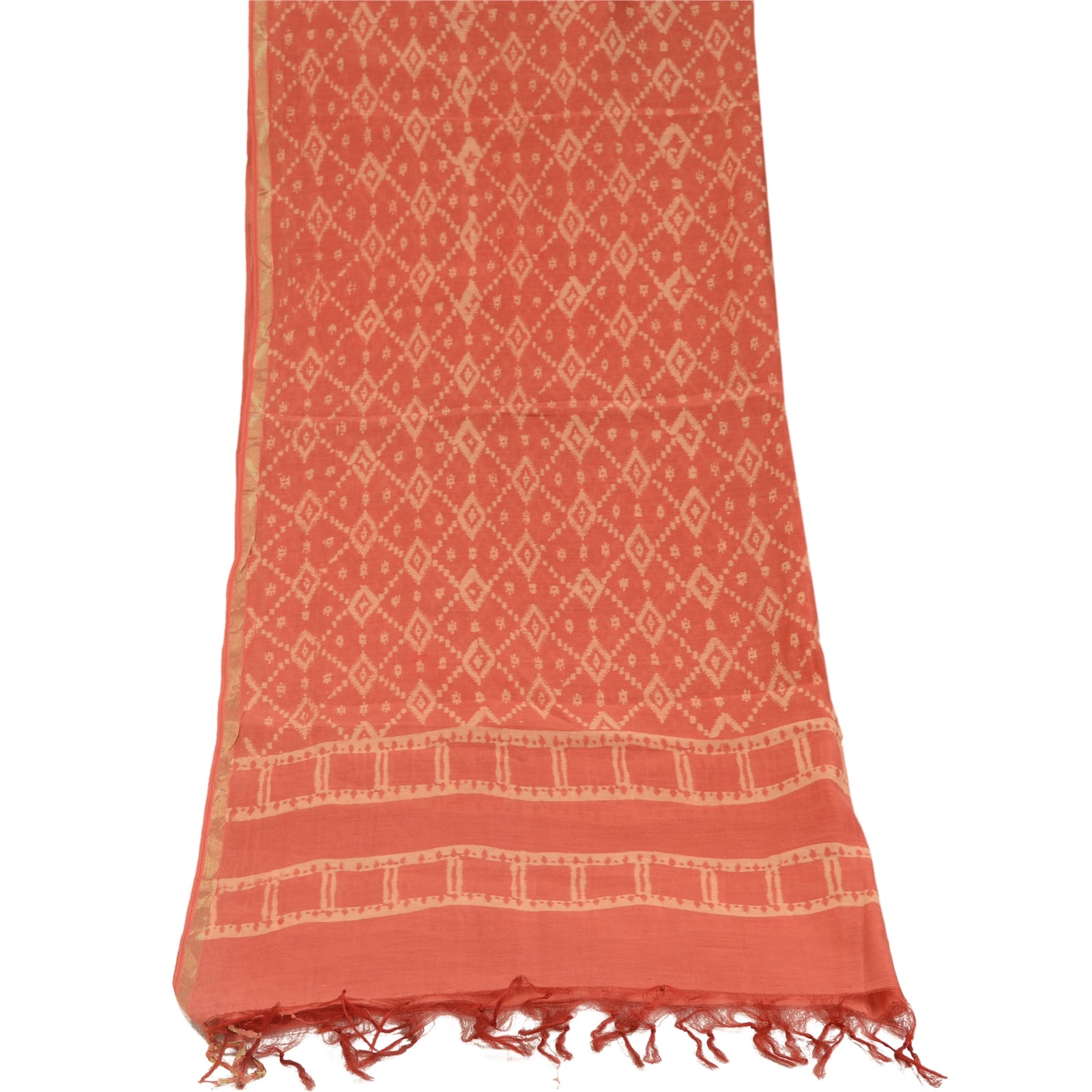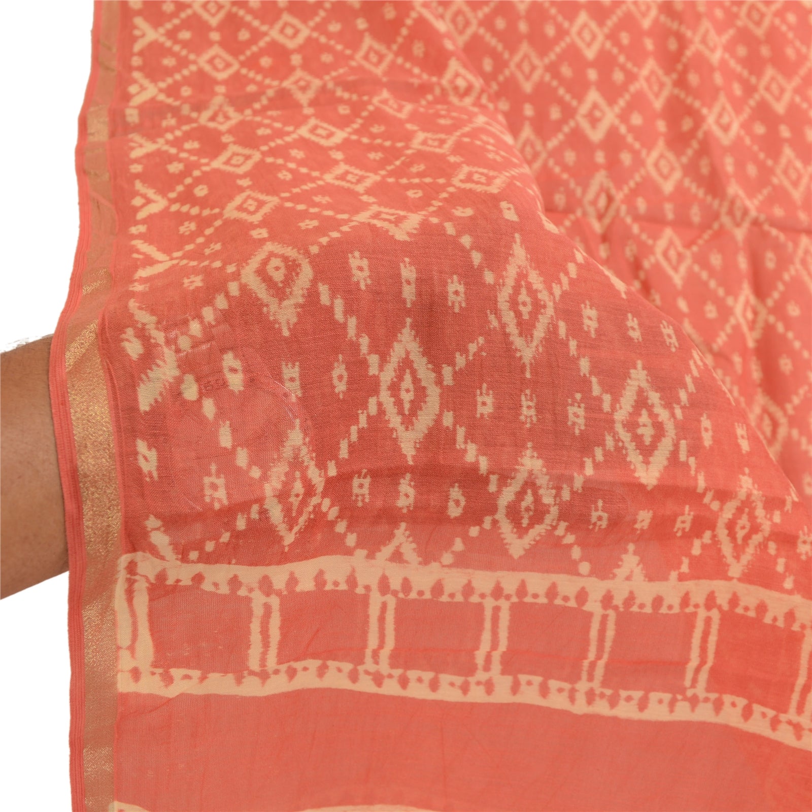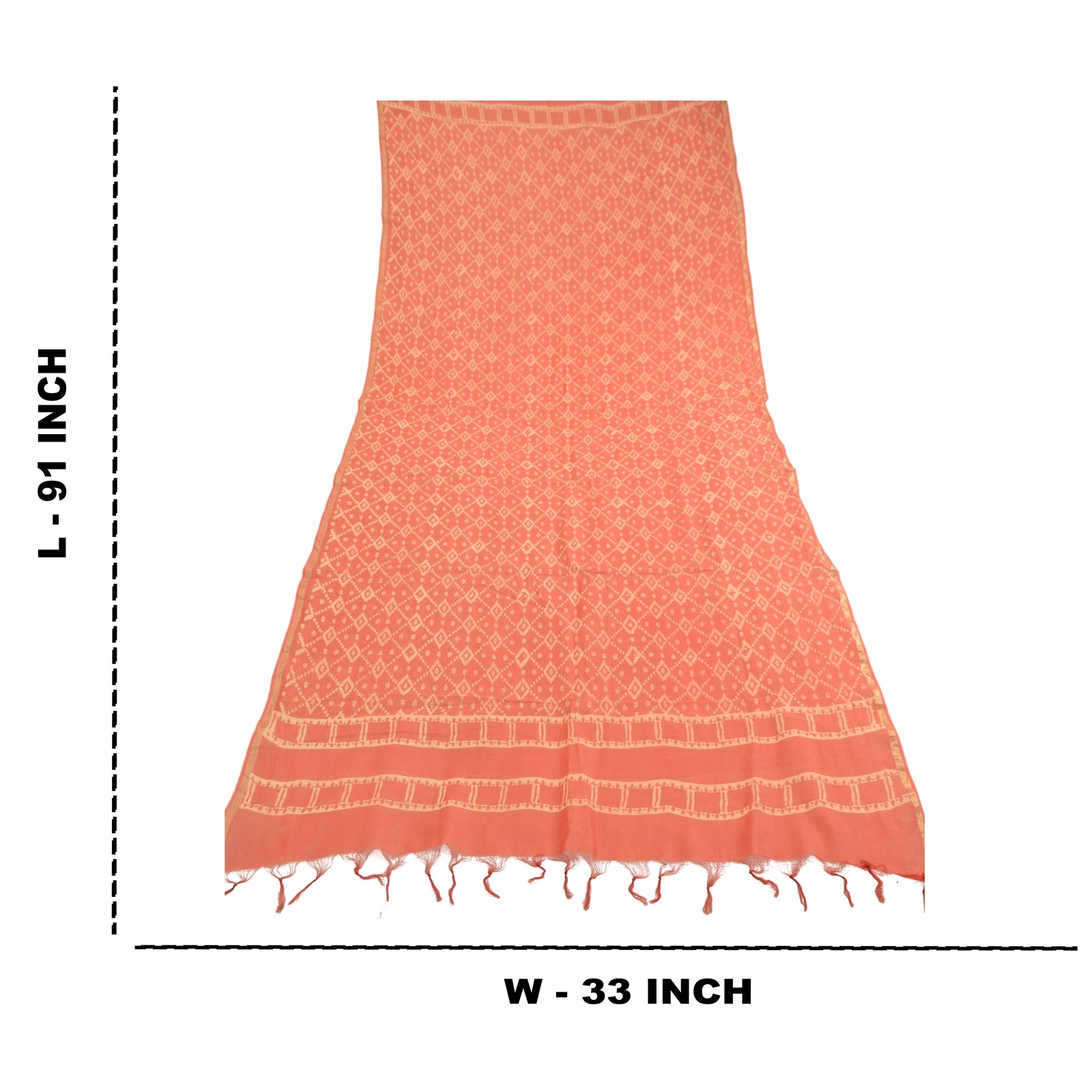 Beautiful shade of peach colored pure chanderi silk printed long scarf/dupatta. Center portion of the dupatta printed abstract design. Border has printed floral pattern with soft base Sustainable Fabric is really enhancing beauty of the dupatta/stole. This dupatta/stole can be used for various crafting ideas too. Use it for dress designing, as a throw, as window dressing, upholstery, table linen and much more. Let your creative juices flow.