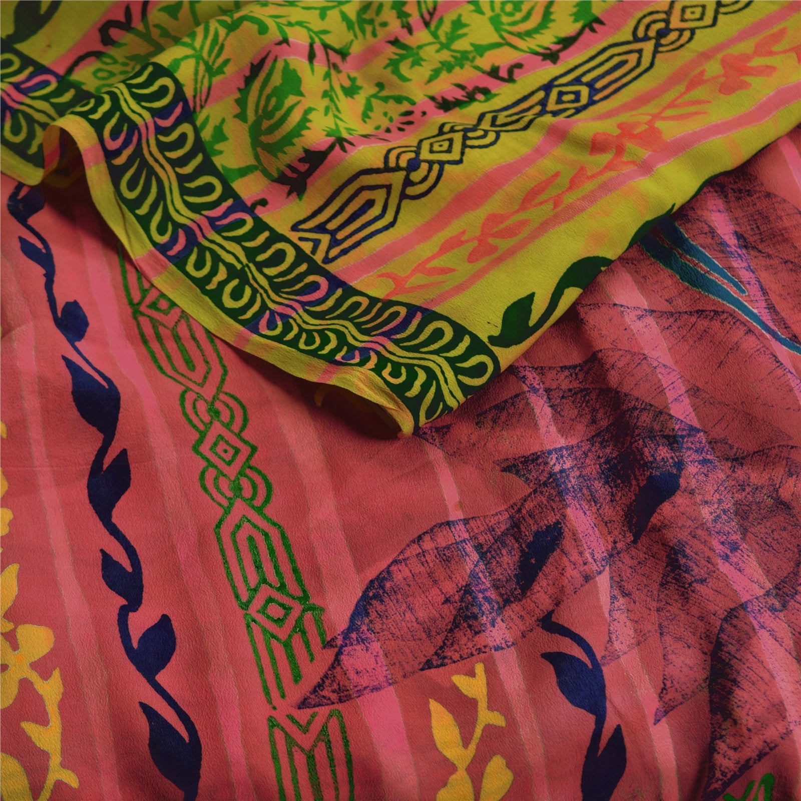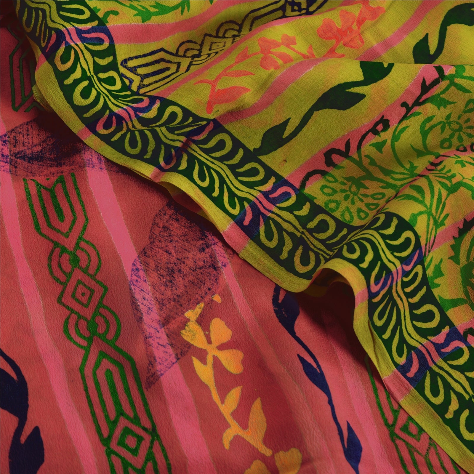 Nice green & pink colored 100% pure crepe silk printed sari. Pallu & Border has printed floral design. Floral design in center part of sari. This unique vintage saree can be used for various crafting ideas even if you don't want to use it as a sari. Design a dress, use it as a as window dressing, upholstery, sarongs, throw, dress making and table linen much more. Let your creative juices flow and use this decorated Sustainable Fabric in multiple fashion.