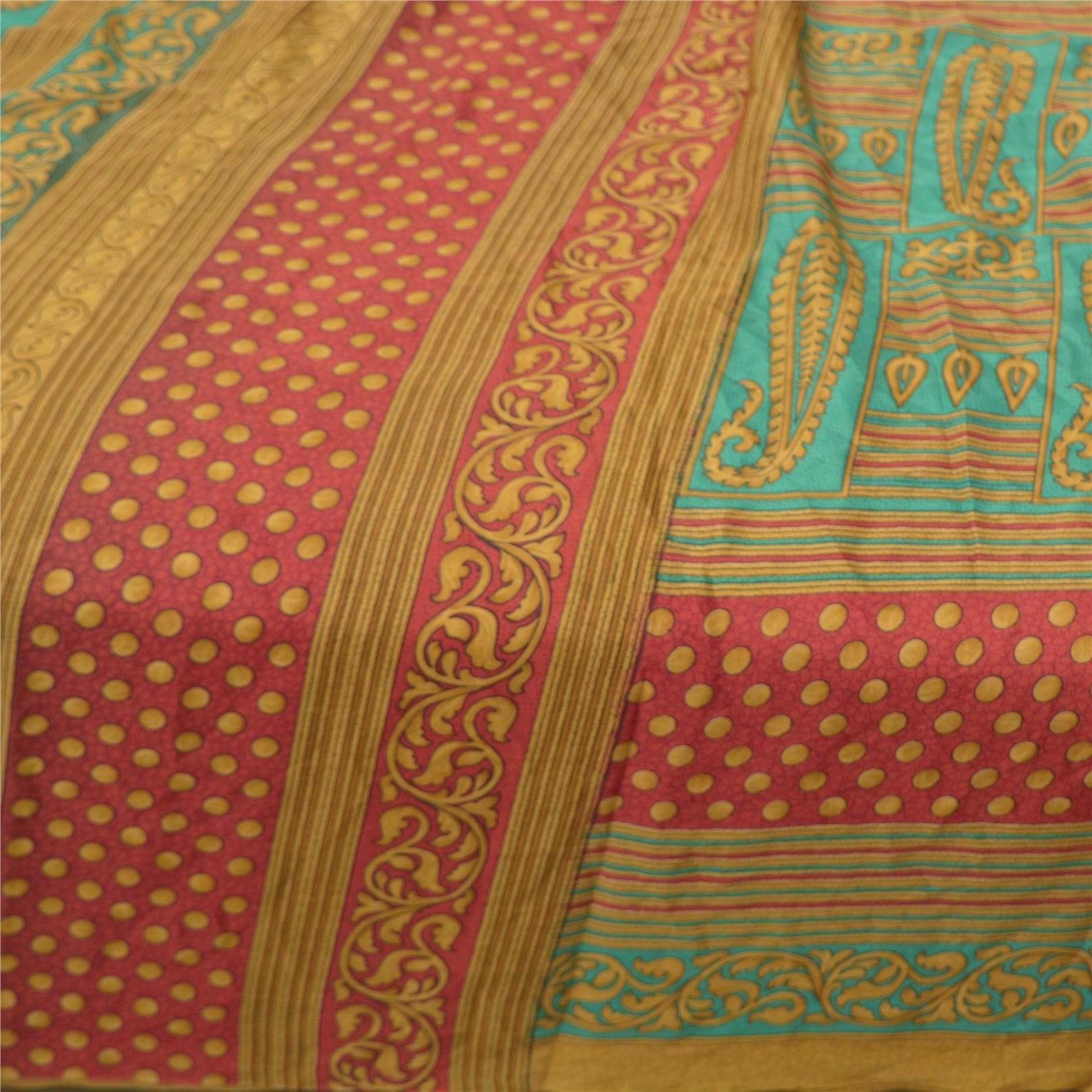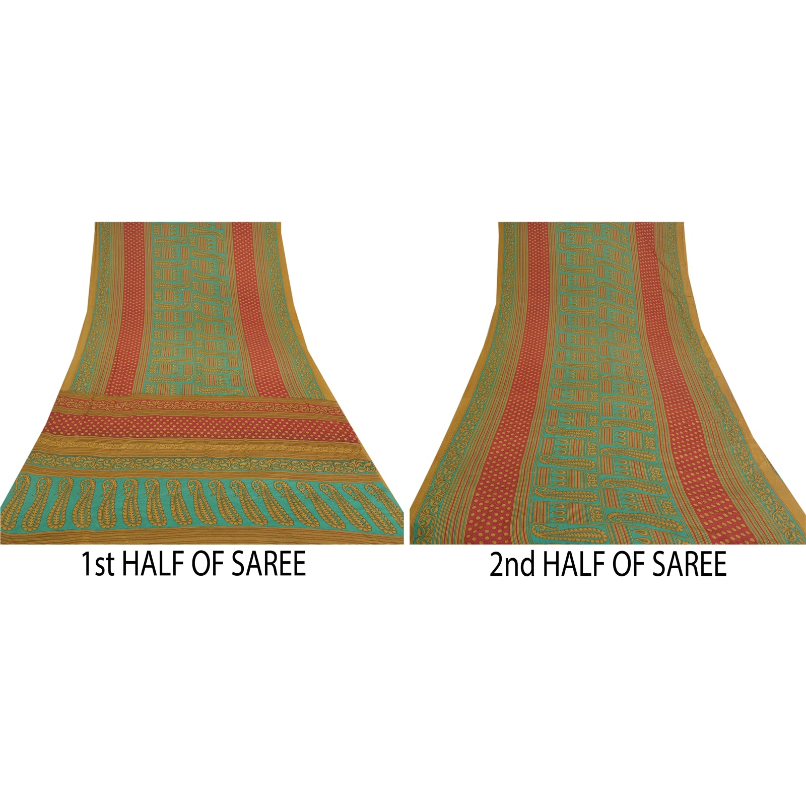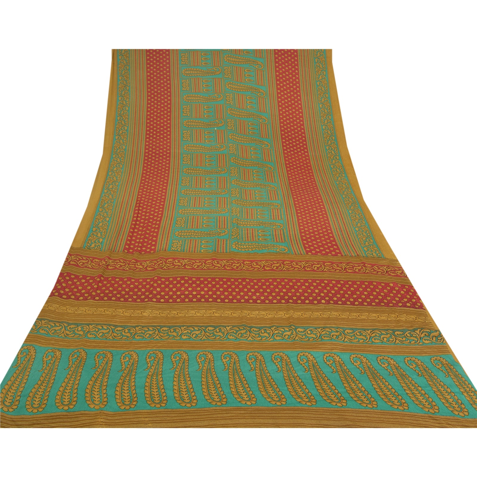 Beautiful green and light brown colored printed moss crepe saree. Pallu & Border has printed floral and paisley design. Paisley and circular design in center part of sari. What is special about this saree? Nice paisley design with extremely smooth moss crepe base fabric is really enhancing the beauty of the saree. This unique vintage saree can be used for various crafting ideas even if you don't want to use it as a sari. Design a dress, use it as a throw, as window dressing, upholstery, sarongs, table linen and much more. Let your creative juices flow and use this decorated fabric in multiple fashion. Please note - Buyers from Australia are required to pay postage. Registered air mail to Australia is temporarily suspended due to the pandemic. Once it goes back to normal we'll revert to free shipping. For now, we are using Aramex and DHL to ship orders. These services are expensive but faster compared to regular mail. Thank you for your support. If you are buying in bulk we will refund whatever excess is left. Contact us after that purchase. For USA buyers - Single item ships via registered air mail, buy 1 more to get FedEx.