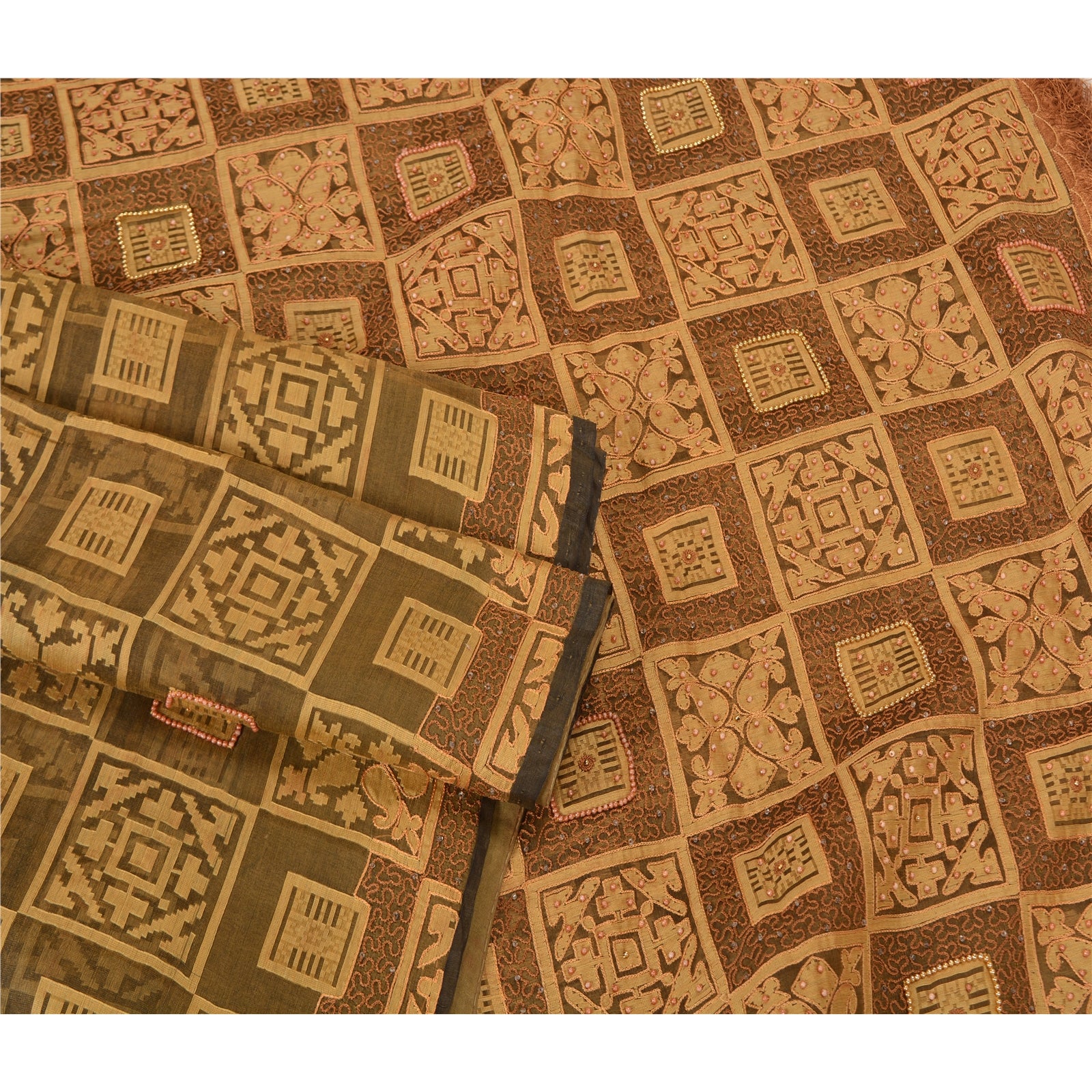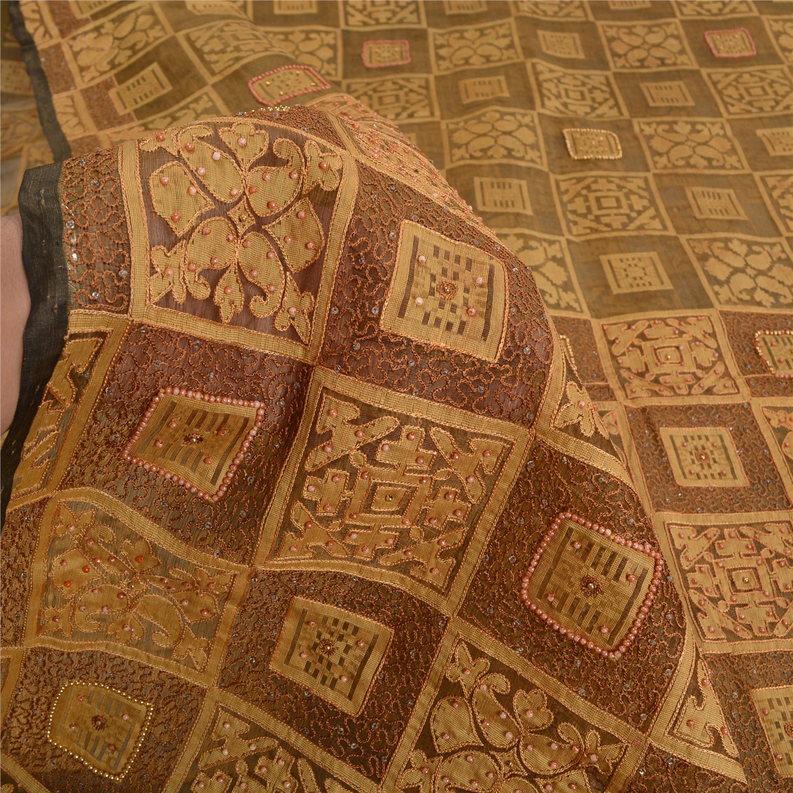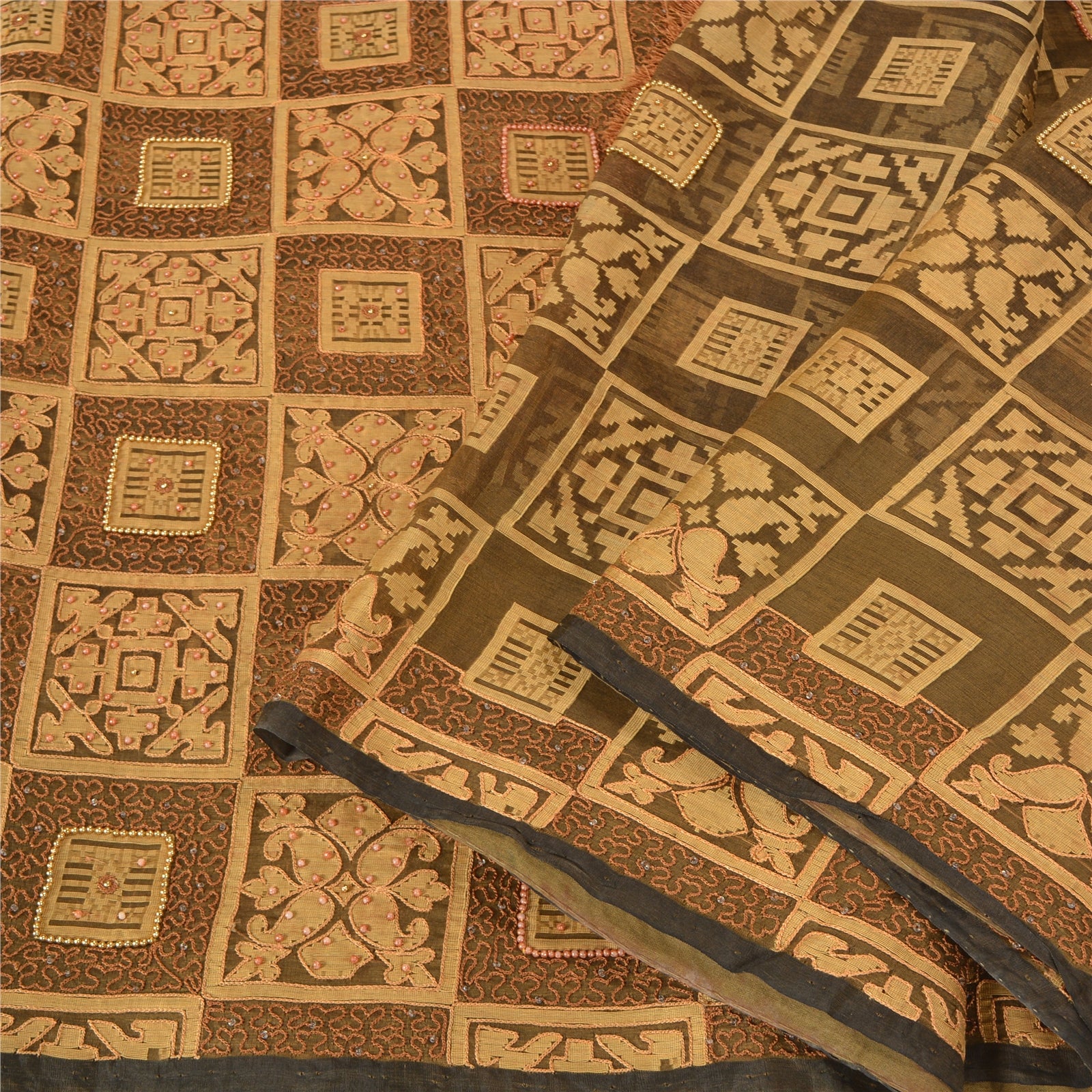 'THE ITEM COLOR OR SHADE MAY BE DARKER OR LIGHTER THAN THE PICTURE.' Beautiful shade of green colored pure organza silk hand embroidered woven sari. Pallu & border features cream woven floral design embroidered with cream/brown thread work, pink pearl like beads, white glass beads, golden beads work. Also you can see matching fringes on pallu. The center of the saree has woven work with thread work. This saree can be used for various crafting ideas too. Use it for dress designing, as a throw, as window dressing, upholstery, table linen and much more. Let your creative juices flow. 'International buyers please note: Import duties, taxes, and charges are not included in the item price or postage cost. These charges are the buyer's responsibility. Please check with your country's customs office to determine what these additional costs will be prior to bidding or buying. Buyer will pay custom duty/tax. It is calculated and charged differently by every country. As a seller I do not have any control over it. VAT or sales tax is calculated by the platform at the time of checkout. Customs charge is payable at the time of delivery.'